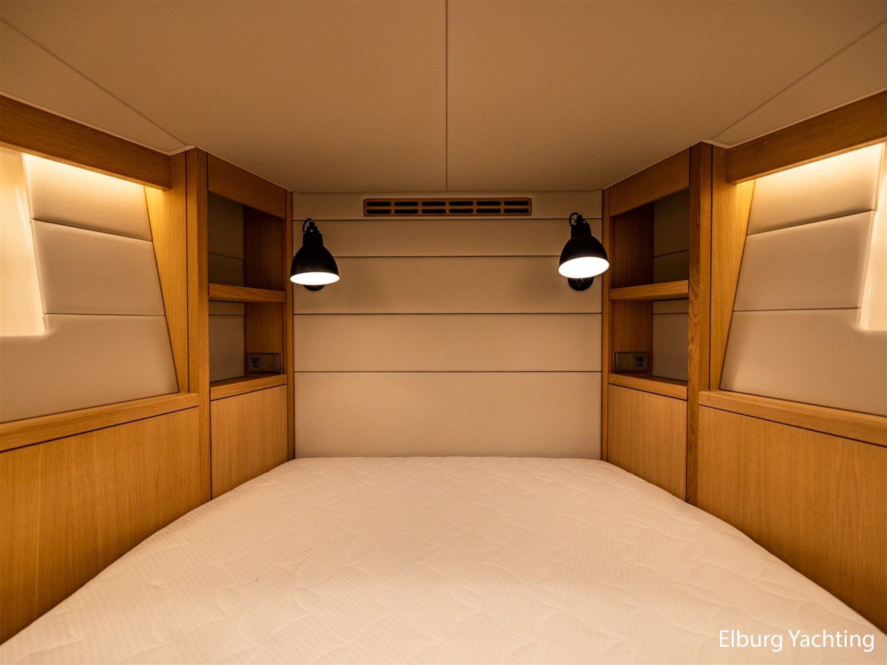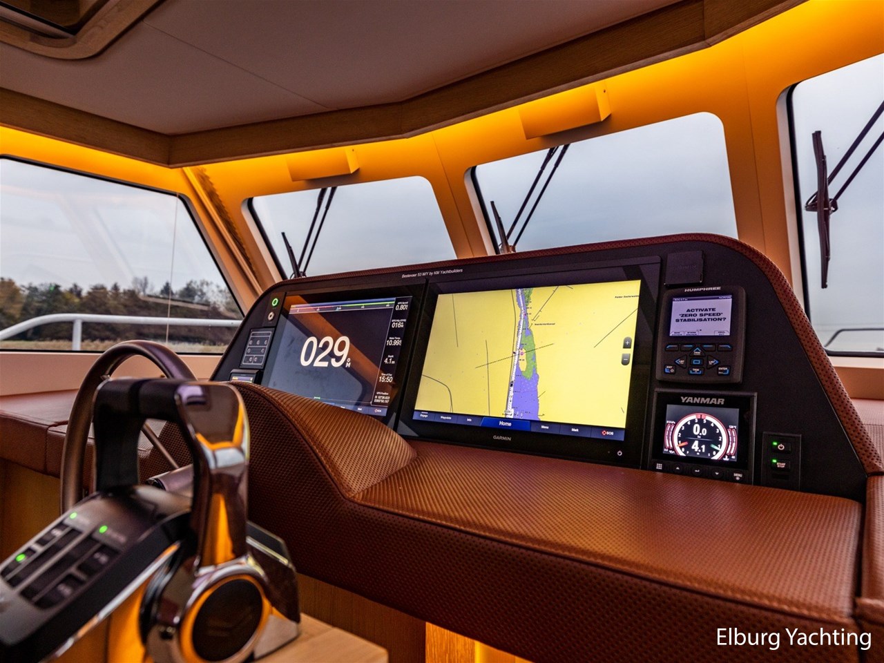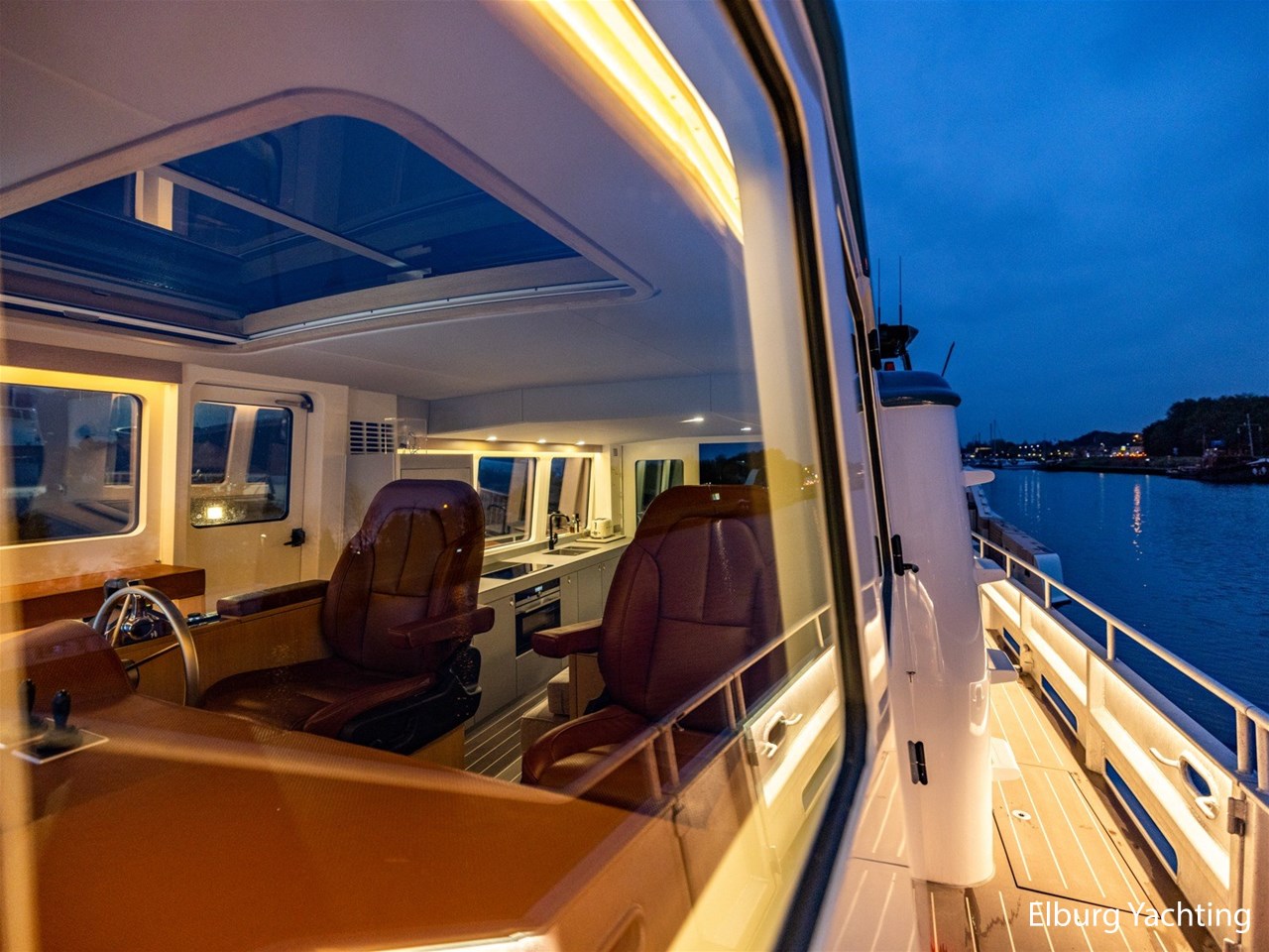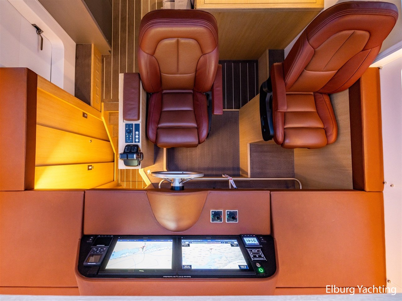 Het jacht wat u ter inspiratie kunt bezichtigen beschikt over : Achterdek en salon gelijkvloers, zij-ingang, elektrisch schuifdak bij stuurhut ( ca. 1.10 x 1.80 m, zij-ingang in reling, grote openslaande deuren naar de kuip om de salon en buitendek, dekdouche met warm/koud water bij zwemplateau, ruime leefomgeving in salon, buiten verlichting op tredes , Garmin navigatiepakket, 2 x 16" scherm, CTCV Camerasysteem voor achterdek en machinekamer, Dockmate - 2 motoren en boegschroef, Humphree interscepter set (4 x) met roll en pitch demping software + carbon vinnen, 4 x zonnepanelen op het achterdak, Fusion radio + 2 x speakers salon en 2 x cockpit (iPhone compatible), Miele was-droogcombinatie. Siemens vaatwasser, Ocean Air horren in eigenaar hut bij dekluik, shades/gordijnen in salon, lederen bekleding van de dashboardunit, elektrische lift voor vaarstoel- en passagiersstoel voor optimaal zicht, Lampe Gras zwarte design lampen, Frost zwarte douche armaturen, elektrische lift voor eettafel om te transformeren naar salon/lounge tafel, Kvadrat bekleding, geïntegreerde aluminium bolders, aluminium tredeplaat in voorroef, Aluminium geïntegreerde trap naar dak op bovenbouw, machinekamer akoestisch geïsoleerd, 3 x ruitenwissers met sproeisysteem. Lewmar dekluiken, Marlan tops, douche en toilet gescheiden voor gastenhut, Prebit leeslampjes, met USB aansluiting en dimbaar, Prebit plafondlampen dimbaar in rood/wit, Flatscreen 43" TV + lift, verborgen in salon rugleuning. In exclusieve samenwerking met Yachtfull International.