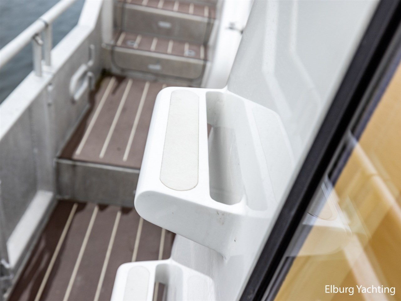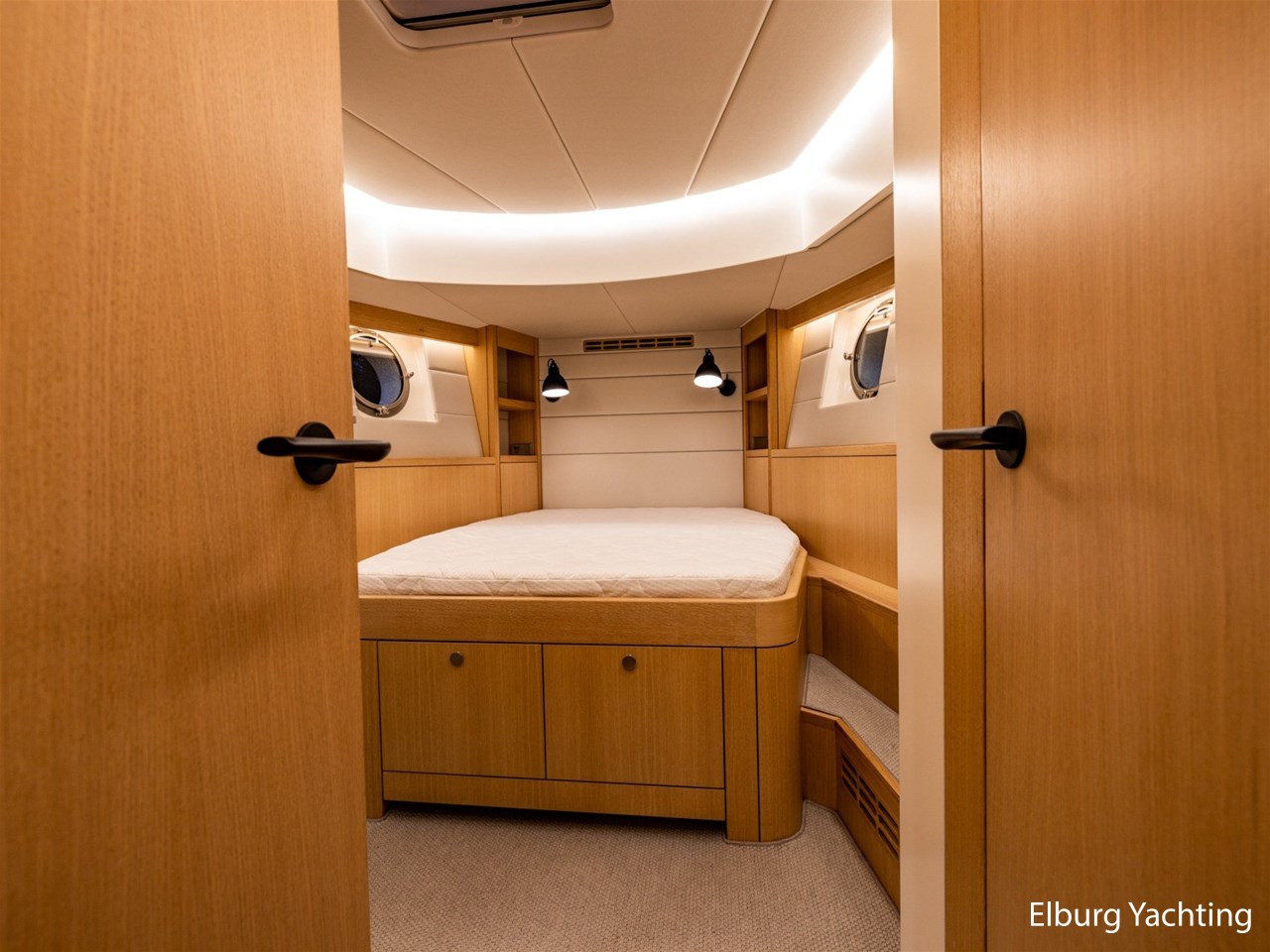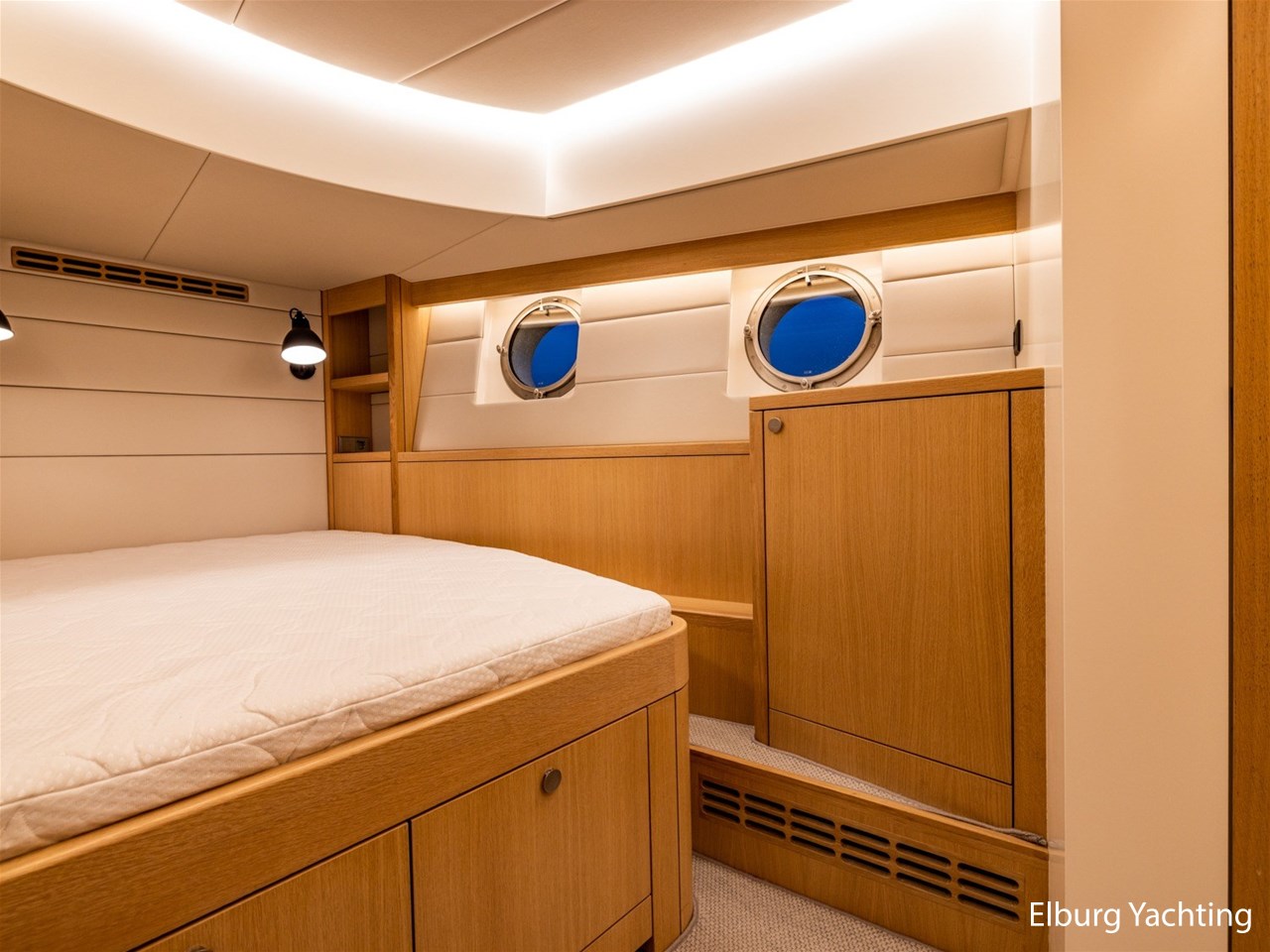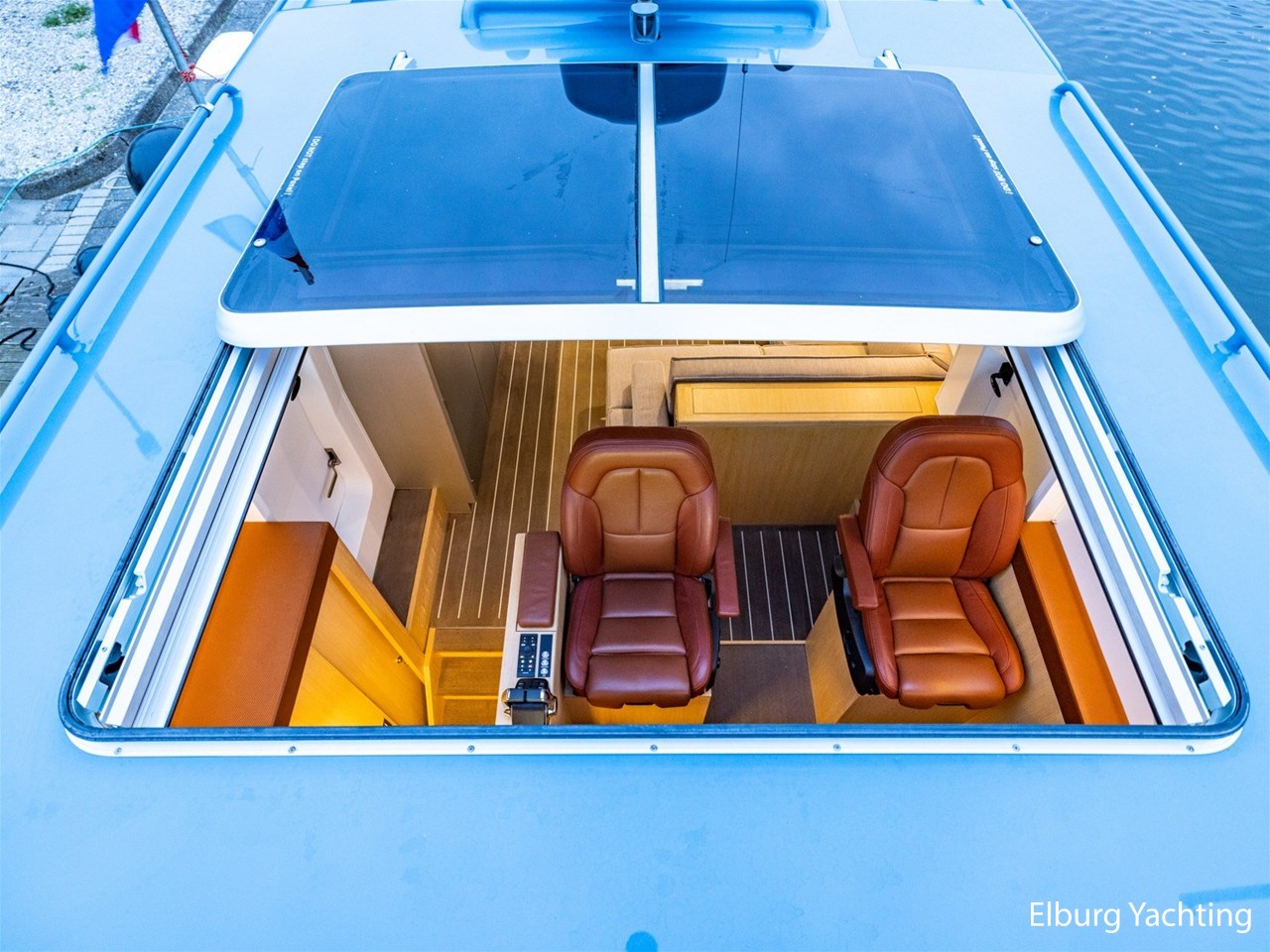 Het jacht wat u ter inspiratie kunt bezichtigen beschikt over : Achterdek en salon gelijkvloers, zij-ingang, elektrisch schuifdak bij stuurhut ( ca. 1.10 x 1.80 m, zij-ingang in reling, grote openslaande deuren naar de kuip om de salon en buitendek, dekdouche met warm/koud water bij zwemplateau, ruime leefomgeving in salon, buiten verlichting op tredes , Garmin navigatiepakket, 2 x 16" scherm, CTCV Camerasysteem voor achterdek en machinekamer, Dockmate - 2 motoren en boegschroef, Humphree interscepter set (4 x) met roll en pitch demping software + carbon vinnen, 4 x zonnepanelen op het achterdak, Fusion radio + 2 x speakers salon en 2 x cockpit (iPhone compatible), Miele was-droogcombinatie. Siemens vaatwasser, Ocean Air horren in eigenaar hut bij dekluik, shades/gordijnen in salon, lederen bekleding van de dashboardunit, elektrische lift voor vaarstoel- en passagiersstoel voor optimaal zicht, Lampe Gras zwarte design lampen, Frost zwarte douche armaturen, elektrische lift voor eettafel om te transformeren naar salon/lounge tafel, Kvadrat bekleding, geïntegreerde aluminium bolders, aluminium tredeplaat in voorroef, Aluminium geïntegreerde trap naar dak op bovenbouw, machinekamer akoestisch geïsoleerd, 3 x ruitenwissers met sproeisysteem. Lewmar dekluiken, Marlan tops, douche en toilet gescheiden voor gastenhut, Prebit leeslampjes, met USB aansluiting en dimbaar, Prebit plafondlampen dimbaar in rood/wit, Flatscreen 43" TV + lift, verborgen in salon rugleuning. In exclusieve samenwerking met Yachtfull International.