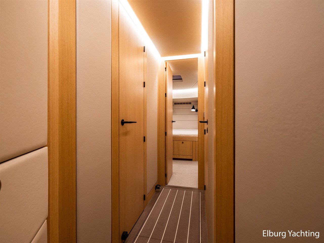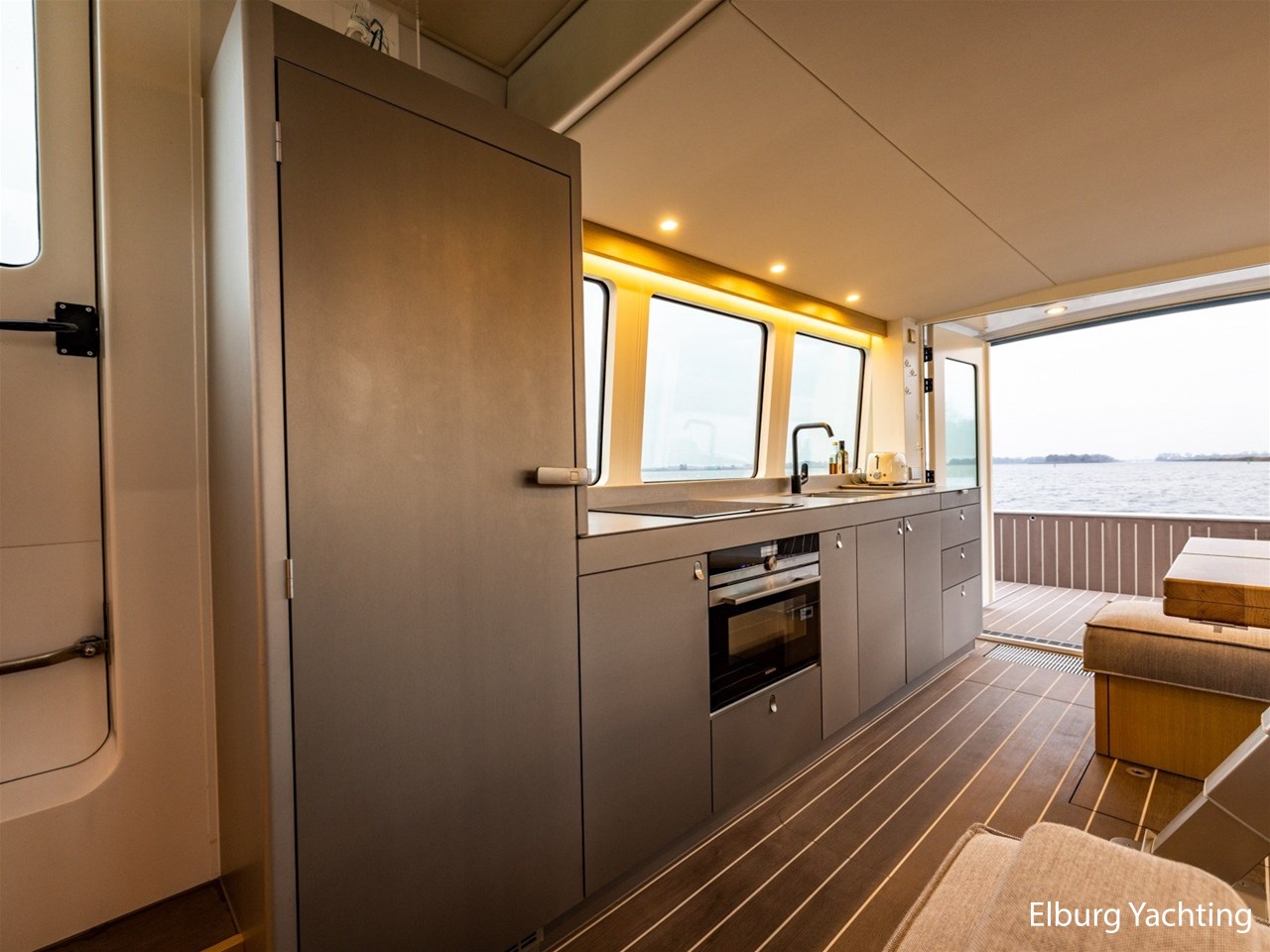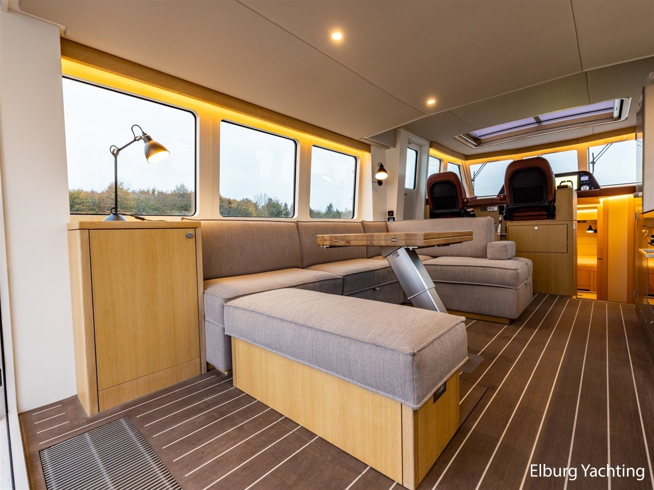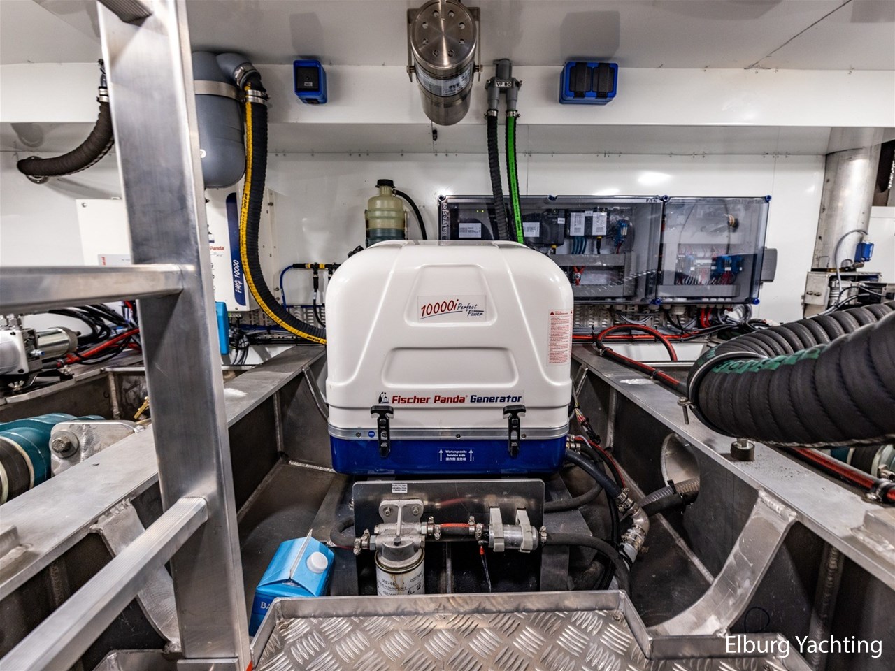 Het jacht wat u ter inspiratie kunt bezichtigen beschikt over : Achterdek en salon gelijkvloers, zij-ingang, elektrisch schuifdak bij stuurhut ( ca. 1.10 x 1.80 m, zij-ingang in reling, grote openslaande deuren naar de kuip om de salon en buitendek, dekdouche met warm/koud water bij zwemplateau, ruime leefomgeving in salon, buiten verlichting op tredes , Garmin navigatiepakket, 2 x 16" scherm, CTCV Camerasysteem voor achterdek en machinekamer, Dockmate - 2 motoren en boegschroef, Humphree interscepter set (4 x) met roll en pitch demping software + carbon vinnen, 4 x zonnepanelen op het achterdak, Fusion radio + 2 x speakers salon en 2 x cockpit (iPhone compatible), Miele was-droogcombinatie. Siemens vaatwasser, Ocean Air horren in eigenaar hut bij dekluik, shades/gordijnen in salon, lederen bekleding van de dashboardunit, elektrische lift voor vaarstoel- en passagiersstoel voor optimaal zicht, Lampe Gras zwarte design lampen, Frost zwarte douche armaturen, elektrische lift voor eettafel om te transformeren naar salon/lounge tafel, Kvadrat bekleding, geïntegreerde aluminium bolders, aluminium tredeplaat in voorroef, Aluminium geïntegreerde trap naar dak op bovenbouw, machinekamer akoestisch geïsoleerd, 3 x ruitenwissers met sproeisysteem. Lewmar dekluiken, Marlan tops, douche en toilet gescheiden voor gastenhut, Prebit leeslampjes, met USB aansluiting en dimbaar, Prebit plafondlampen dimbaar in rood/wit, Flatscreen 43" TV + lift, verborgen in salon rugleuning. In exclusieve samenwerking met Yachtfull International.