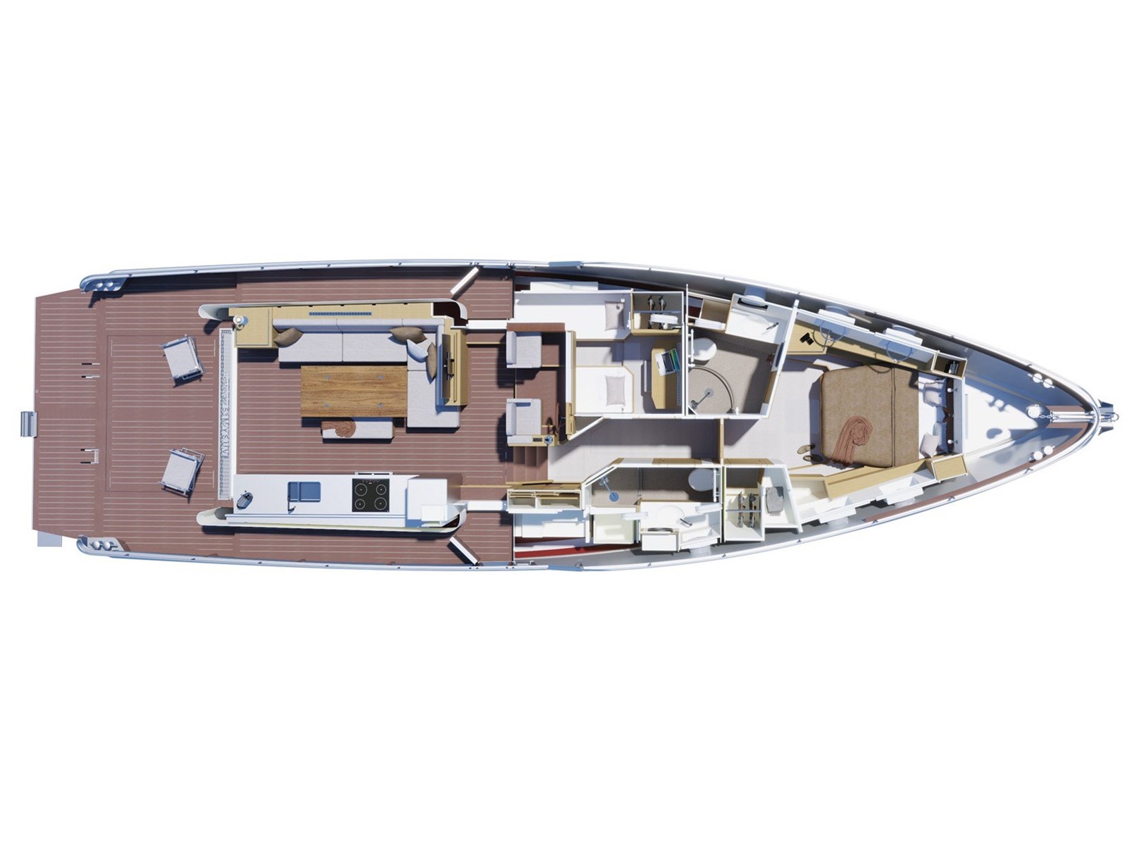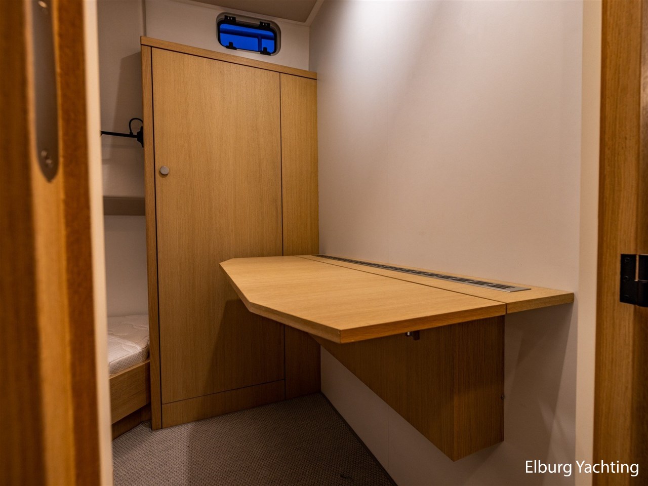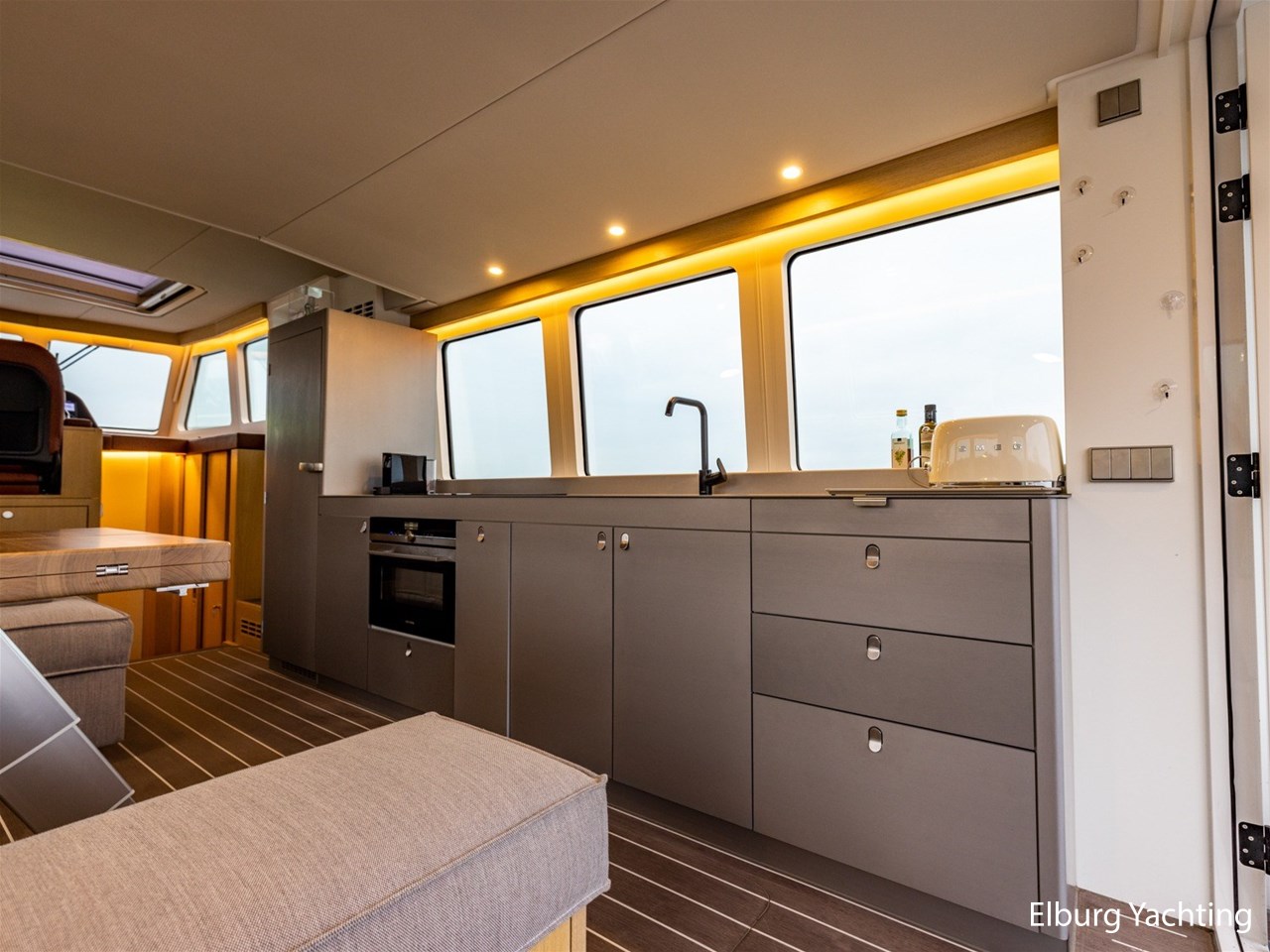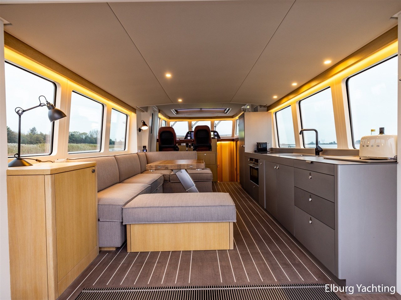 Het jacht wat u ter inspiratie kunt bezichtigen beschikt over : Achterdek en salon gelijkvloers, zij-ingang, elektrisch schuifdak bij stuurhut ( ca. 1.10 x 1.80 m, zij-ingang in reling, grote openslaande deuren naar de kuip om de salon en buitendek, dekdouche met warm/koud water bij zwemplateau, ruime leefomgeving in salon, buiten verlichting op tredes , Garmin navigatiepakket, 2 x 16" scherm, CTCV Camerasysteem voor achterdek en machinekamer, Dockmate - 2 motoren en boegschroef, Humphree interscepter set (4 x) met roll en pitch demping software + carbon vinnen, 4 x zonnepanelen op het achterdak, Fusion radio + 2 x speakers salon en 2 x cockpit (iPhone compatible), Miele was-droogcombinatie. Siemens vaatwasser, Ocean Air horren in eigenaar hut bij dekluik, shades/gordijnen in salon, lederen bekleding van de dashboardunit, elektrische lift voor vaarstoel- en passagiersstoel voor optimaal zicht, Lampe Gras zwarte design lampen, Frost zwarte douche armaturen, elektrische lift voor eettafel om te transformeren naar salon/lounge tafel, Kvadrat bekleding, geïntegreerde aluminium bolders, aluminium tredeplaat in voorroef, Aluminium geïntegreerde trap naar dak op bovenbouw, machinekamer akoestisch geïsoleerd, 3 x ruitenwissers met sproeisysteem. Lewmar dekluiken, Marlan tops, douche en toilet gescheiden voor gastenhut, Prebit leeslampjes, met USB aansluiting en dimbaar, Prebit plafondlampen dimbaar in rood/wit, Flatscreen 43" TV + lift, verborgen in salon rugleuning. In exclusieve samenwerking met Yachtfull International.