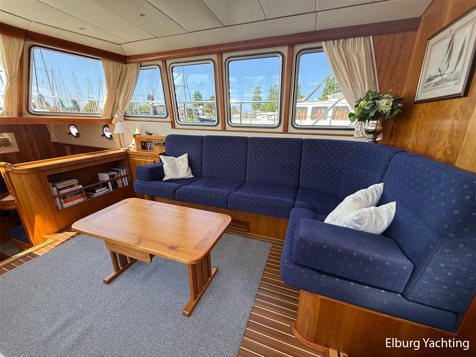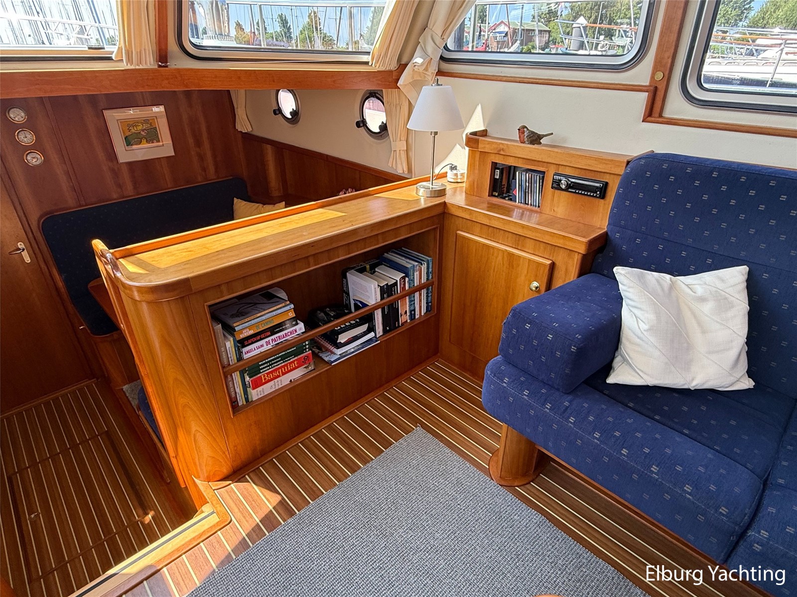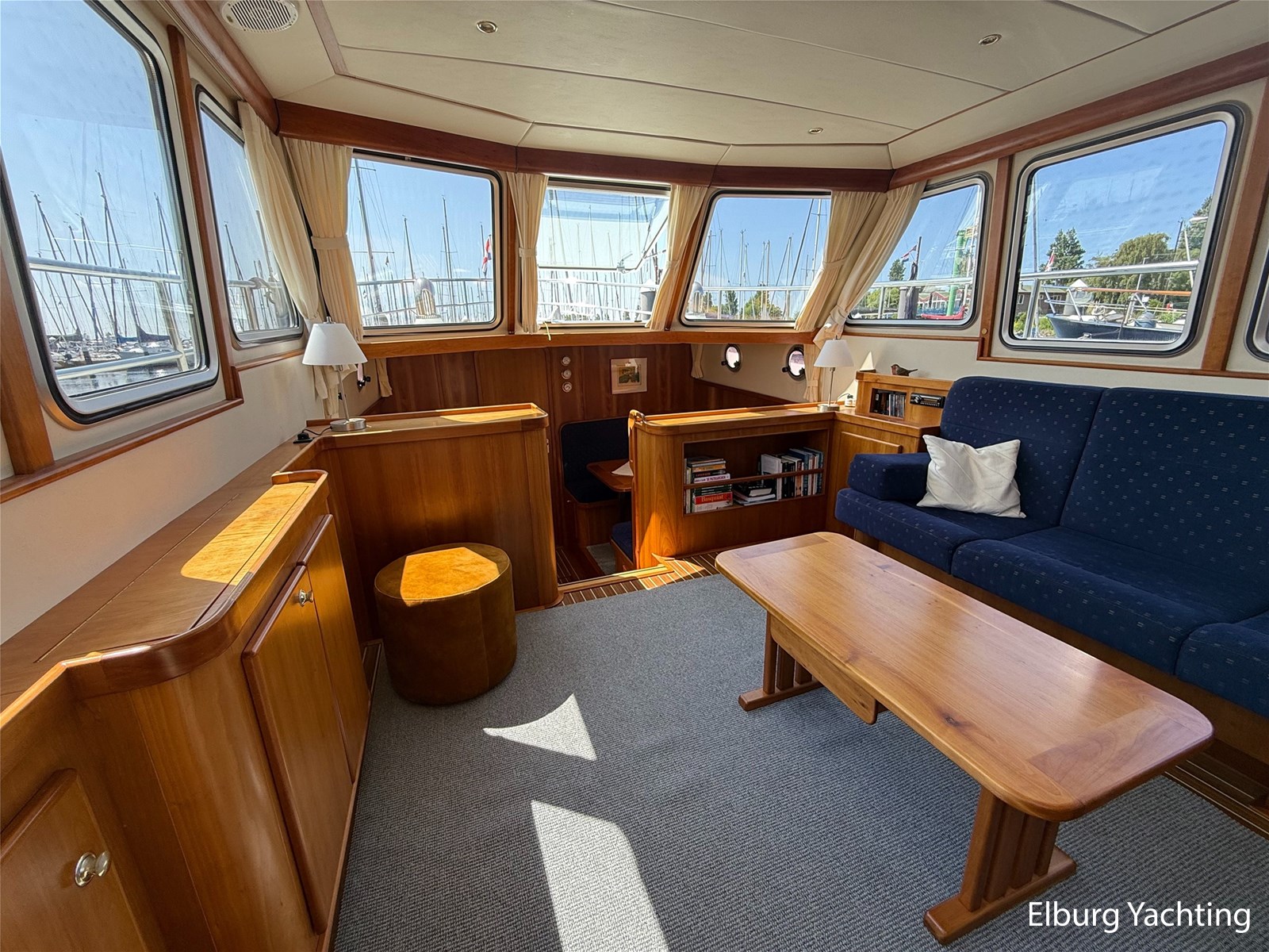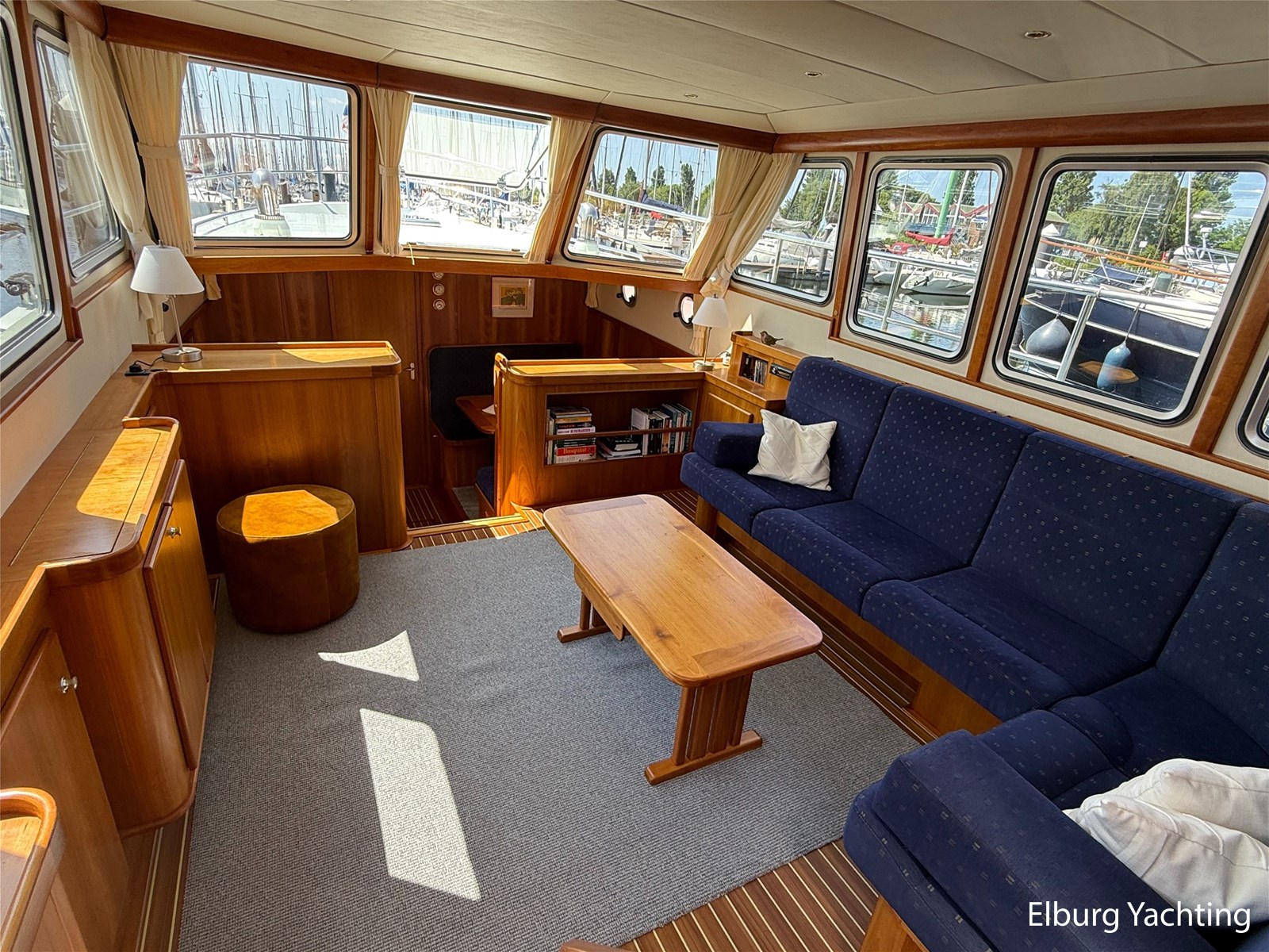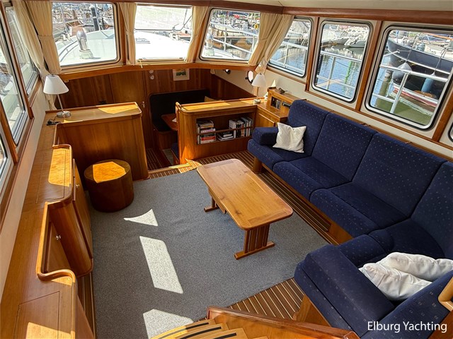 - Goed geïsoleerd met scheeps kersenhoutenbetimmering in combinatie met Teakhouten holly vloer en blauwe bekleding