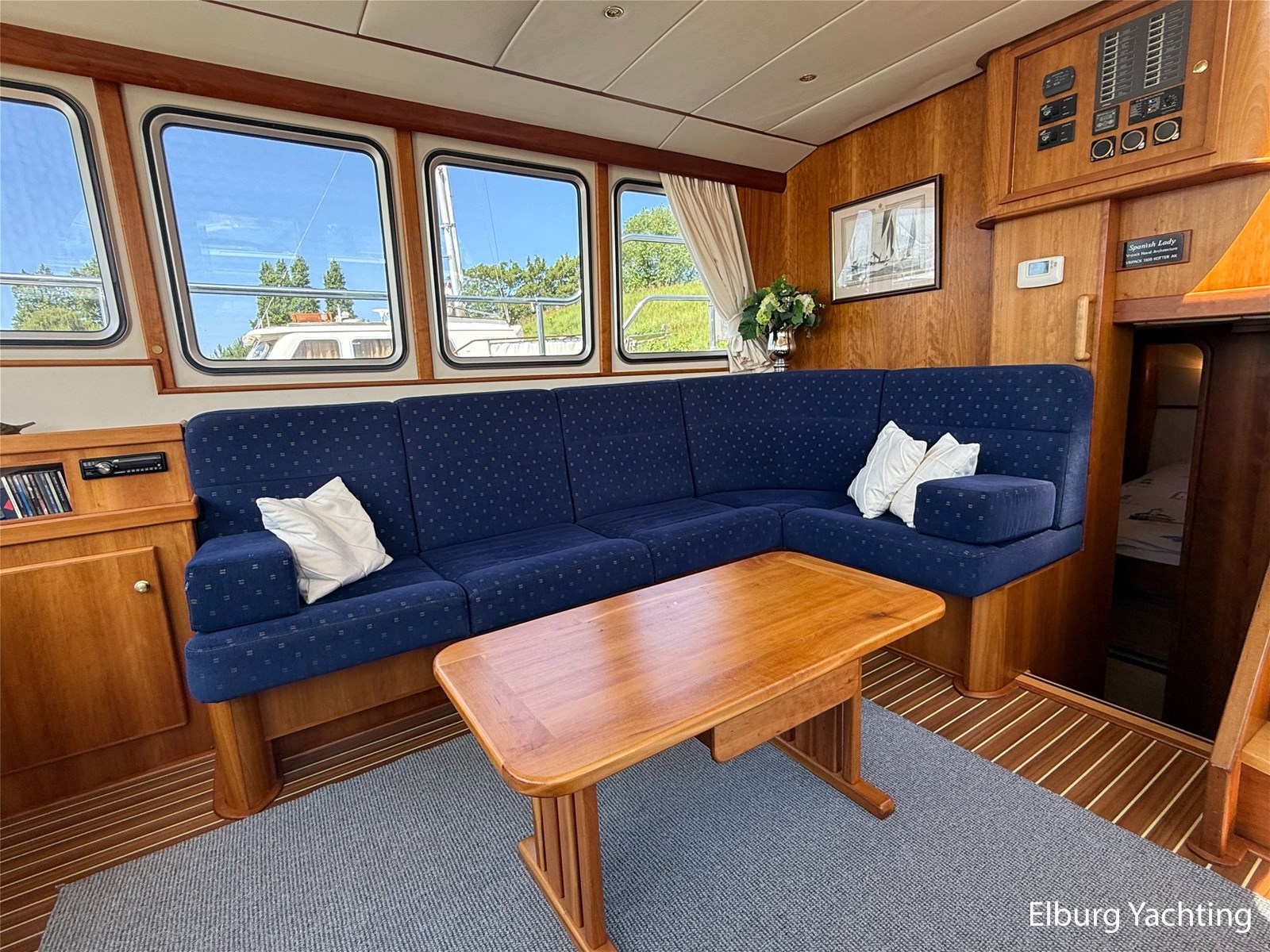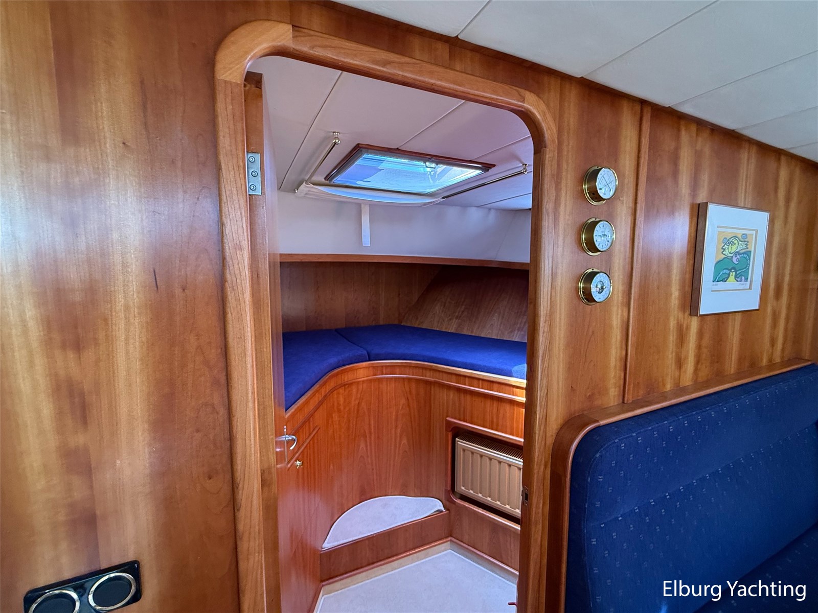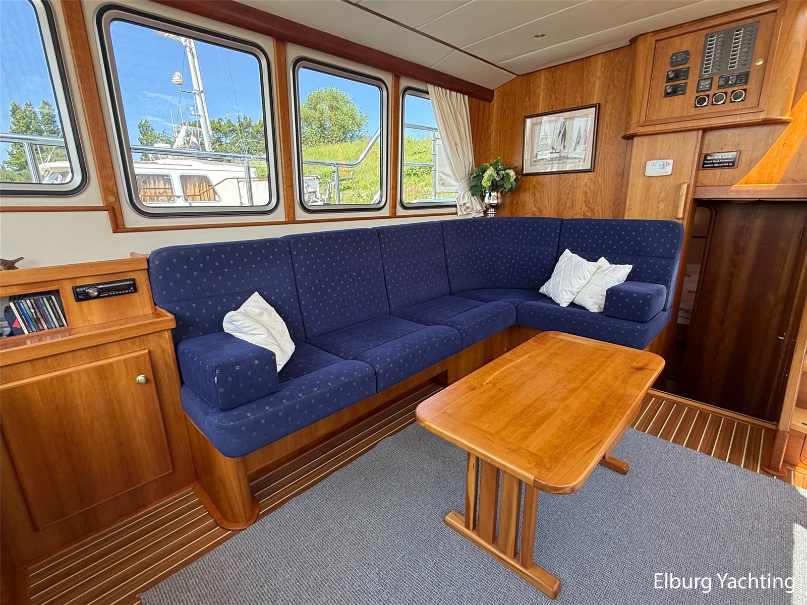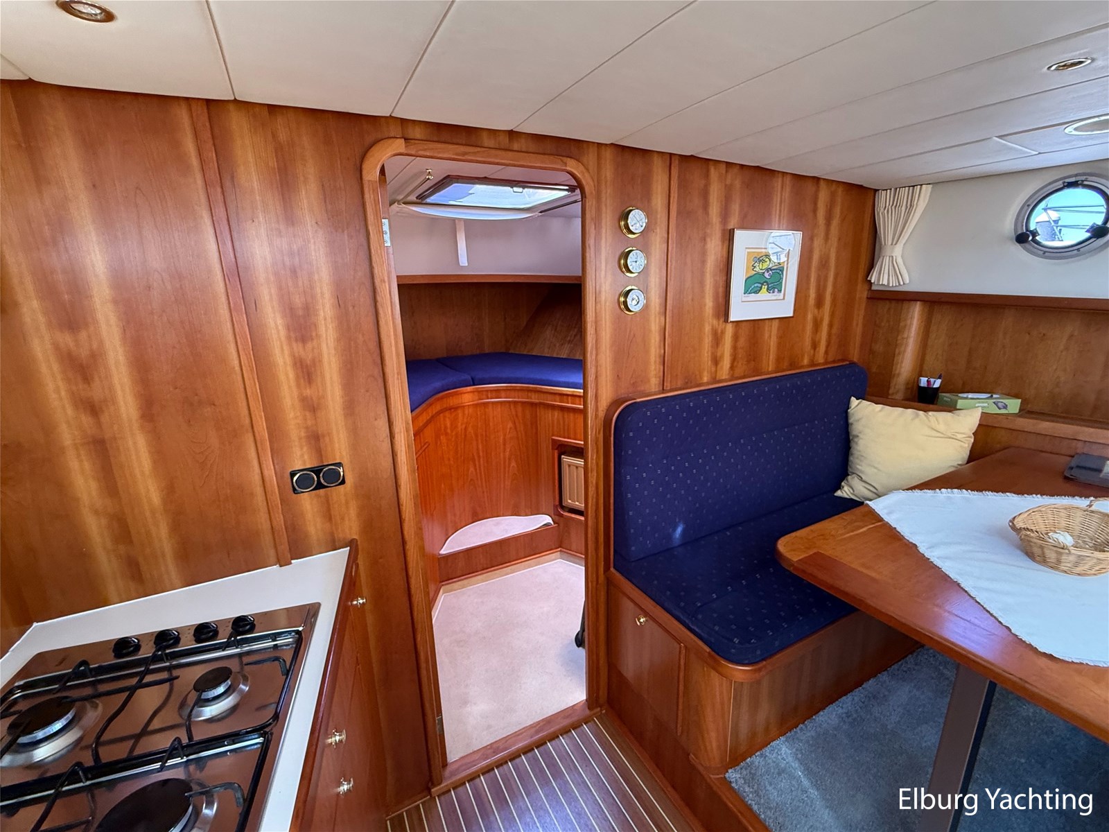 - Goed geïsoleerd met scheeps kersenhoutenbetimmering in combinatie met Teakhouten holly vloer en blauwe bekleding