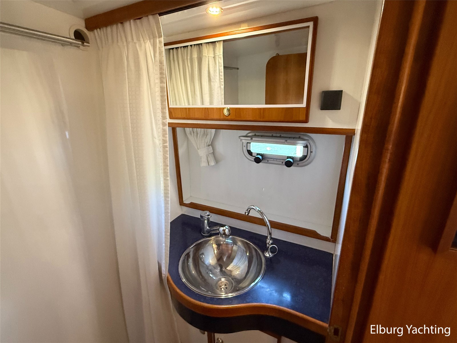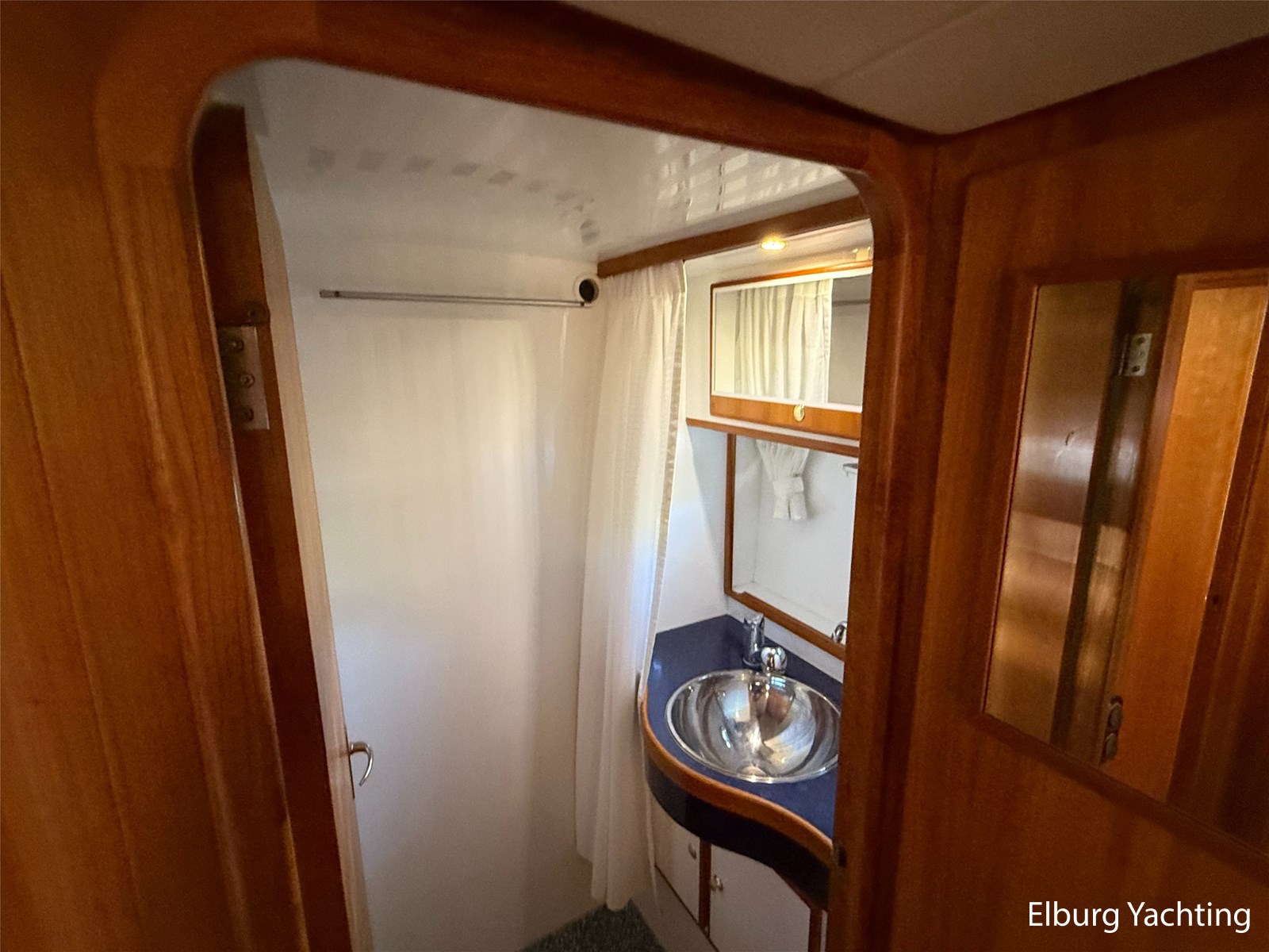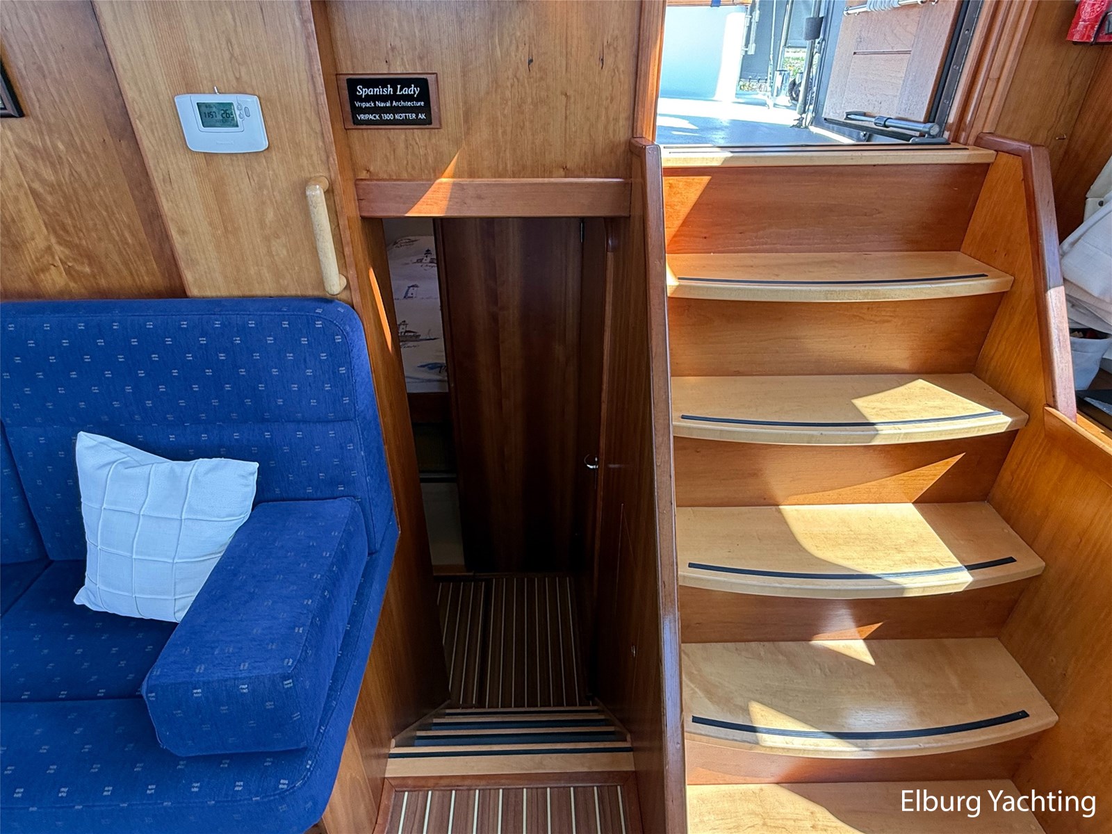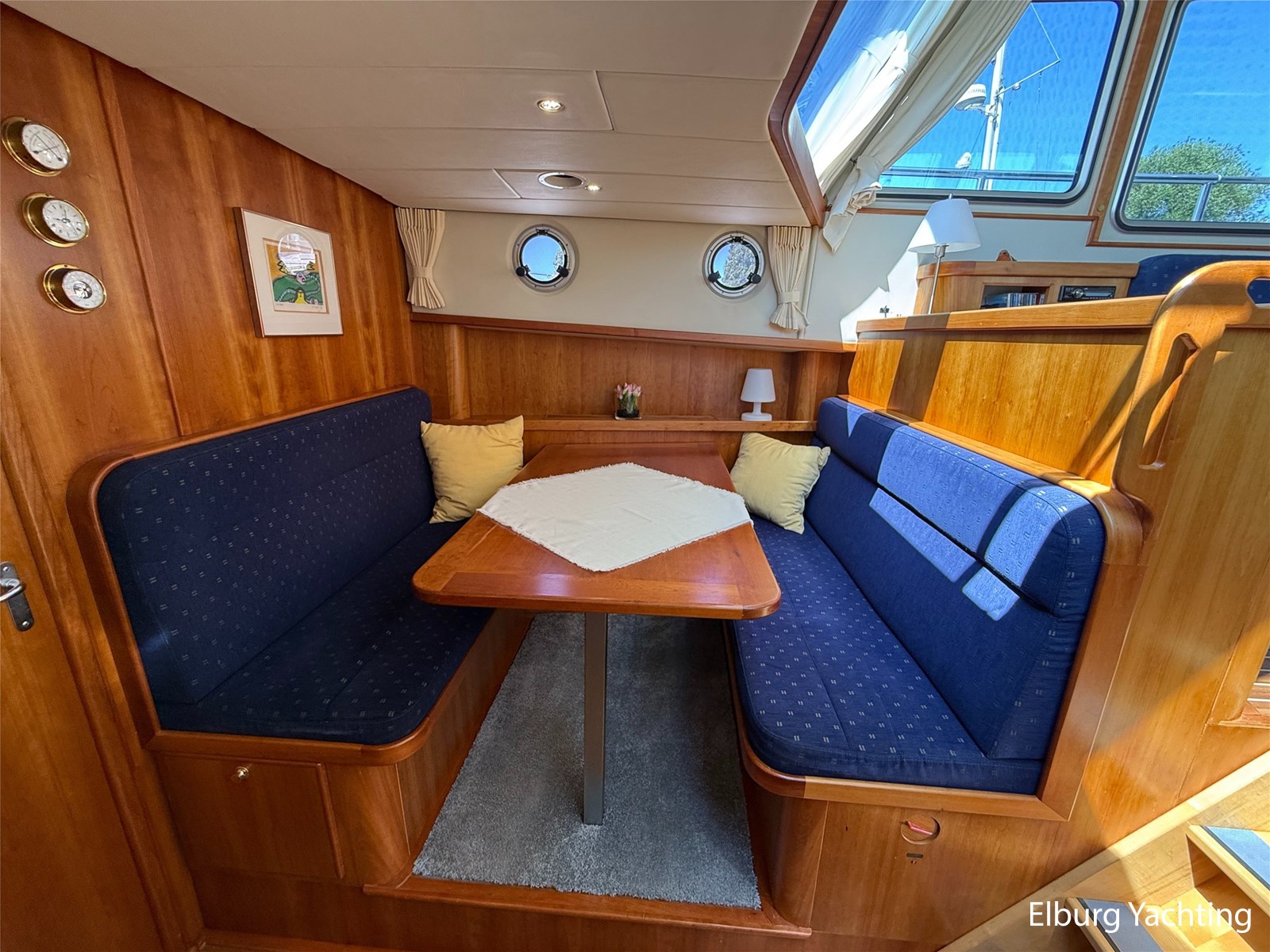 - Goed geïsoleerd met scheeps kersenhoutenbetimmering in combinatie met Teakhouten holly vloer en blauwe bekleding