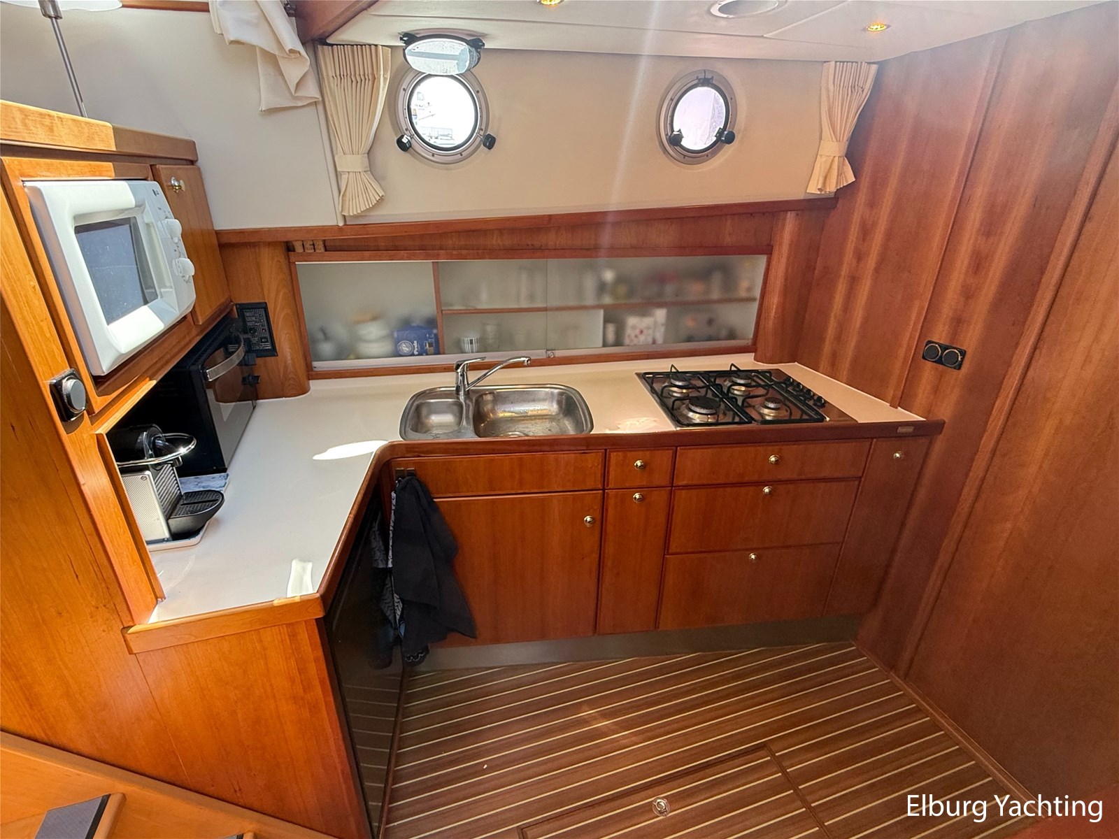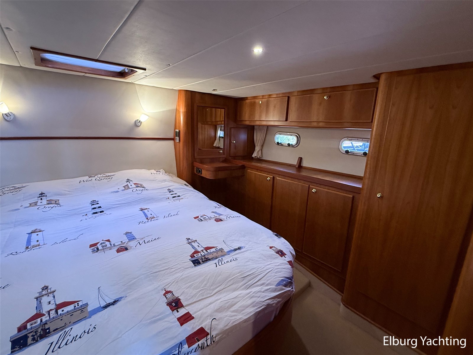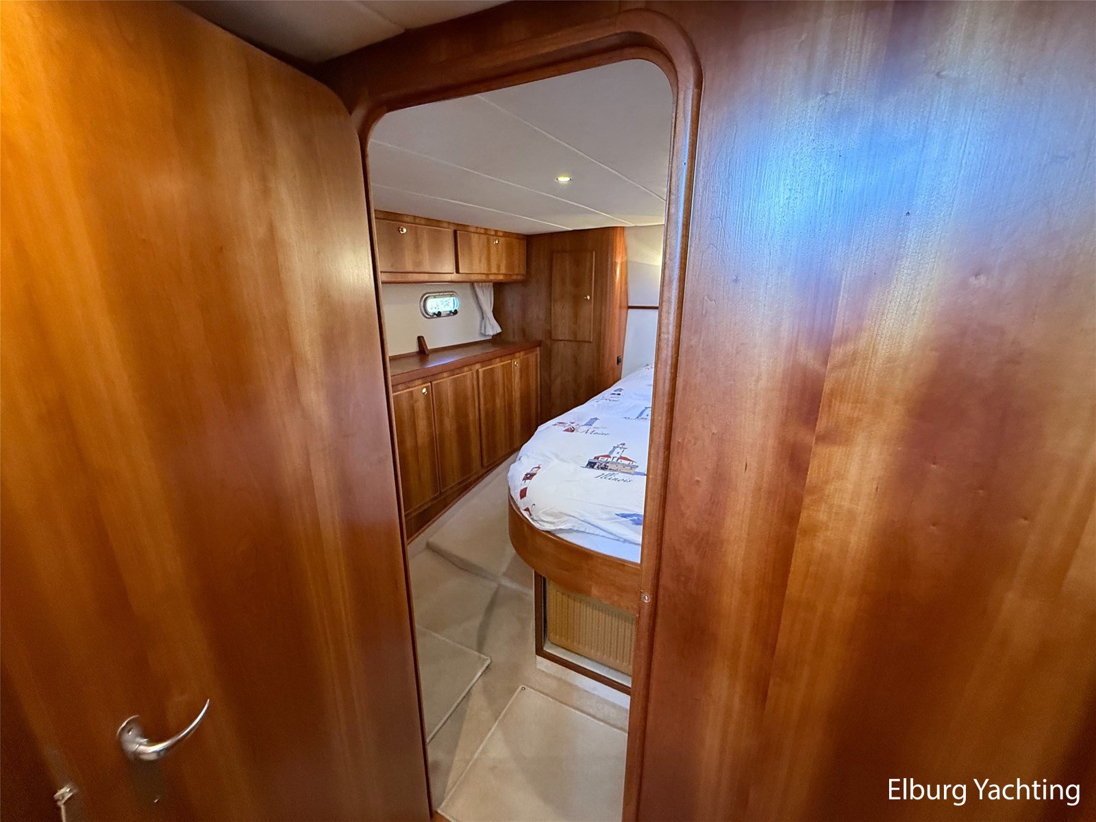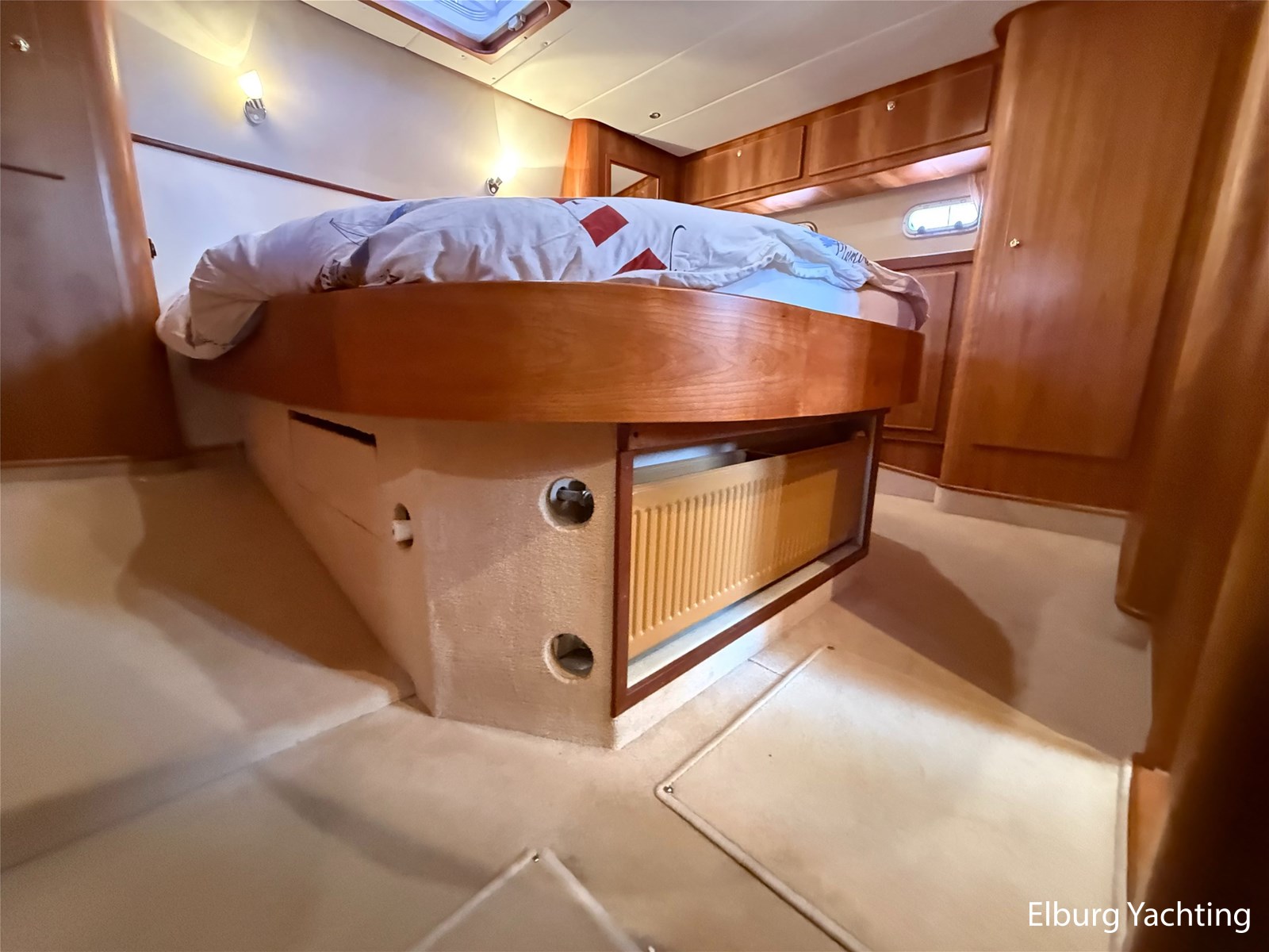 - Goed geïsoleerd met scheeps kersenhoutenbetimmering in combinatie met Teakhouten holly vloer en blauwe bekleding