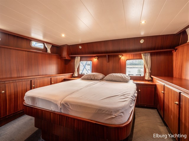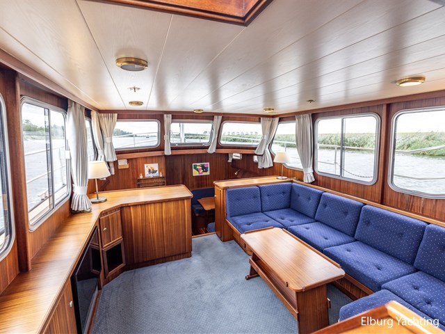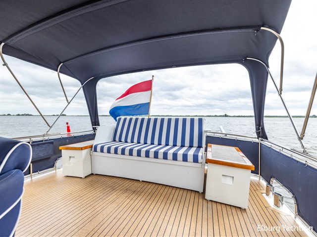 Strakke, goed verzorgde en degelijk gebouwde Privateer 40 XL gebouwd te Privateer Yachts in Uitwellingerga. Rondom is de Privateer 40 XL voorzien van een degelijk dek gemaakt van kurk. Rondom is er niet bezuinigd op de Privateer. Zo valt onder andere de dubbel uitgevoerde r.v.s. zeerailing op alsook de r.v.s. potdeksels. De gangboorden zijn zeer royaal waardoor u zich gemakkelijk verplaatst aan boord. De Privateer 40 XL beschikt over een zeer ruime open kuip, waar zich ook de vaste stuurstand bevindt. De open kuip verbindt zich met de salon via een riante trap. De salon bestaat uit prachtig mahony houten interieur met nette blauwe kussens, te openen ramen aan bak- en stuurboord en een het middelste raam aan de voorzijde kan ook opengeklapt worden. De eigenaarshut is erg royaal uitgevoerd en beschikt over een riant Frans bed, veel opbergruimte, airconditioning en meerdere te openen ramen met muggenhorren. De Privateer 40 XL beschikt over een ruime natte cel met eigen douchecabine en twee aparte elektrische toiletten, luxe 2 persoons vaarstoel bij stuurstand, veel opbergmogelijkheden aan dek in de verschillende bakskisten, volledig afluitbare tent rondom gehele achterdek, klapbare ramen voor lage kruiphoogte, dekwaspomp, 2 x raam in spiegel, Candy wasmachine 120ES.