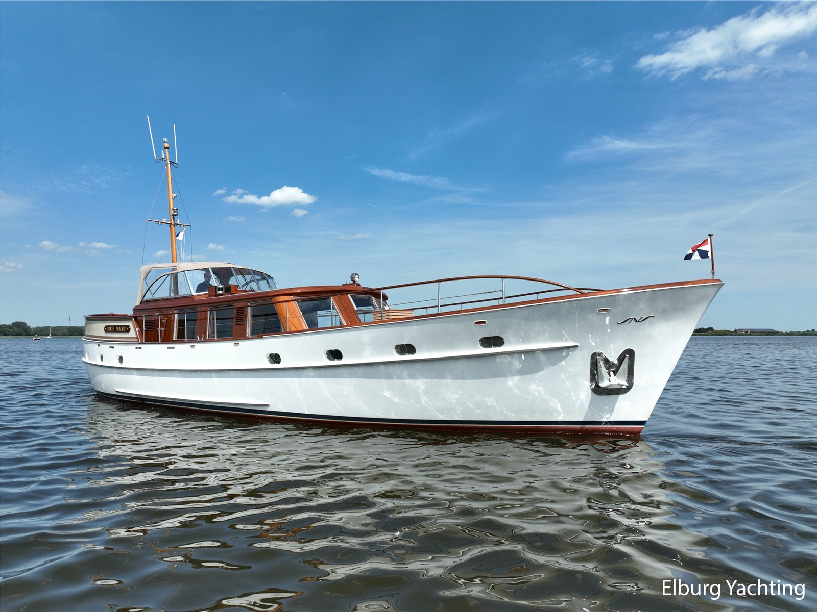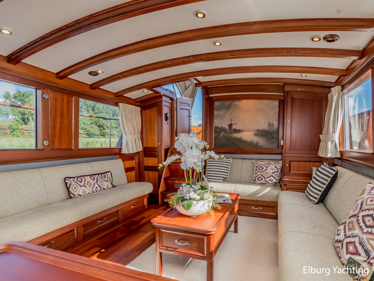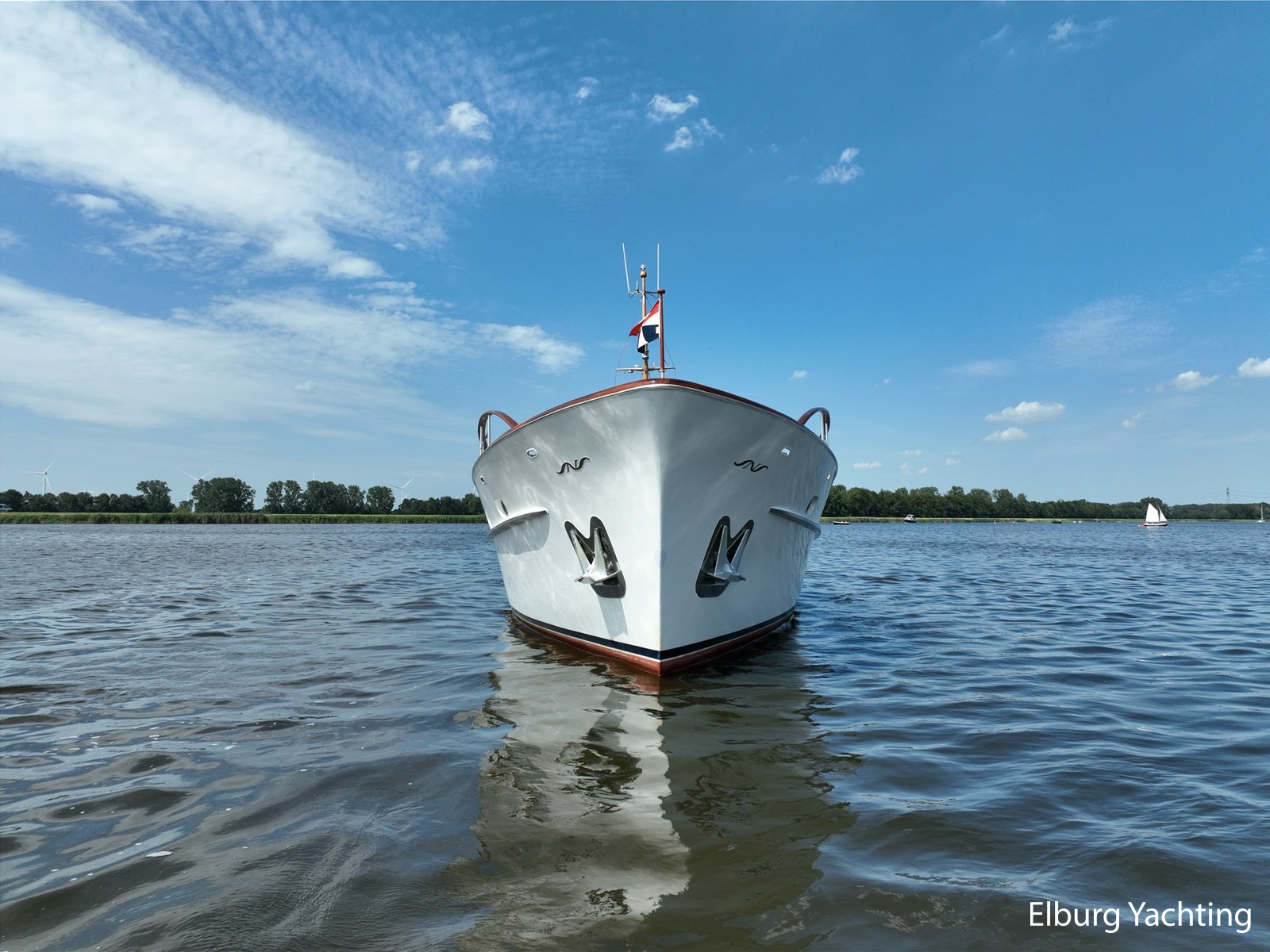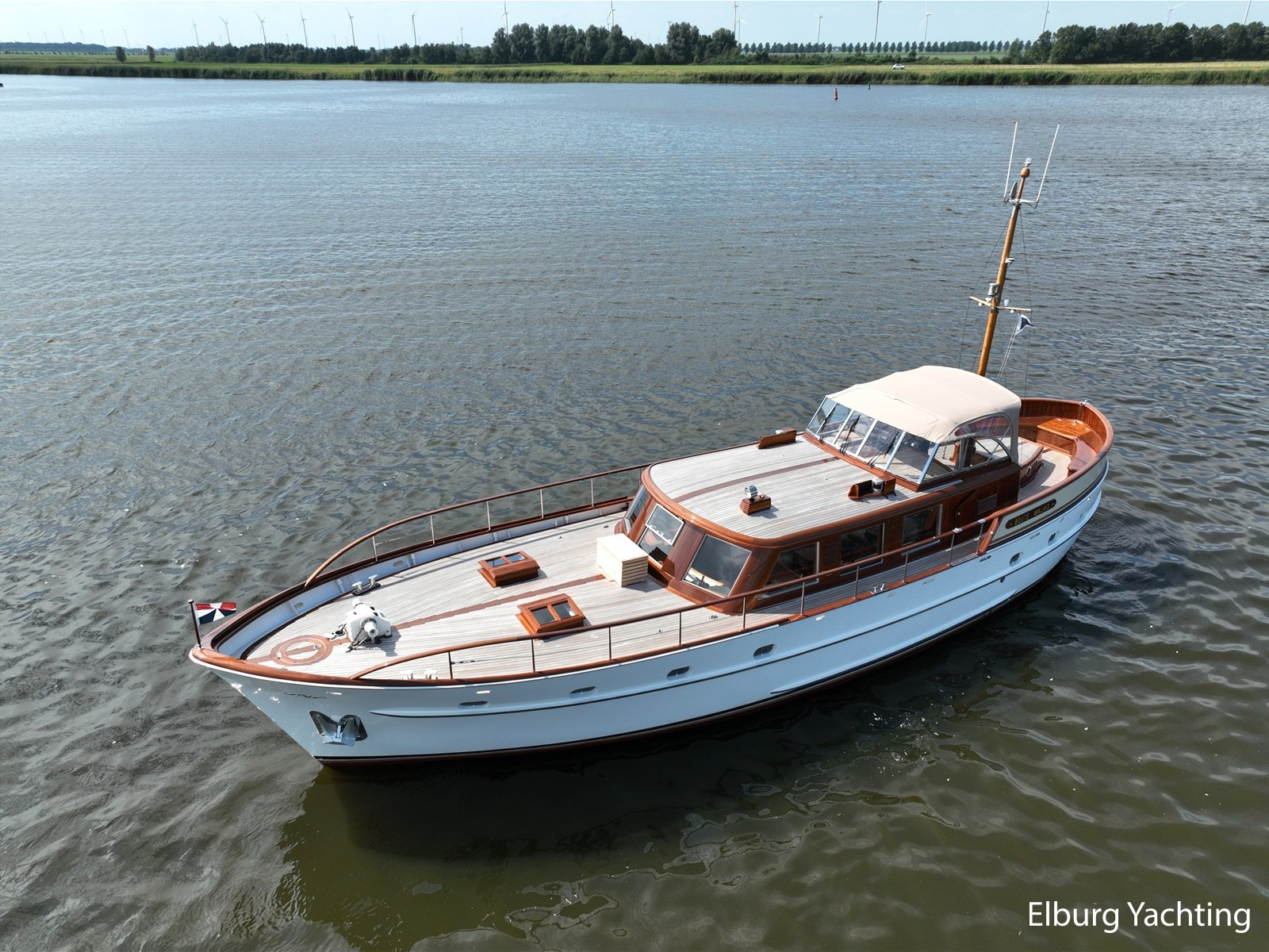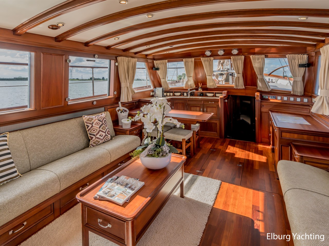 De Lunstroo 56 - (Total Refit 2015) is een stuk maritieme geschiedenis en zonder twijfel een van de meest in het oog springende kotterjachten die rondvaart. Het schip is gelanceerd in 1974, maar heeft in 2015 een volledige refit ondergaan op bij Nicolaas Witsen, waar kosten nog moeite zijn gespaard. Het schip heeft 2 nieuwe Perkins motoren gekregen, welke bekend staan om het lage toerental en laag geluidsniveau. Tijdens de refit is o.a. het volgende uitgevoerd : Nieuw massief teakdek (22 mm), nieuw teak kajuitdak (15 mm), Alle gelakte teakhout elementen van de kajuitopbouw zijn nieuw vervaardigd, verchroomde patrijspoorten, nieuw verpakte raamframes, de gehele elektrische installatie is vernieuwd incl. pompen en andere apparaten, nieuwe navigatieapparatuur, nieuw schroefassen, schroefaslagers, stuwdruklagers en schroeven. Alle tanks zijn open geweest, schoongemaakt en geïnspecteerd. (Zowel diesel, water en vuilwatertanks.), Leidingwerk is gemeten op wanddikte. Romp geschilderd in Awl Grip. Al het blanke lakwerk met impregneerhars en Dubbel UV Coating van Dubbelcoat Van de IJssel. (met uitzondering van de rondhouten), Motorbediening Morse omgebouwd tot elektronische bediening, Kabola CV met warmwatervoorziening gemonteerd, nieuwe stoffering, nieuw matrassen. De Lunstroo 56 beschikt over veel leefruimte in de salon en op het achterdek. Het is een uniek motorjacht met hoogwaardige afwerking met modern comfort en nieuwe techniek, geschikt om voor langere tijd op te verblijven. R.v.s. reling, r.v.s stootlijst, ruime zitgelegenheid in de salon, 7 slaapplaatsen, chroom omrand windscherm, achteringang, 2 x vluchtluik voorin, Miele wasmachine, stahoogte ca. 2 meter, achterhut geschikt voor crewcabine (incl. entree machinekamer), goed geïsoleerde machinekamer. Stereoset BOSE Binnen en Buiten (2015), Lowe TV + Lift (2015), CVO certificaat aanwezig, bilge alarm aanwezig in 3 zone’s . De huidige eigenaar heeft om makkelijker lage bruggen te passeren de voormast gedemonteerd en droog opgeslagen en de achtermast klapbaar gemaakt d.m.v. een lier. Ook is in de stuurboord hut één van de stabelbedden weggenomen om meer ruimte te creëren. De doorvaarthoogte met mast op is ca. 8,40m en met geklapte mast en kuipramen geklapt ca. 2,90m.