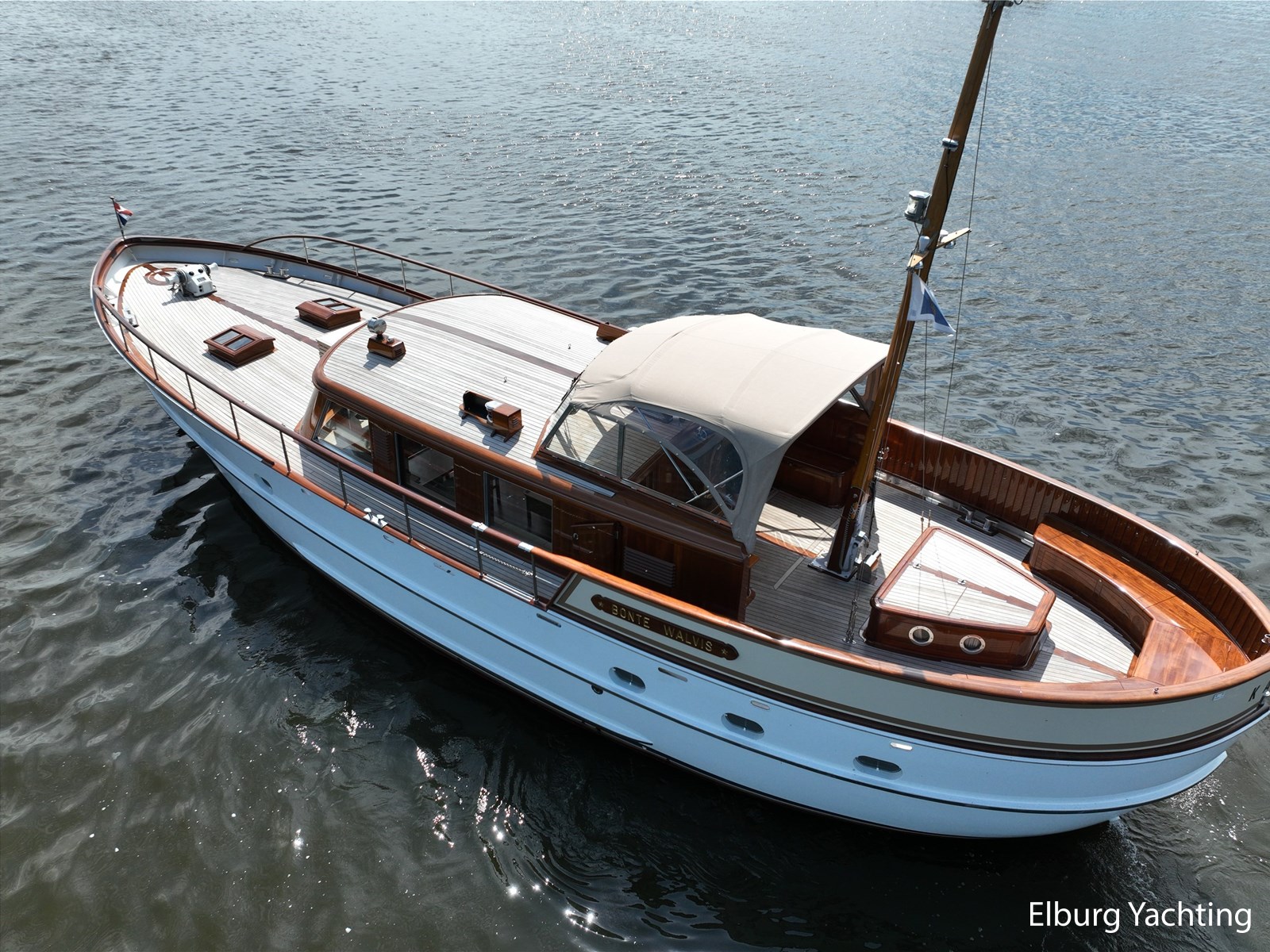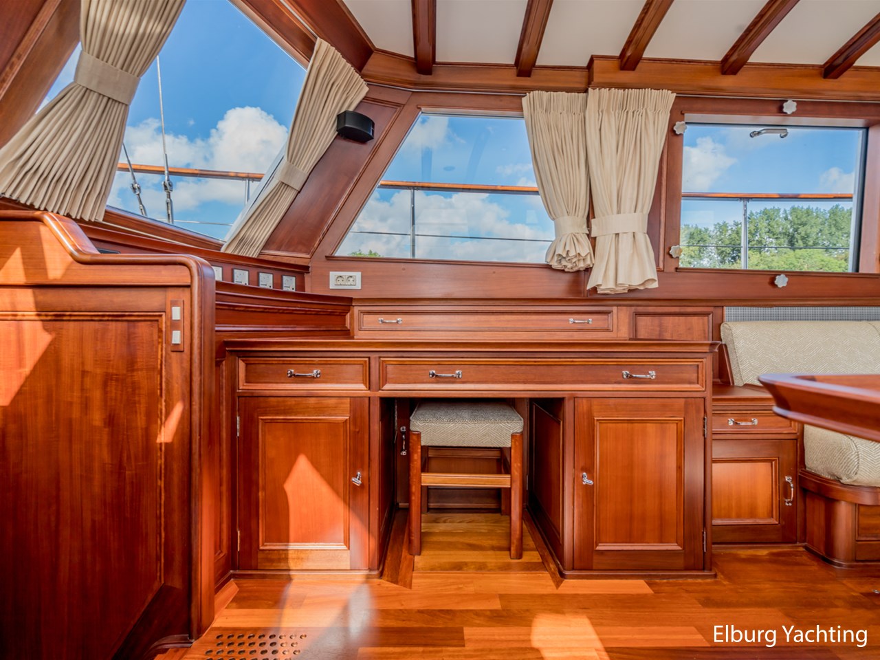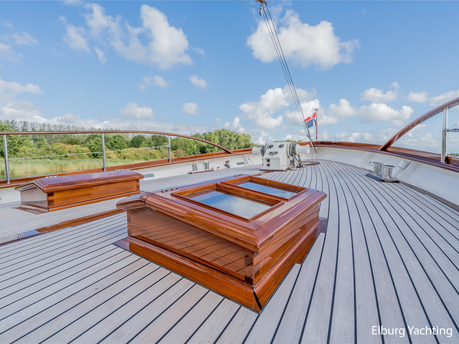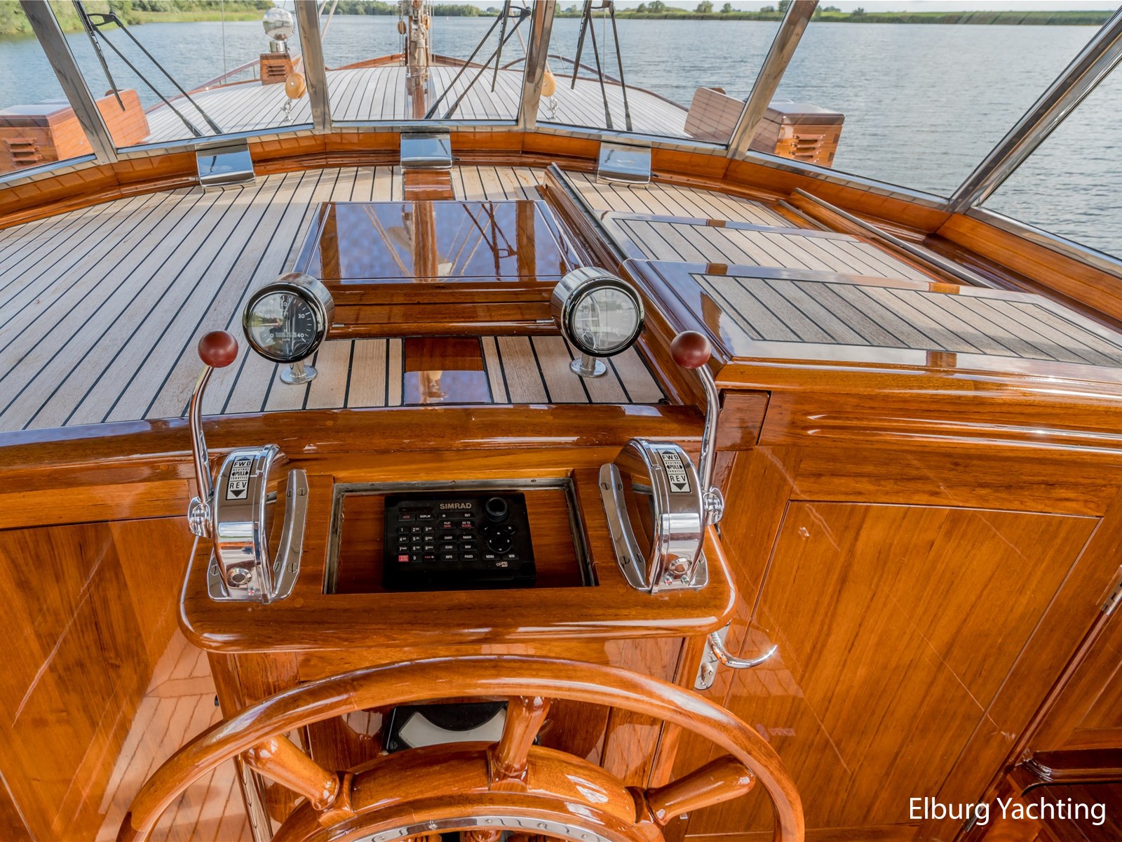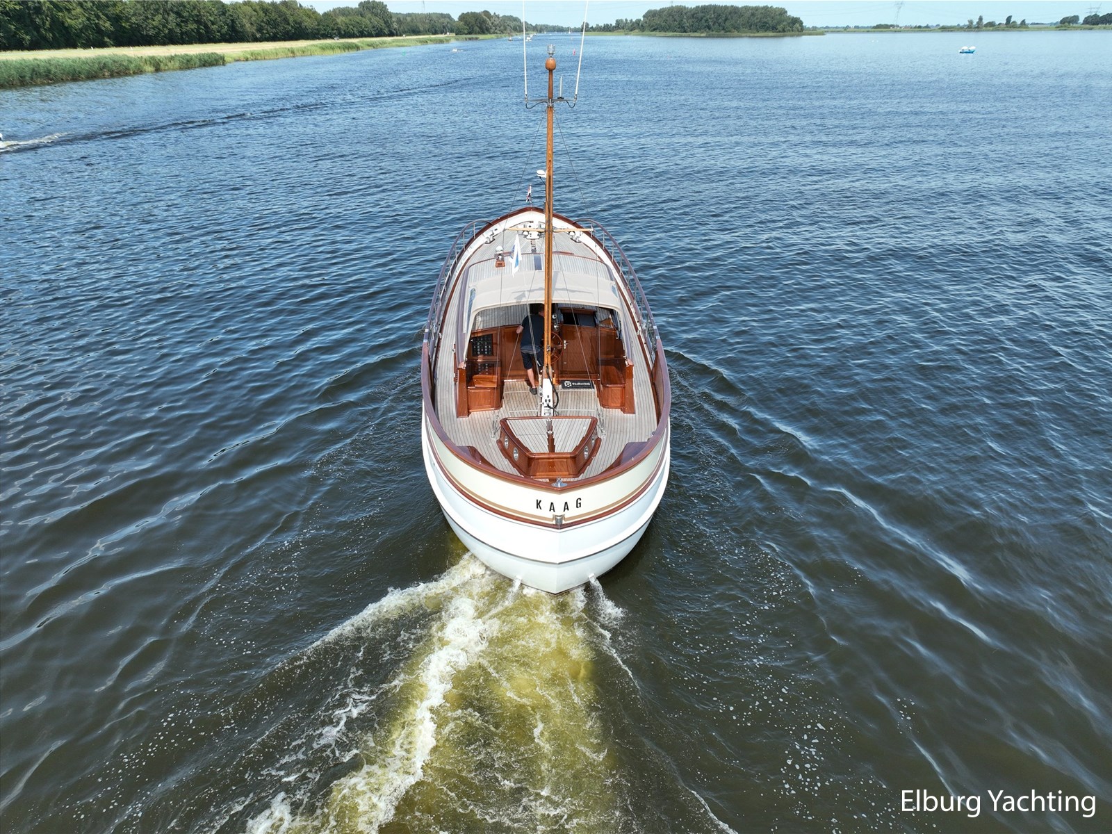 De Lunstroo 56 - (Total Refit 2015) is een stuk maritieme geschiedenis en zonder twijfel een van de meest in het oog springende kotterjachten die rondvaart. Het schip is gelanceerd in 1974, maar heeft in 2015 een volledige refit ondergaan op bij Nicolaas Witsen, waar kosten nog moeite zijn gespaard. Het schip heeft 2 nieuwe Perkins motoren gekregen, welke bekend staan om het lage toerental en laag geluidsniveau. Tijdens de refit is o.a. het volgende uitgevoerd : Nieuw massief teakdek (22 mm), nieuw teak kajuitdak (15 mm), Alle gelakte teakhout elementen van de kajuitopbouw zijn nieuw vervaardigd, verchroomde patrijspoorten, nieuw verpakte raamframes, de gehele elektrische installatie is vernieuwd incl. pompen en andere apparaten, nieuwe navigatieapparatuur, nieuw schroefassen, schroefaslagers, stuwdruklagers en schroeven. Alle tanks zijn open geweest, schoongemaakt en geïnspecteerd. (Zowel diesel, water en vuilwatertanks.), Leidingwerk is gemeten op wanddikte. Romp geschilderd in Awl Grip. Al het blanke lakwerk met impregneerhars en Dubbel UV Coating van Dubbelcoat Van de IJssel. (met uitzondering van de rondhouten), Motorbediening Morse omgebouwd tot elektronische bediening, Kabola CV met warmwatervoorziening gemonteerd, nieuwe stoffering, nieuw matrassen. De Lunstroo 56 beschikt over veel leefruimte in de salon en op het achterdek. Het is een uniek motorjacht met hoogwaardige afwerking met modern comfort en nieuwe techniek, geschikt om voor langere tijd op te verblijven. R.v.s. reling, r.v.s stootlijst, ruime zitgelegenheid in de salon, 7 slaapplaatsen, chroom omrand windscherm, achteringang, 2 x vluchtluik voorin, Miele wasmachine, stahoogte ca. 2 meter, achterhut geschikt voor crewcabine (incl. entree machinekamer), goed geïsoleerde machinekamer. Stereoset BOSE Binnen en Buiten (2015), Lowe TV + Lift (2015), CVO certificaat aanwezig, bilge alarm aanwezig in 3 zone’s . De huidige eigenaar heeft om makkelijker lage bruggen te passeren de voormast gedemonteerd en droog opgeslagen en de achtermast klapbaar gemaakt d.m.v. een lier. Ook is in de stuurboord hut één van de stabelbedden weggenomen om meer ruimte te creëren. De doorvaarthoogte met mast op is ca. 8,40m en met geklapte mast en kuipramen geklapt ca. 2,90m.