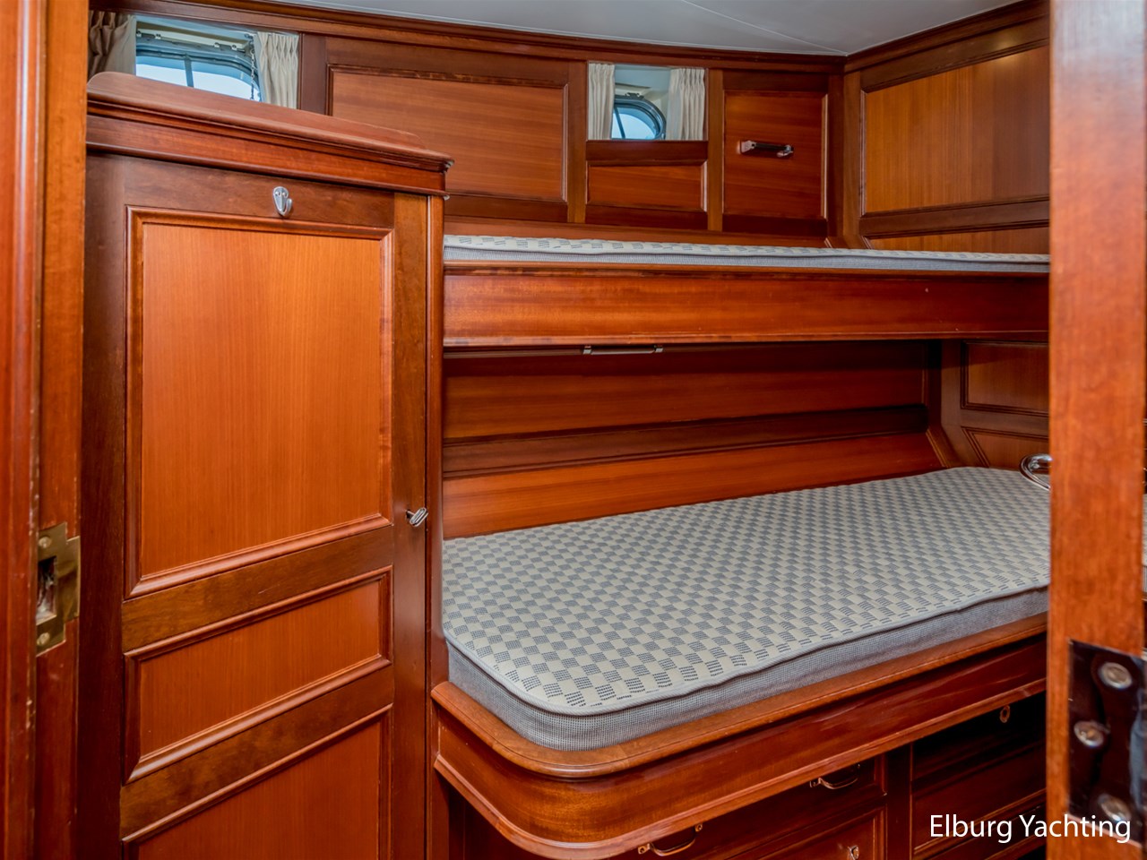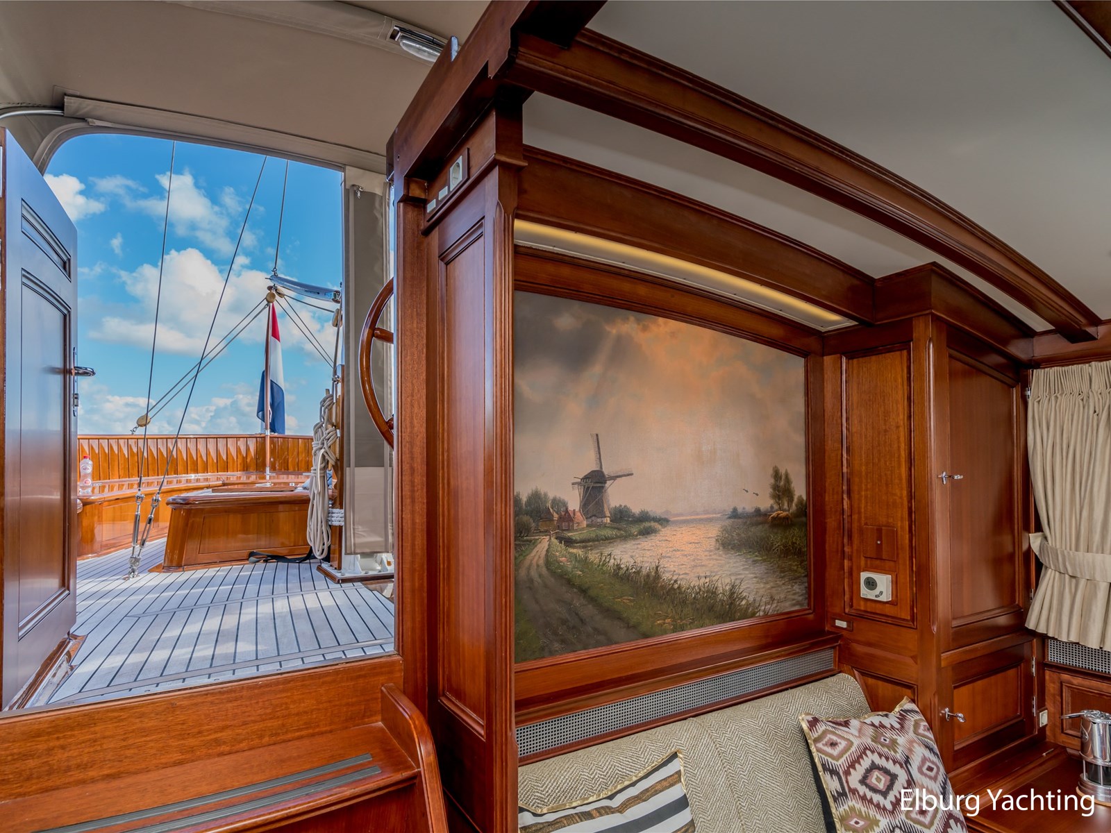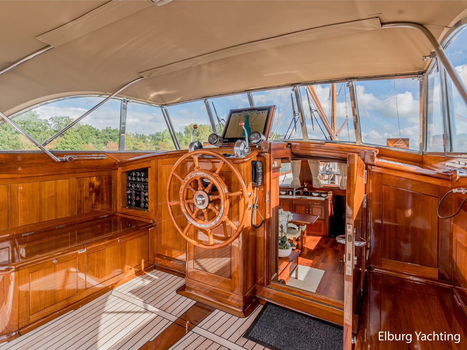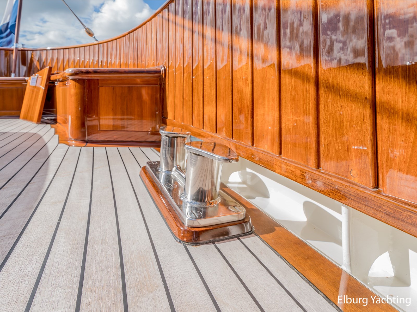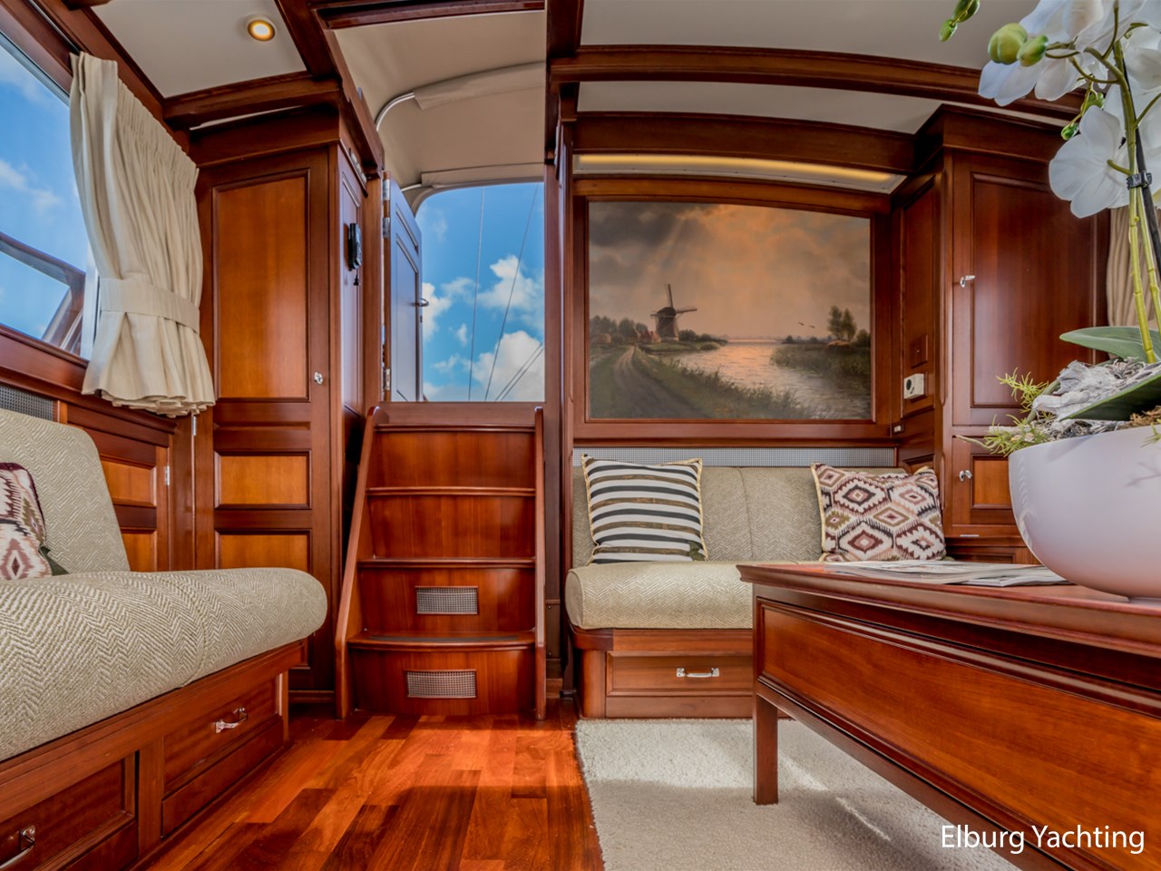 De Lunstroo 56 - (Total Refit 2015) is een stuk maritieme geschiedenis en zonder twijfel een van de meest in het oog springende kotterjachten die rondvaart. Het schip is gelanceerd in 1974, maar heeft in 2015 een volledige refit ondergaan op bij Nicolaas Witsen, waar kosten nog moeite zijn gespaard. Het schip heeft 2 nieuwe Perkins motoren gekregen, welke bekend staan om het lage toerental en laag geluidsniveau. Tijdens de refit is o.a. het volgende uitgevoerd : Nieuw massief teakdek (22 mm), nieuw teak kajuitdak (15 mm), Alle gelakte teakhout elementen van de kajuitopbouw zijn nieuw vervaardigd, verchroomde patrijspoorten, nieuw verpakte raamframes, de gehele elektrische installatie is vernieuwd incl. pompen en andere apparaten, nieuwe navigatieapparatuur, nieuw schroefassen, schroefaslagers, stuwdruklagers en schroeven. Alle tanks zijn open geweest, schoongemaakt en geïnspecteerd. (Zowel diesel, water en vuilwatertanks.), Leidingwerk is gemeten op wanddikte. Romp geschilderd in Awl Grip. Al het blanke lakwerk met impregneerhars en Dubbel UV Coating van Dubbelcoat Van de IJssel. (met uitzondering van de rondhouten), Motorbediening Morse omgebouwd tot elektronische bediening, Kabola CV met warmwatervoorziening gemonteerd, nieuwe stoffering, nieuw matrassen. De Lunstroo 56 beschikt over veel leefruimte in de salon en op het achterdek. Het is een uniek motorjacht met hoogwaardige afwerking met modern comfort en nieuwe techniek, geschikt om voor langere tijd op te verblijven. R.v.s. reling, r.v.s stootlijst, ruime zitgelegenheid in de salon, 7 slaapplaatsen, chroom omrand windscherm, achteringang, 2 x vluchtluik voorin, Miele wasmachine, stahoogte ca. 2 meter, achterhut geschikt voor crewcabine (incl. entree machinekamer), goed geïsoleerde machinekamer. Stereoset BOSE Binnen en Buiten (2015), Lowe TV + Lift (2015), CVO certificaat aanwezig, bilge alarm aanwezig in 3 zone’s . De huidige eigenaar heeft om makkelijker lage bruggen te passeren de voormast gedemonteerd en droog opgeslagen en de achtermast klapbaar gemaakt d.m.v. een lier. Ook is in de stuurboord hut één van de stabelbedden weggenomen om meer ruimte te creëren. De doorvaarthoogte met mast op is ca. 8,40m en met geklapte mast en kuipramen geklapt ca. 2,90m.