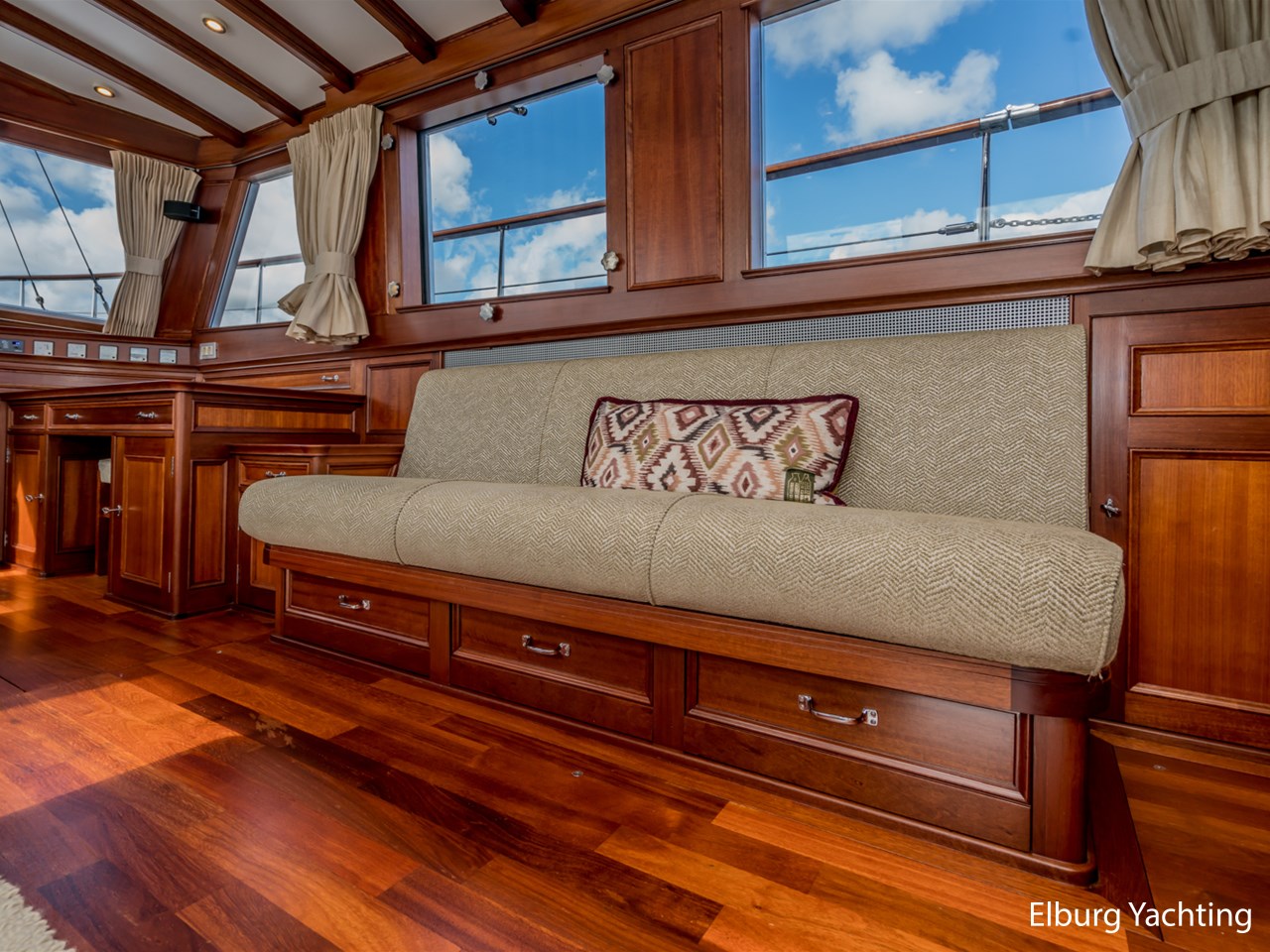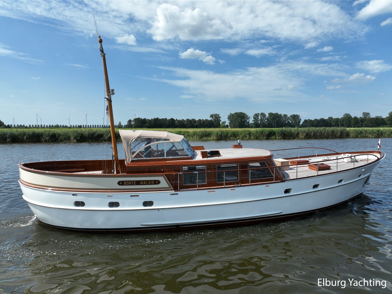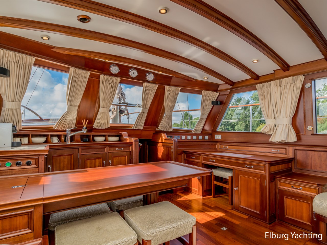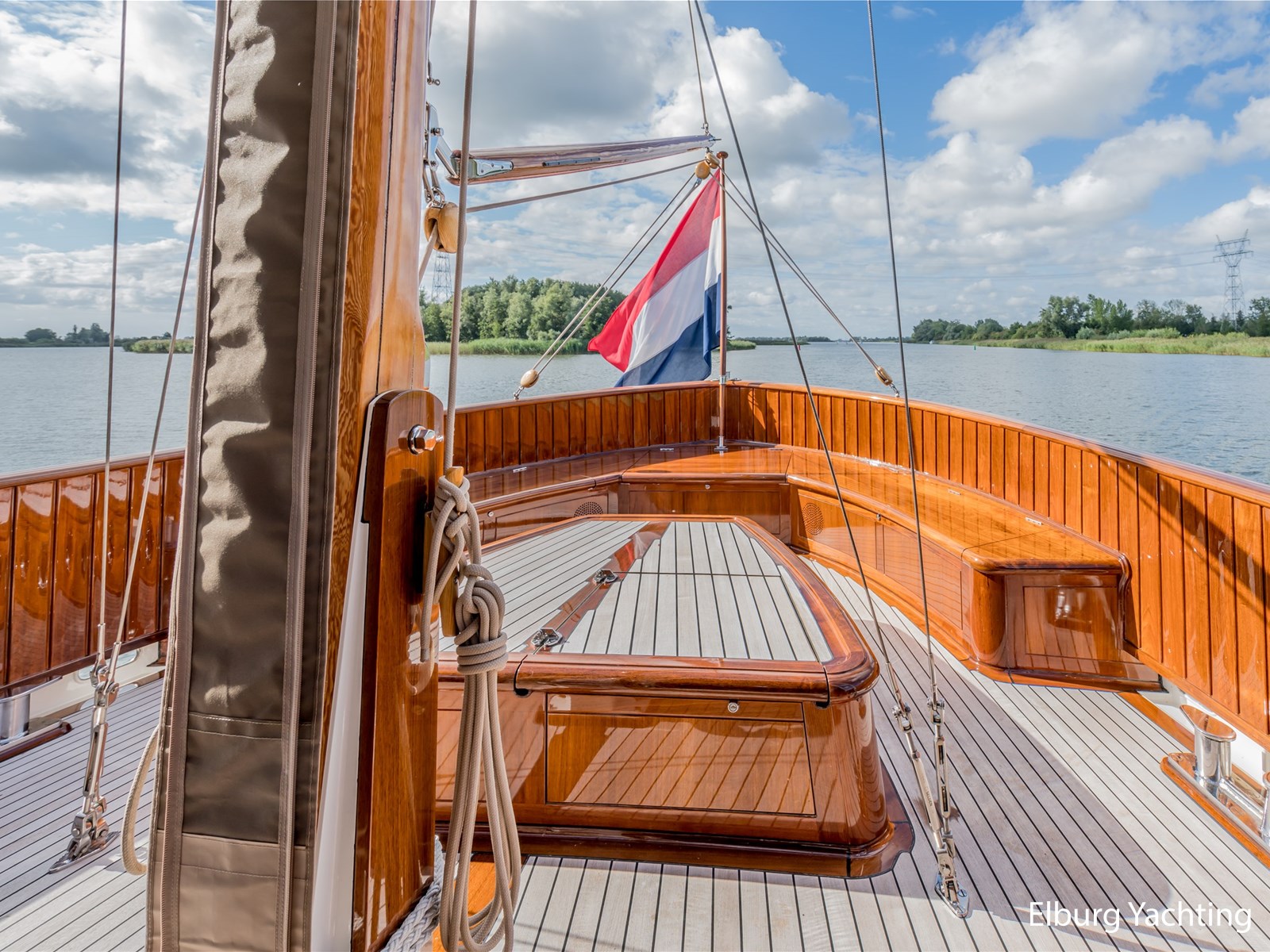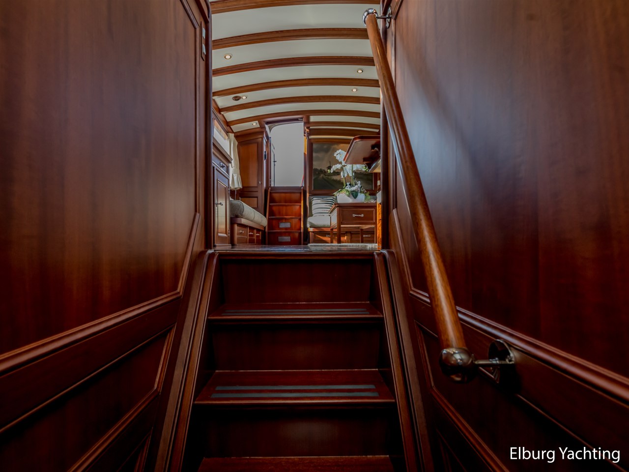 De Lunstroo 56 - (Total Refit 2015) is een stuk maritieme geschiedenis en zonder twijfel een van de meest in het oog springende kotterjachten die rondvaart. Het schip is gelanceerd in 1974, maar heeft in 2015 een volledige refit ondergaan op bij Nicolaas Witsen, waar kosten nog moeite zijn gespaard. Het schip heeft 2 nieuwe Perkins motoren gekregen, welke bekend staan om het lage toerental en laag geluidsniveau. Tijdens de refit is o.a. het volgende uitgevoerd : Nieuw massief teakdek (22 mm), nieuw teak kajuitdak (15 mm), Alle gelakte teakhout elementen van de kajuitopbouw zijn nieuw vervaardigd, verchroomde patrijspoorten, nieuw verpakte raamframes, de gehele elektrische installatie is vernieuwd incl. pompen en andere apparaten, nieuwe navigatieapparatuur, nieuw schroefassen, schroefaslagers, stuwdruklagers en schroeven. Alle tanks zijn open geweest, schoongemaakt en geïnspecteerd. (Zowel diesel, water en vuilwatertanks.), Leidingwerk is gemeten op wanddikte. Romp geschilderd in Awl Grip. Al het blanke lakwerk met impregneerhars en Dubbel UV Coating van Dubbelcoat Van de IJssel. (met uitzondering van de rondhouten), Motorbediening Morse omgebouwd tot elektronische bediening, Kabola CV met warmwatervoorziening gemonteerd, nieuwe stoffering, nieuw matrassen. De Lunstroo 56 beschikt over veel leefruimte in de salon en op het achterdek. Het is een uniek motorjacht met hoogwaardige afwerking met modern comfort en nieuwe techniek, geschikt om voor langere tijd op te verblijven. R.v.s. reling, r.v.s stootlijst, ruime zitgelegenheid in de salon, 7 slaapplaatsen, chroom omrand windscherm, achteringang, 2 x vluchtluik voorin, Miele wasmachine, stahoogte ca. 2 meter, achterhut geschikt voor crewcabine (incl. entree machinekamer), goed geïsoleerde machinekamer. Stereoset BOSE Binnen en Buiten (2015), Lowe TV + Lift (2015), CVO certificaat aanwezig, bilge alarm aanwezig in 3 zone’s . De huidige eigenaar heeft om makkelijker lage bruggen te passeren de voormast gedemonteerd en droog opgeslagen en de achtermast klapbaar gemaakt d.m.v. een lier. Ook is in de stuurboord hut één van de stabelbedden weggenomen om meer ruimte te creëren. De doorvaarthoogte met mast op is ca. 8,40m en met geklapte mast en kuipramen geklapt ca. 2,90m.