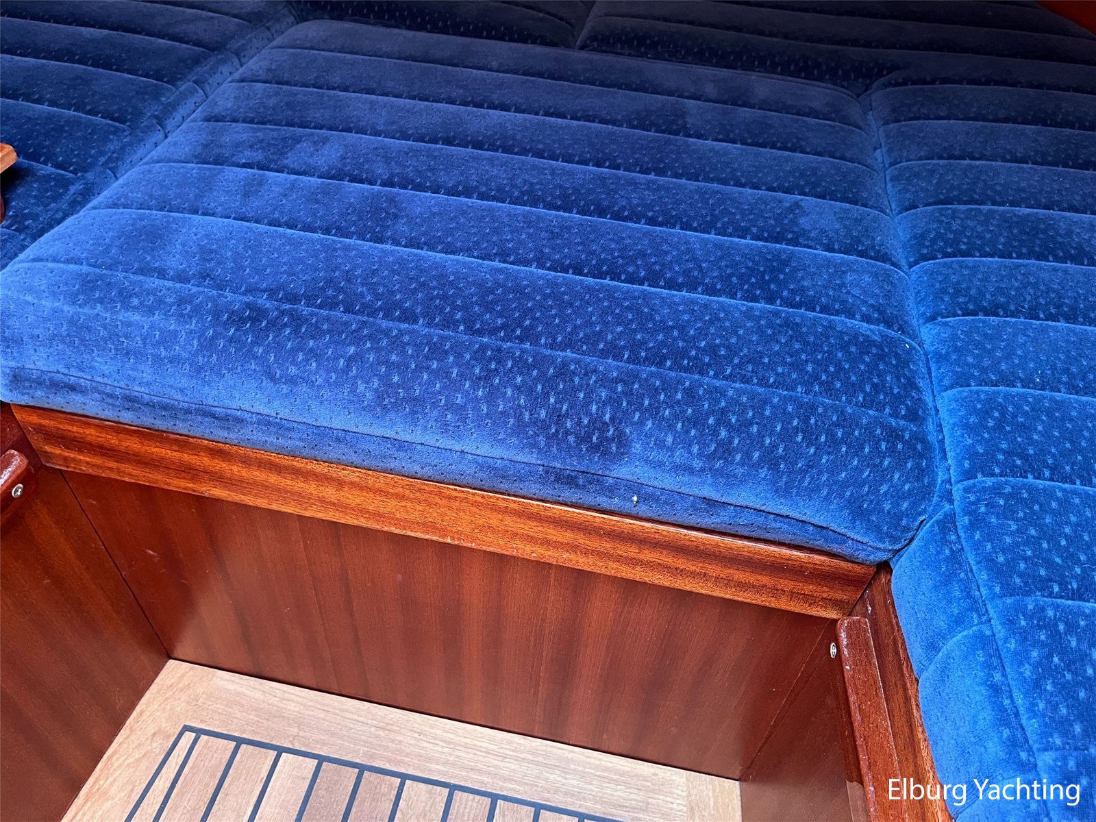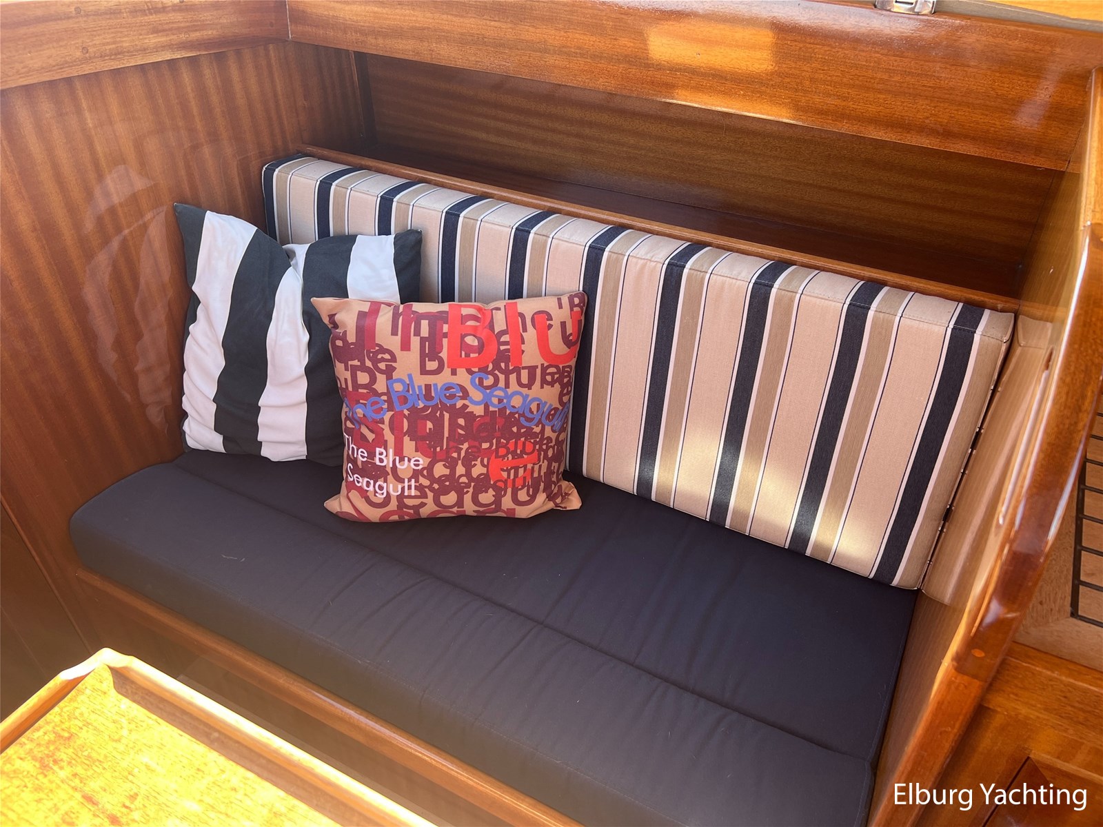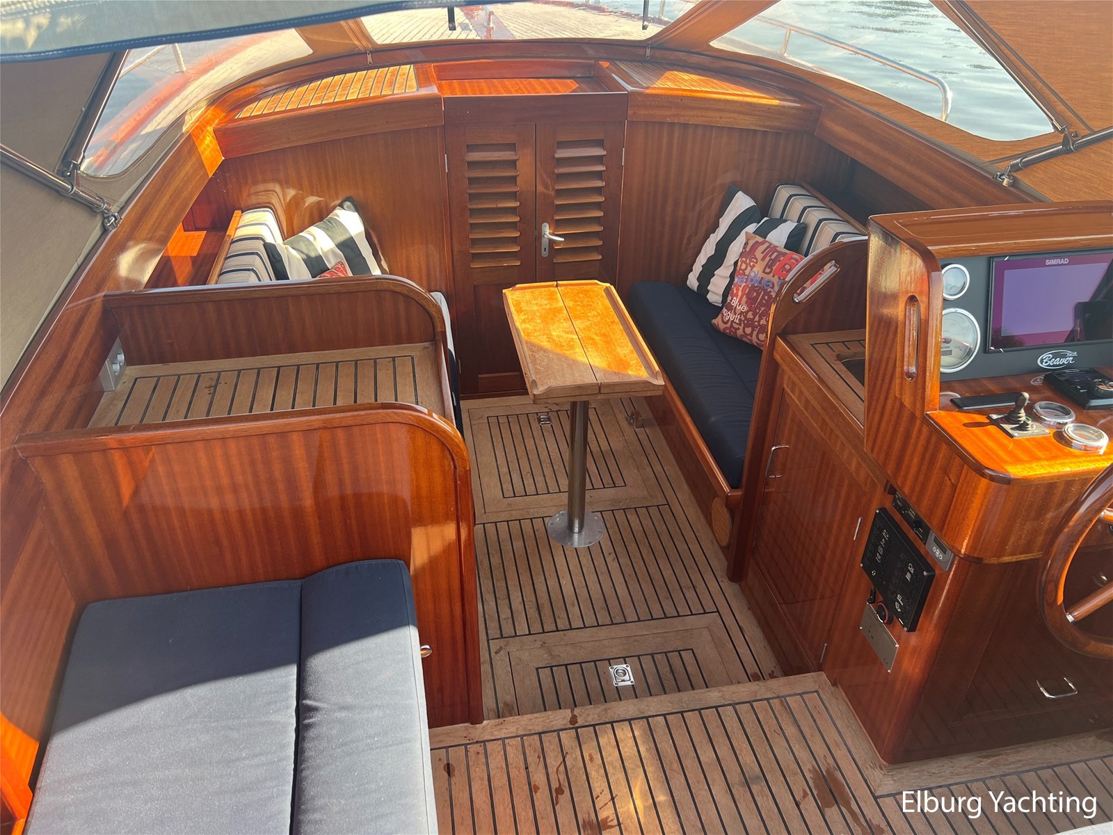 - Teakhouten interieur met wit/donkerblauwe bekleding