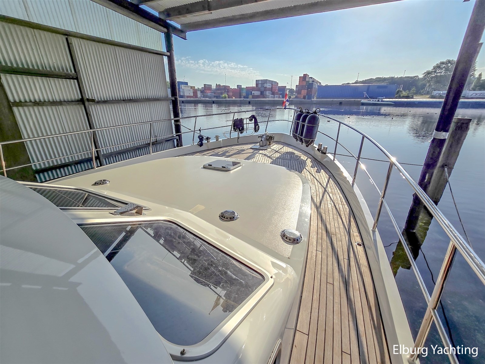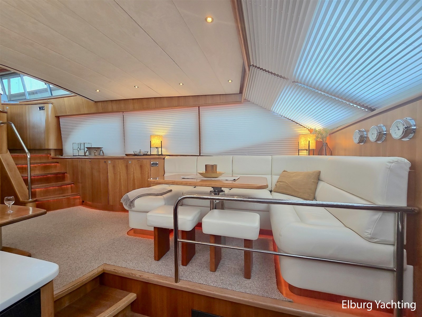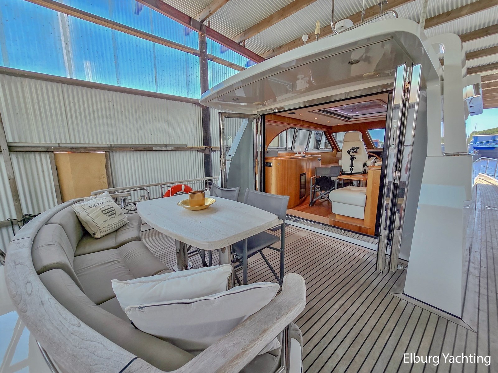 Via het stuurhuis kom je via de openslaande deuren op het riante achterdek met vaste tafel. Dit schip wordt verder geleverd met o.a: Samsung TV op lift in salon/stuurhuis/eigenaarshut, muggenhorren, groot elektrisch schuifdak in stuurhuis, r.v.s. klapbare deuren naar achterdek, r.v.s. reling, r.v.s. bolders, r.v.s. fenderkorven, r.v.s. spoelbakken, bolders op achterdek, bimini voor over achterdek, dubbele wasbakken in de eigenaarshut, op afstand bedienbare verwarming d.m.v. SMS, hydraulisch klapbare radarbeugel, kruiphoogte ca. 4.20 meter, designradiatoren in badkamers, generator start in keuken, Corian aanrechtblad, bergruimte onder keukenvloer, bergruimte voor vouwfietsen op voordek, luxe plafondbekleding, NEFF vaatwasser, AEG wasmachine (8kg), AEG droger (8kg), raam in spiegel, open badkamer in eigenaarshut, volledig betegelde douchecabines, dressoir in eigenaarshut, aluminium traanplaten in machinekamer, Firepro brandblussysteem in machinekamer, hydrauliekpomp op beide motoren, wijnkoeler, geïntegreerde bakskisten, dimbare verlichting, dekwaspomp, roerstandaanwijzer, 10 x patrijspoorten in roestvrij stalen frames, groot openslaand raam geïntegreerd in het achterschip voor extra licht en ventilatie van de eigenaarsslaapkamer, trap aan bak- en stuurboord, douche met warm/koud water en roestvrijstalen zwemtrap, teakvloer in cockpit, L-vormige bank met off-white lederen bekleding, teakhouten kuiptafel gemonteerd op twee roestvrijstalen steunen, 2 x cockpit plafondverlichting, 2 x Stereo luidspreker gemonteerd in cockpit plafond, de toegangsdeuren van de cockpit naar het stuurhuis zijn gemaakt van gepolijst roestvrij staal met dubbele beglazing en kunnen volledig harmonica-open voor optimaal contact en doorgang van de cockpit naar het stuurhuis, houtwerk interieur afgewerkt in zijdeglans gelakt kersenhout, licht zandgrijze vloerbedekking in alle delen van het interieur, behalve in de stuurhut (gelakte houten vloer), LED plafondverlichting in het hele interieur, grote centrale stuurstand met 360 graden overzicht en kapiteinsstoel, L-vormige bank afgewerkt met off-white lederen bekleding + salontafel, comfortabele zijtrap naar de salon, grote kast aan bakboordzijde met een voorlader AEG koelkast, AKAI flatscreen TV, wijnkast (koelt niet) en meerdere kasten, jaloezieën voor de ramen, uitzonderlijk veel opbergruimte/kledingkast en lades.