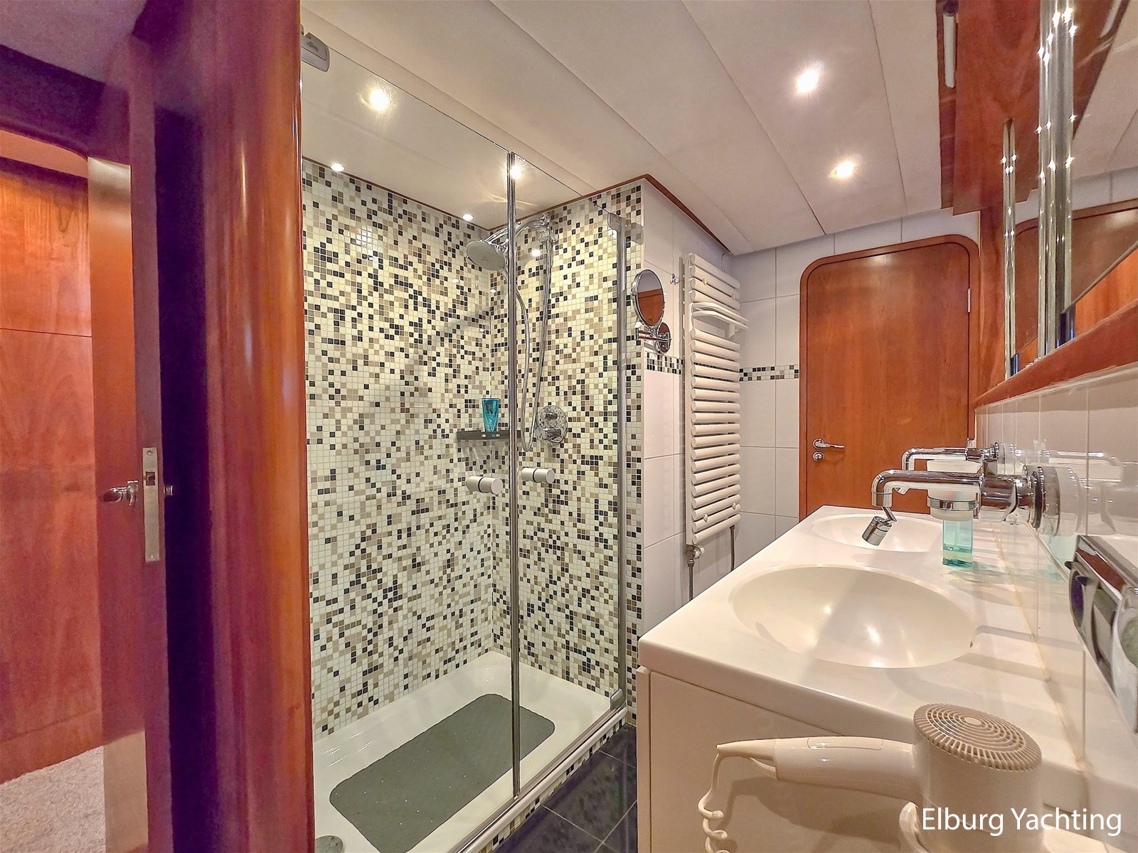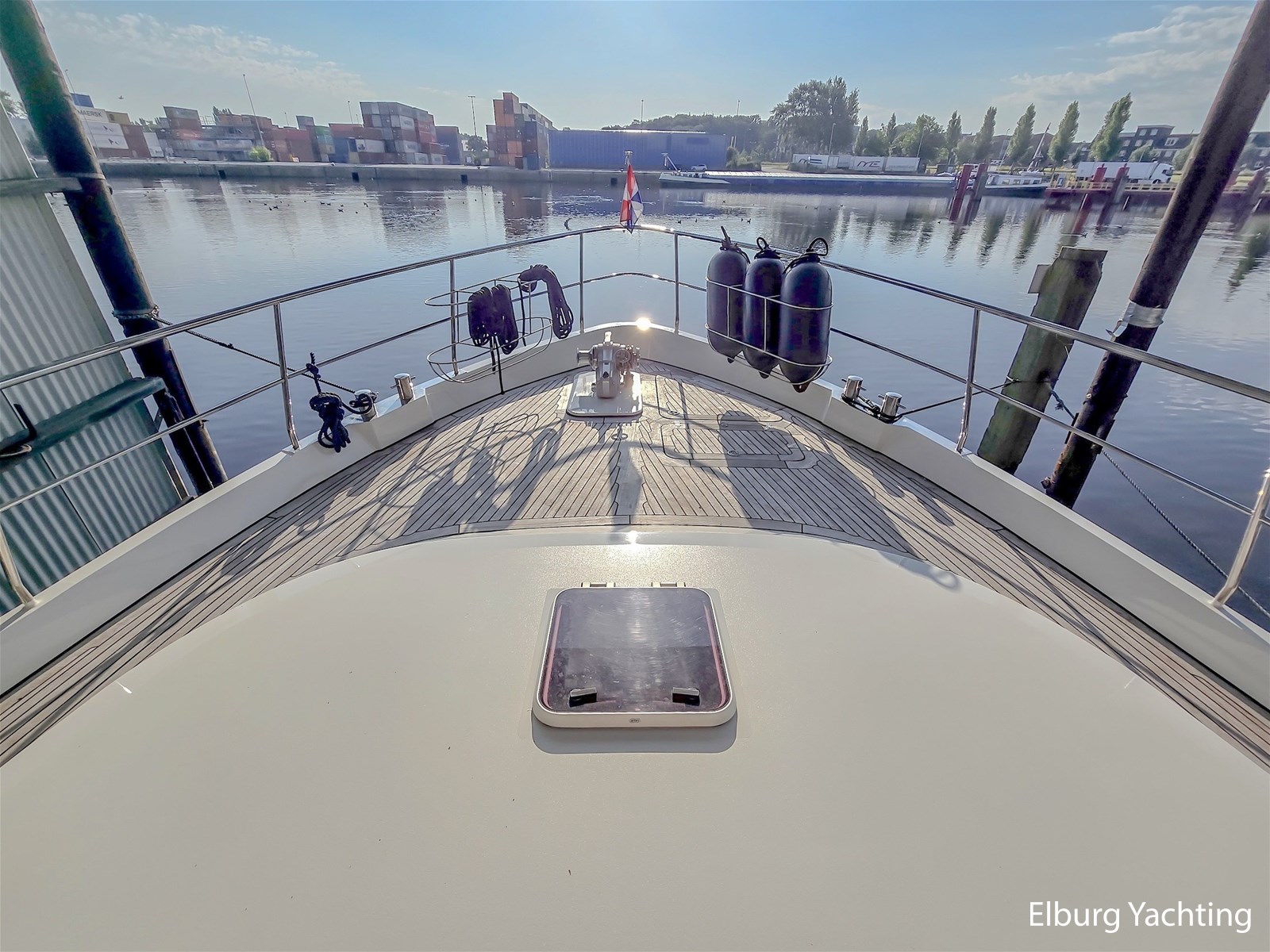- Geïntegreerd met teak + dubbele luie trappen + r.v.s. zwemtrap