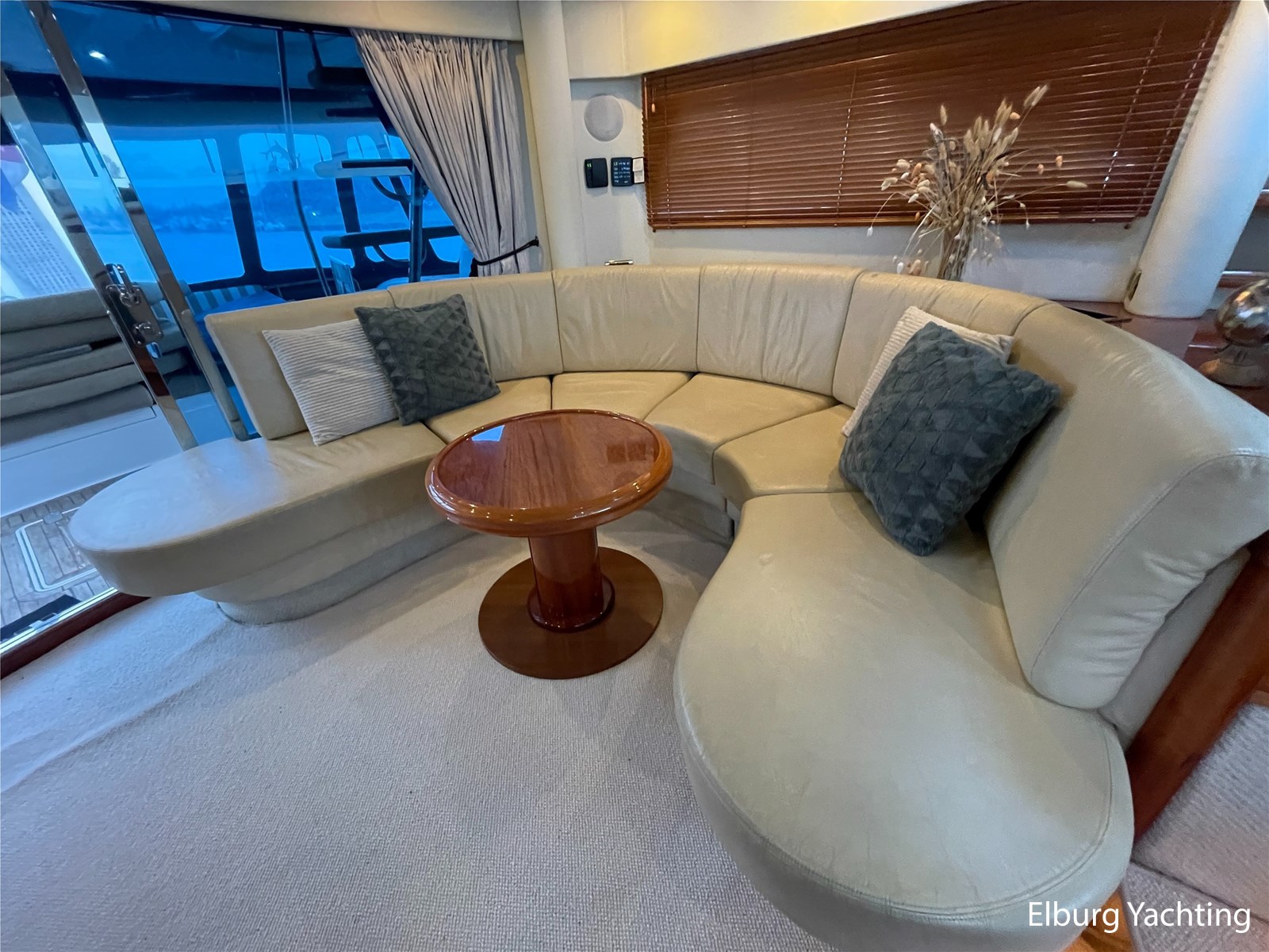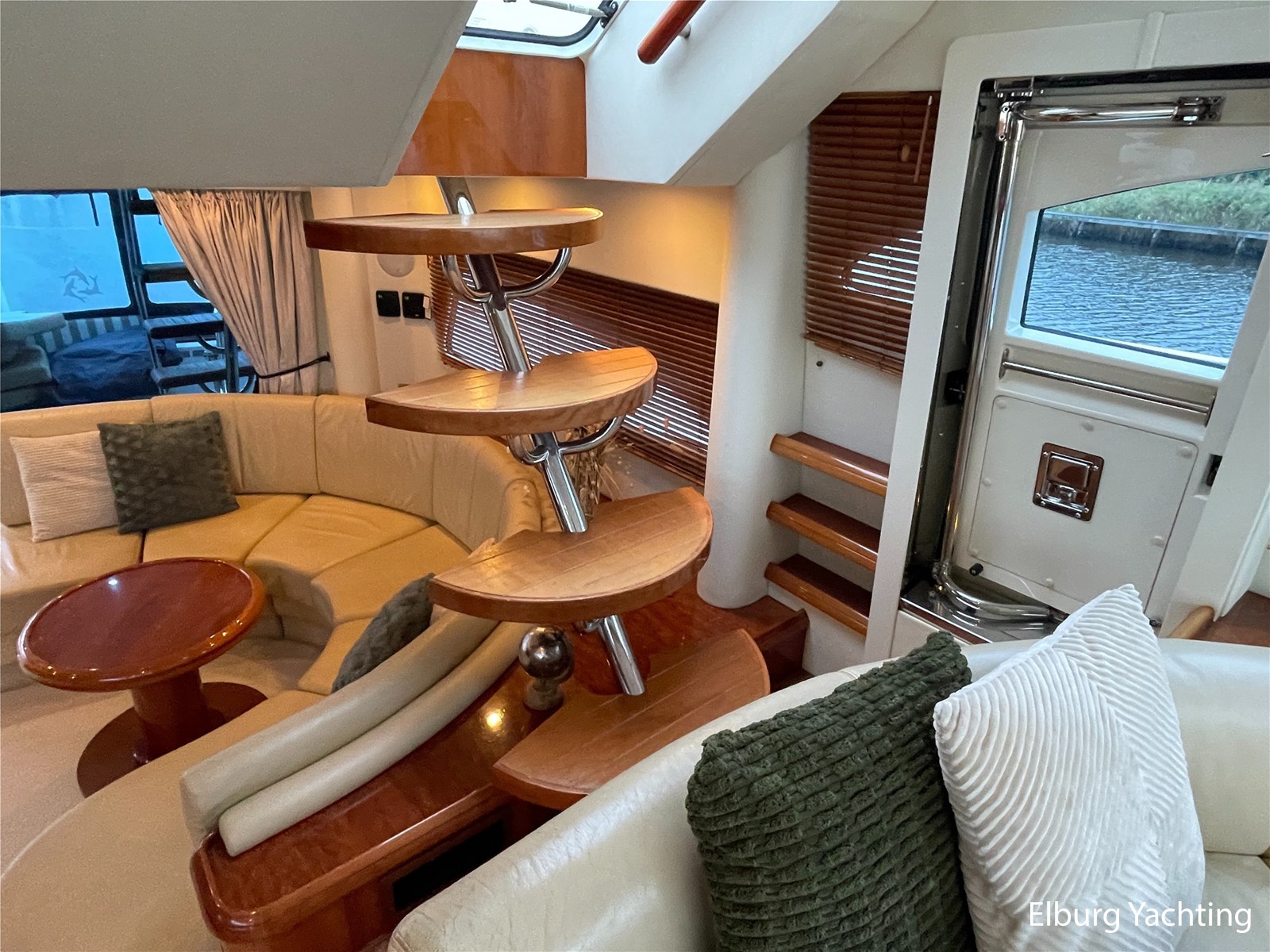 Deze snelvarende Fairline Squadron 55 biedt veel comfort en leefruimte met drie volwaardige 2-persoons vertrekken + 1 x crew. Het jacht beschikt o.a. over: Volledig afsluitbare achtertent, volledige cover over flybridge + losse covers voor bank en tafel, grote r.v.s. schuifdeur met toegang tot de salon, modern hoogglans kersenhouten interieur, 2 ruime zitbanken in de salon, utility room incl. wasmachine en koelkast, zowel binnen- als buitentrap naar flybridge, kussens voor bank op het achterdek, bekleding flybridge (2024), crew cabin met eigen slaapplaats (1 x 2 pers.) en toilet voorziening, groot opbergluik in open kuip, toegang tot machinekamer vanuit utility room en salon, Besenzoni hydraulische gangway tevens als bijboot lift te gebruiken, trim tabs, r.v.s. reling rondom, BB zijdeur in opbouw, 3 x dubbel armige ruitenwisser, volledige biminitop over flybridge, vlucht/ventilatie luiken met muggenhorren, dekwaspomp met aansluiting voor- en achterop,