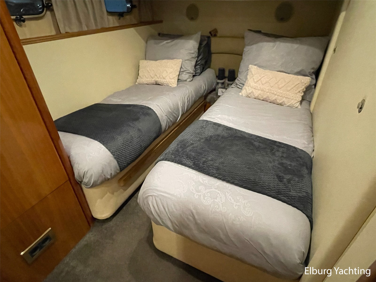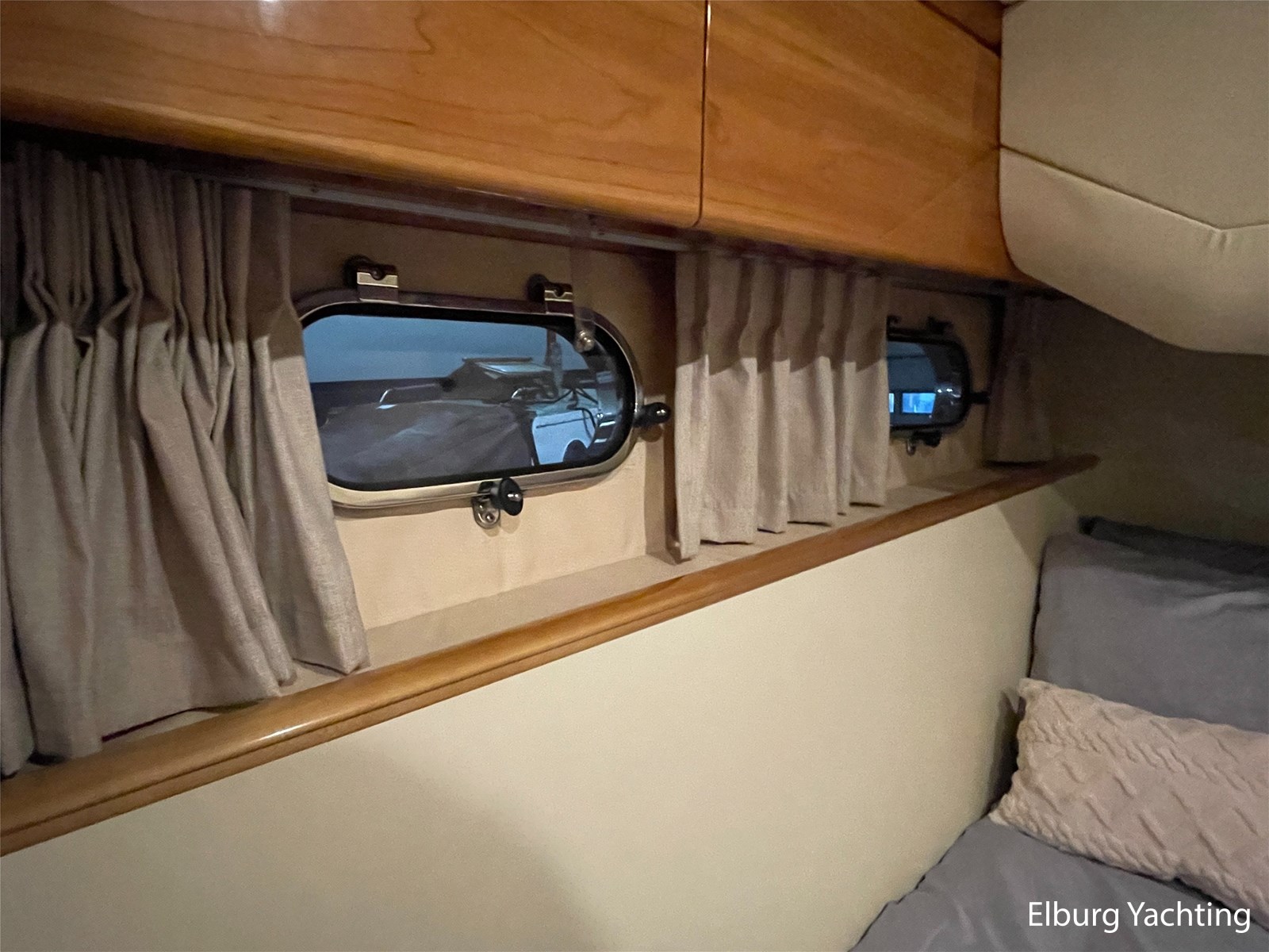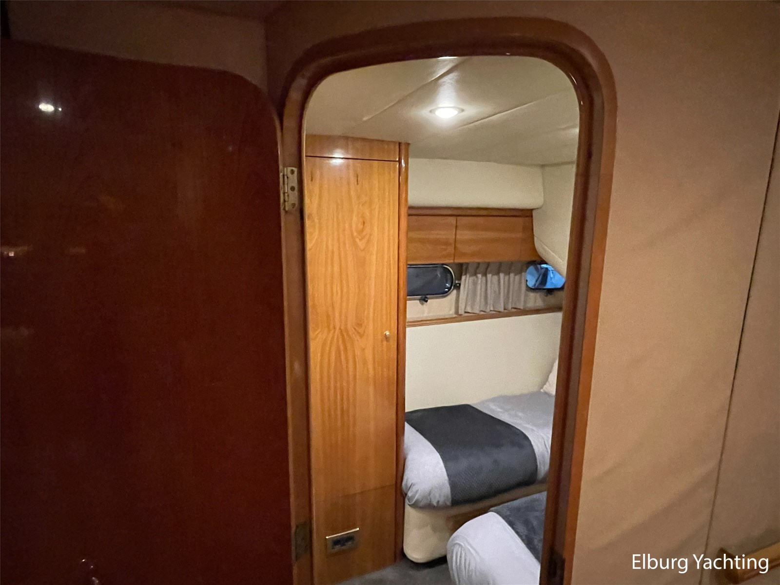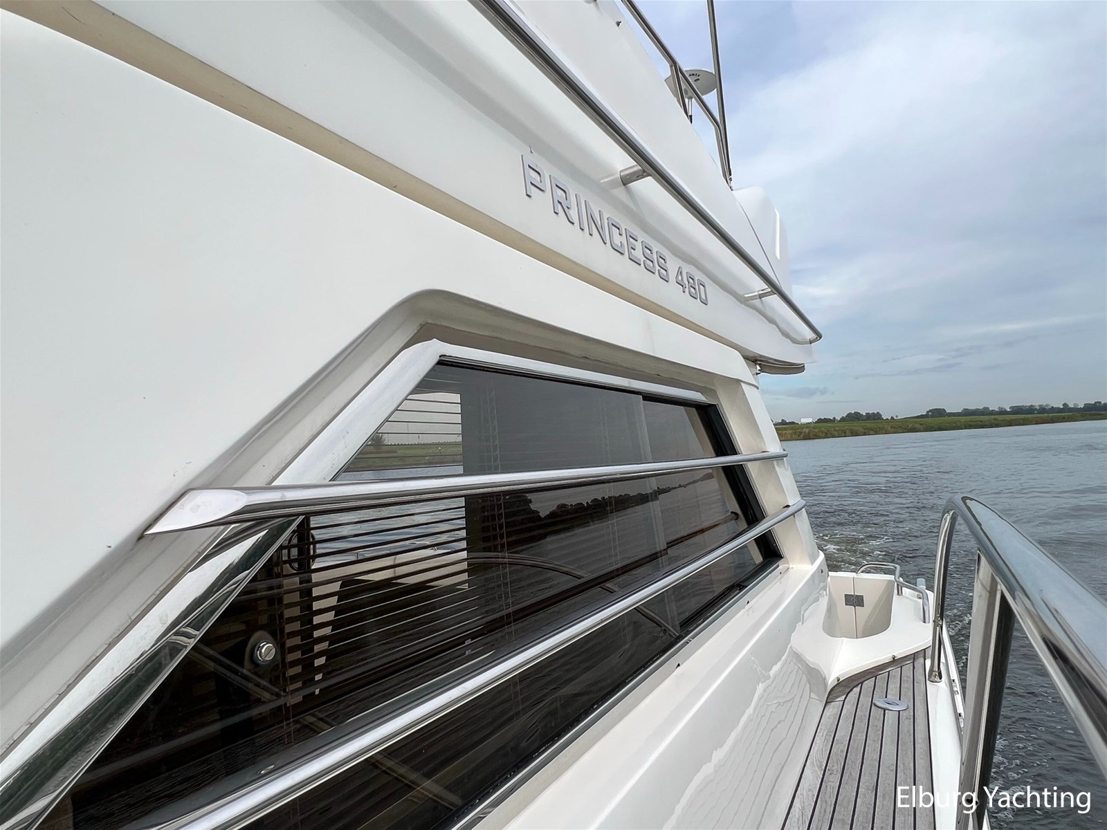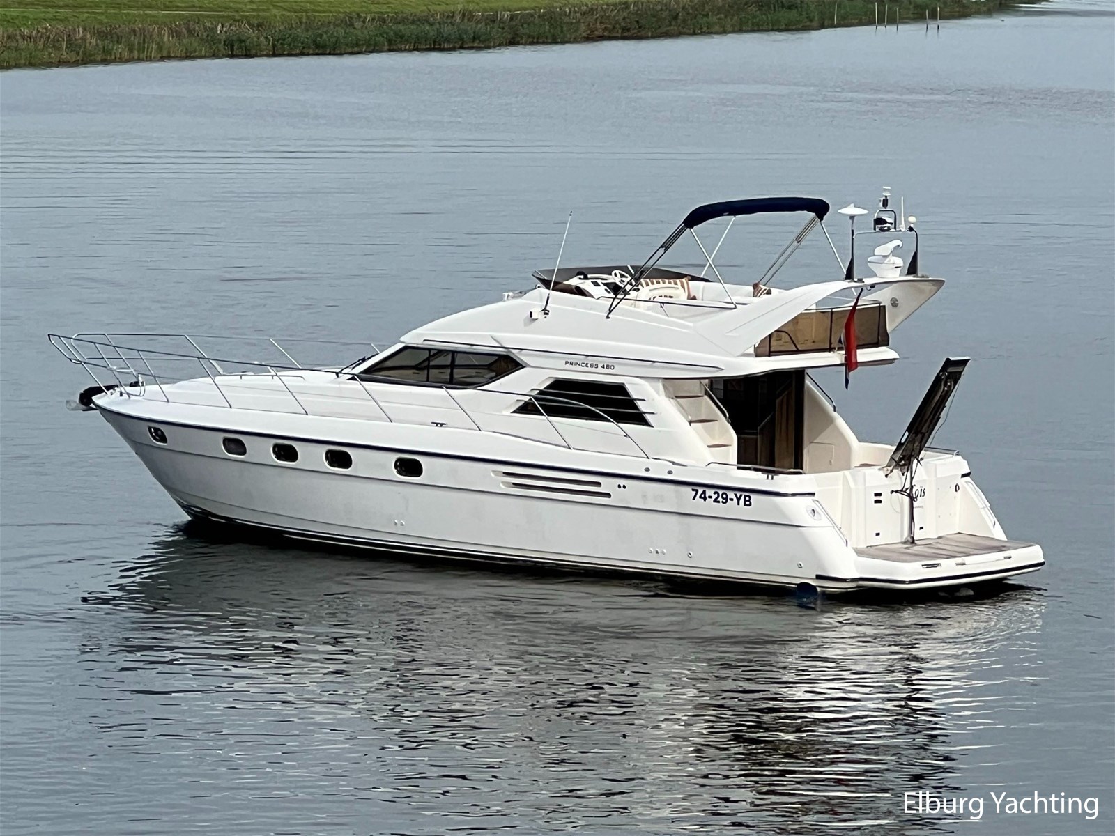 Prachtige Princess 480 Flybridge welke voorzien is van een zeer open en lichte salon / dinette indeling, twee comfortabele hutten en een ruime bering in het achterschip. Beide hutten hebben een 2-persoons bed met allebei toegang tot een eigen douche/toilet ruimte. Deze Princess 480 is uitgevoerd met: Vaste zitbank in open kuip met bijbehorende buitenkussens, de open kuip en salon gelijkvloers beloopbaar, r.v.s. schuifdeur naar salon, "luie" vaste trap naar flybridge, zonnebed op voordek, 2-persoons vaarbank op flybridge, trim tabs, volledige afsluitbare tent rondom kuip met uitristbare delen, r.v.s. buitenreling rondom, 2 x schuifraam in salon, biminitop op flybridge met afdekhoes 2024, buitendouche, ijsblokjesmachine, deur in spiegel naar zwemplatform, toegang machinekamer vanuit de open kuip en via salonvloer, zonneschermen rondom salonramen 2023, gordijnen in de salon vernieuwd in 2023. De verstuivers van de motoren zijn in 2024 gereviseerd, nieuwe antifouling + anode's 2024, nieuwe wasmachine 2024, nieuwe Eberspächer kachel 2024, nieuwe achtertent 2024, nieuwe biminihoes 2024 en zijn in 2023 beide dieseltanks gereinigd.