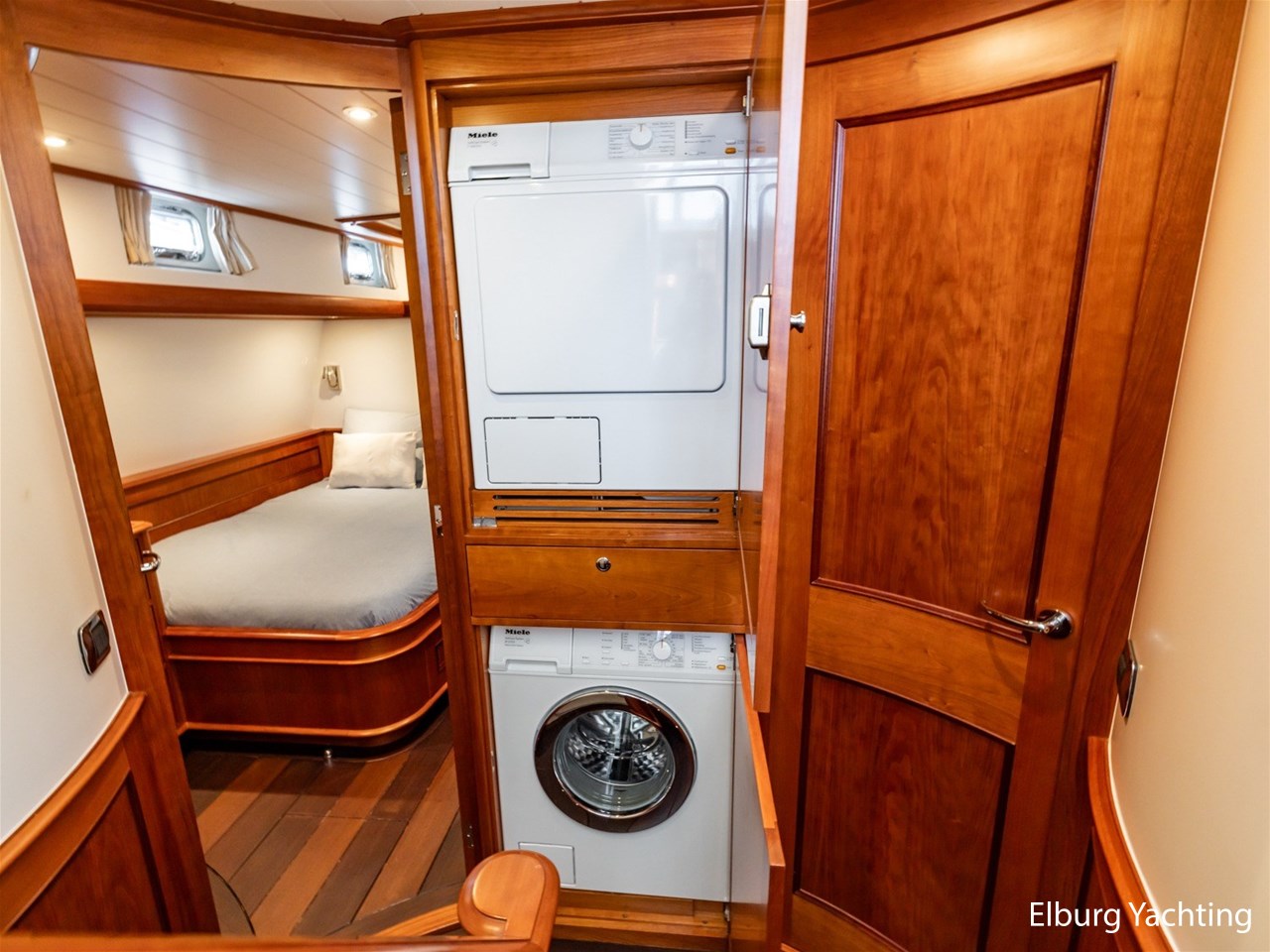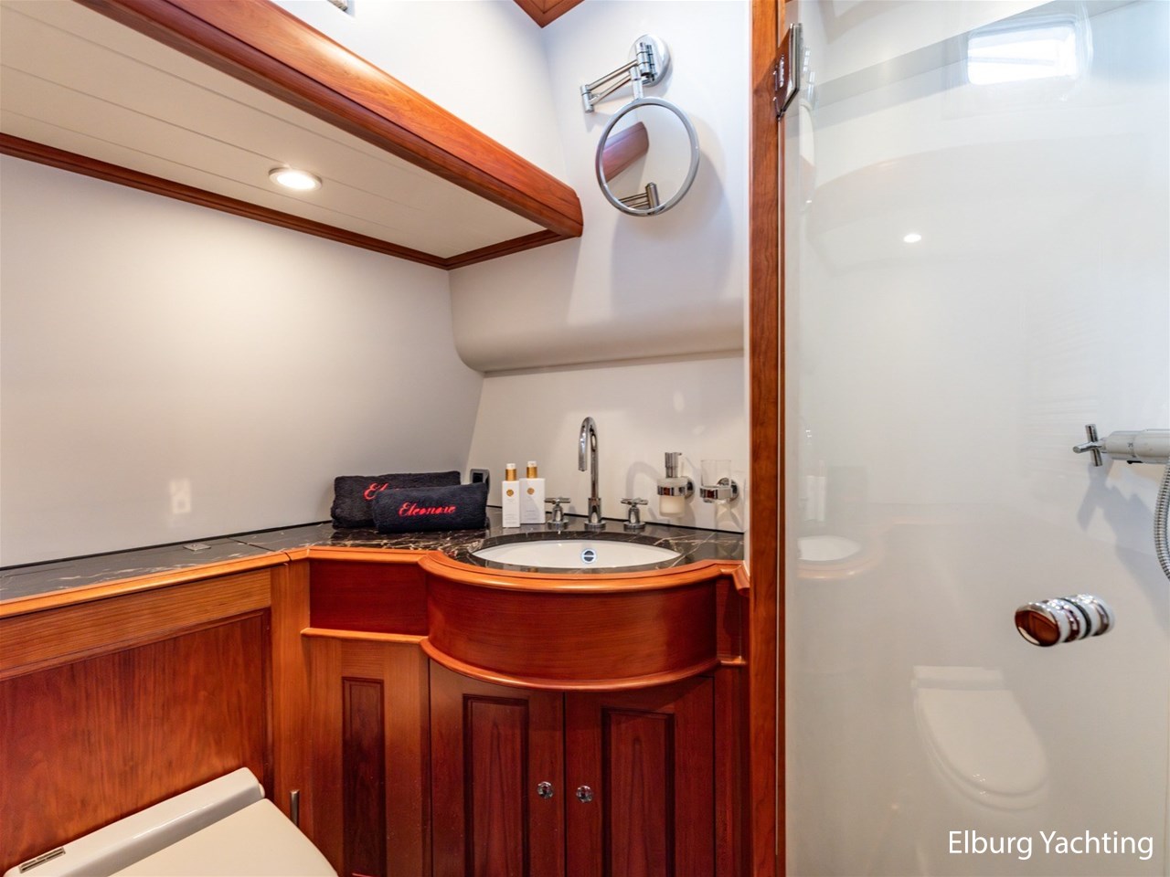 De Mulder Classic 77- Eleonore heeft 2 gastenhutten achterin. De eerste gastenhut beschikt over een ruim tweepersoons bed, de tweede gastenhut heeft twee eenpersoonsbedden. Beide gastenhutten beschikken over een eigen badkamer. De badkamers zijn voorzien van marmeren vloeren en topbladen. Het jacht beschikt over een tendergarage met hydraulische deur, Ankreo Spudpaal, onderwaterverlichting, elektrisch klapbare mast, Mastervolt Powersysteem control panel, Miele wasmachine 2105 en een Miele droger T8403, Fire pro automatische brandblusinstallatie in de machinekamer, r.v.s. reling + teakhouten potdeksel. Het jacht heeft een zeer ruim achterdek met een vaste dinette die uitermate geschikt is om met een groter gezelschap te genieten tijdens een prachtige vaartocht, wel is het mogelijk om in contact te blijven met de kapitein. Een ruime en overzichtelijke stuurstand met 2 persoons vaarbank, aansluitend een buitenbar met marmeren topblad.