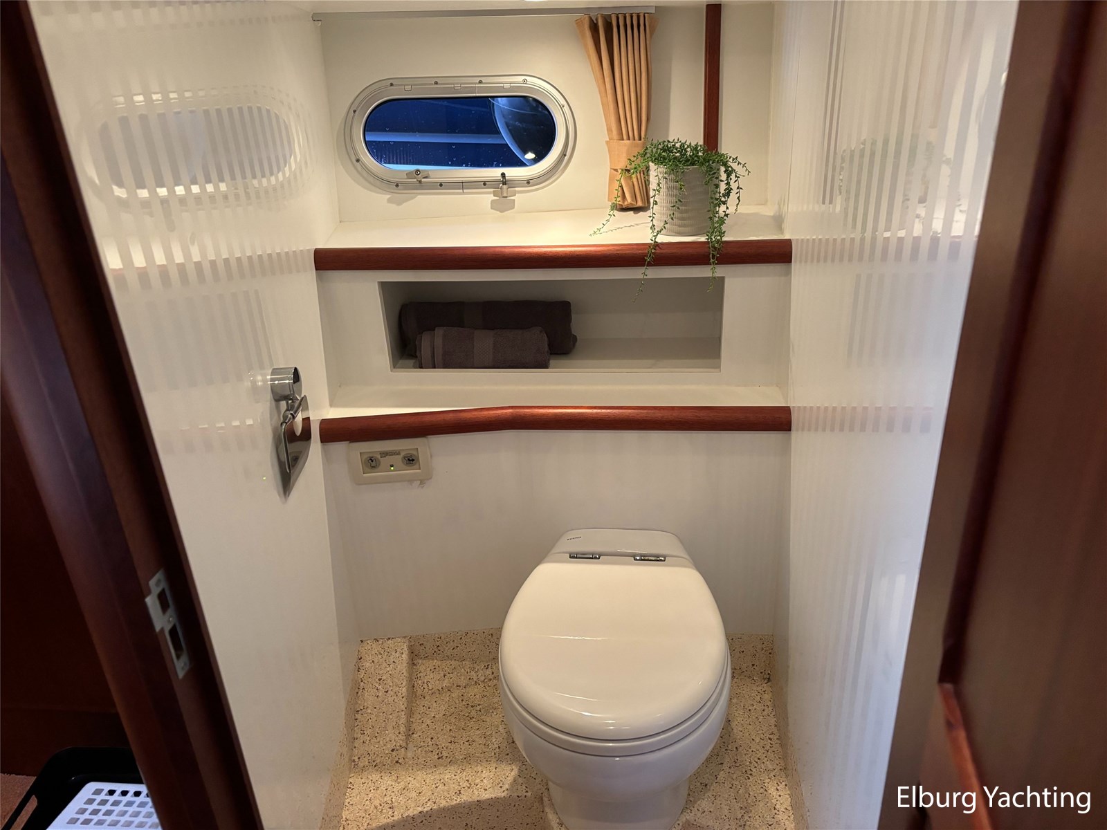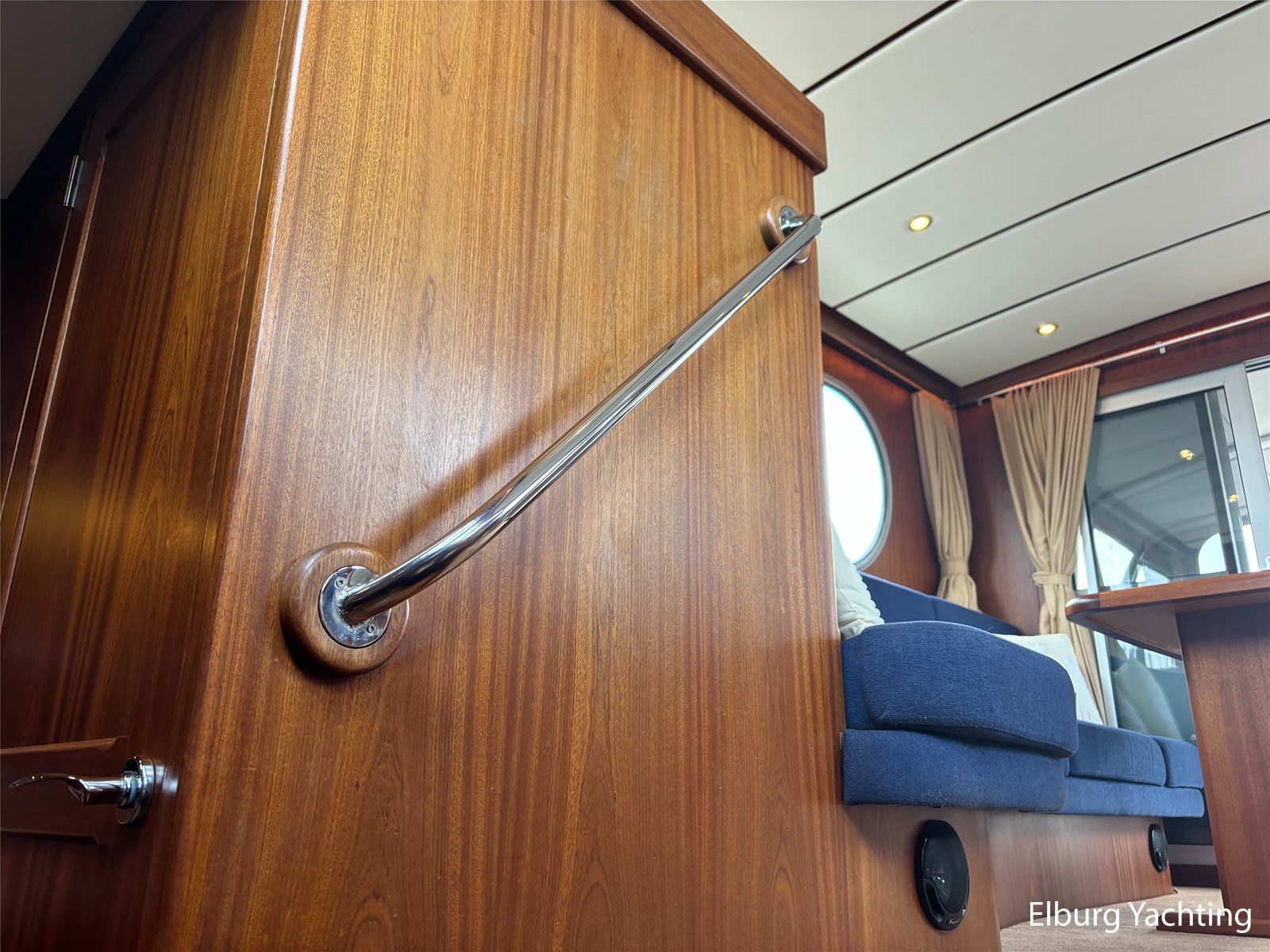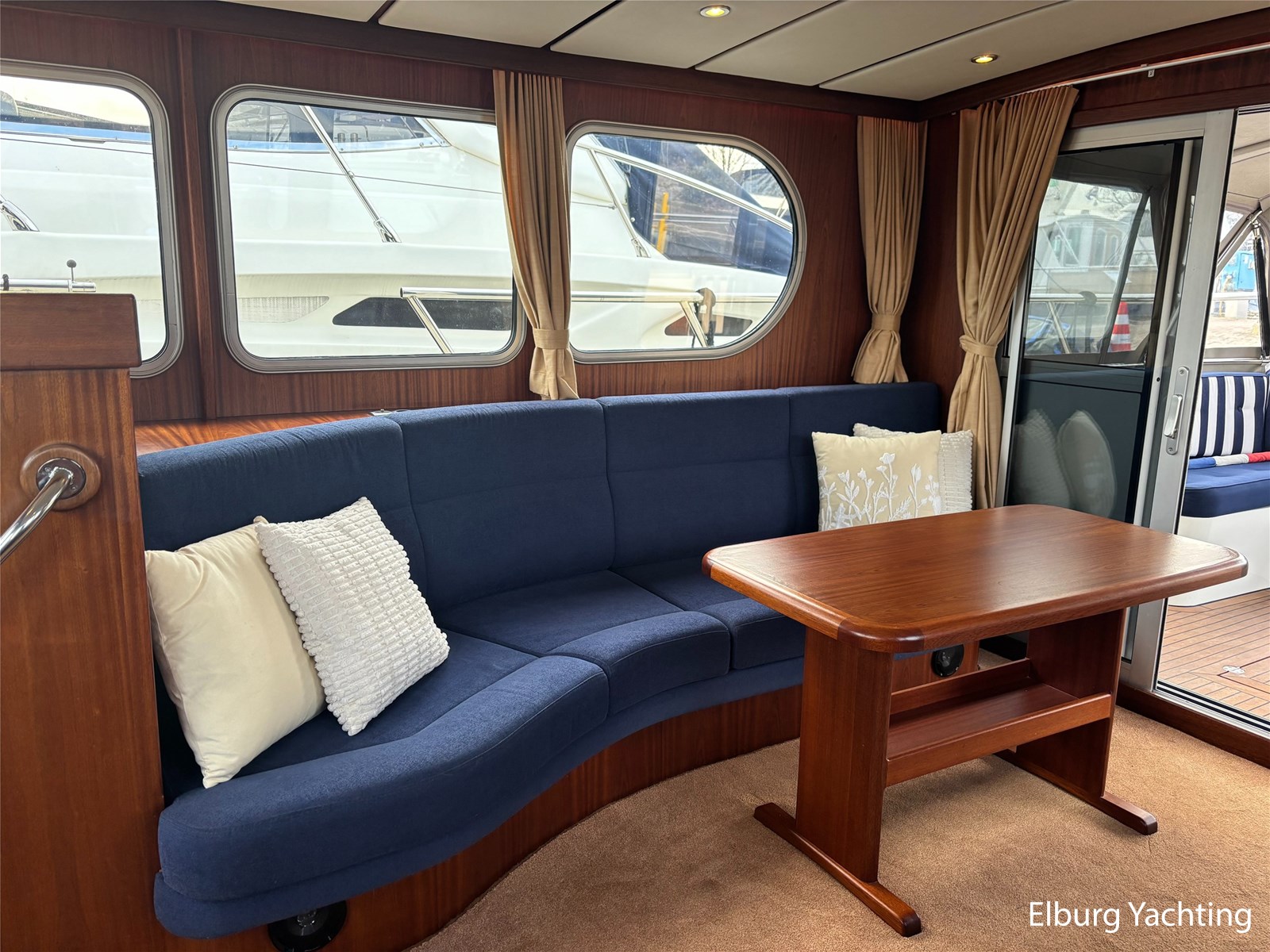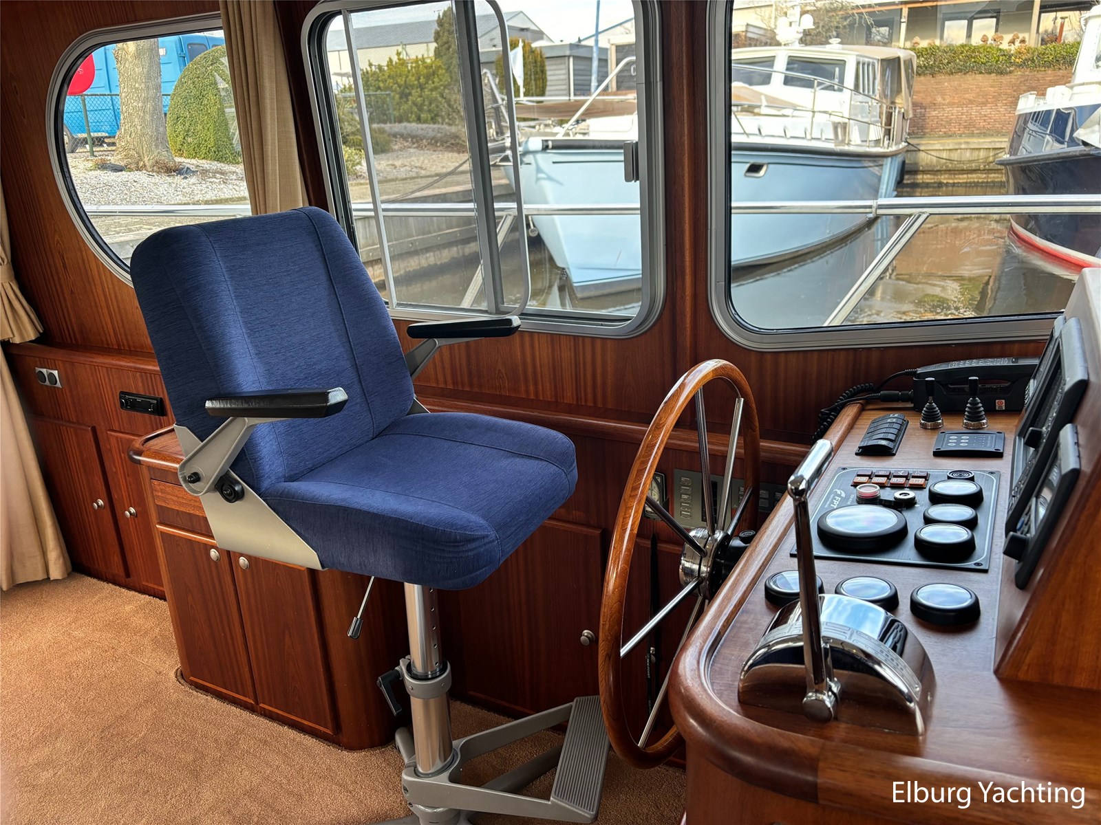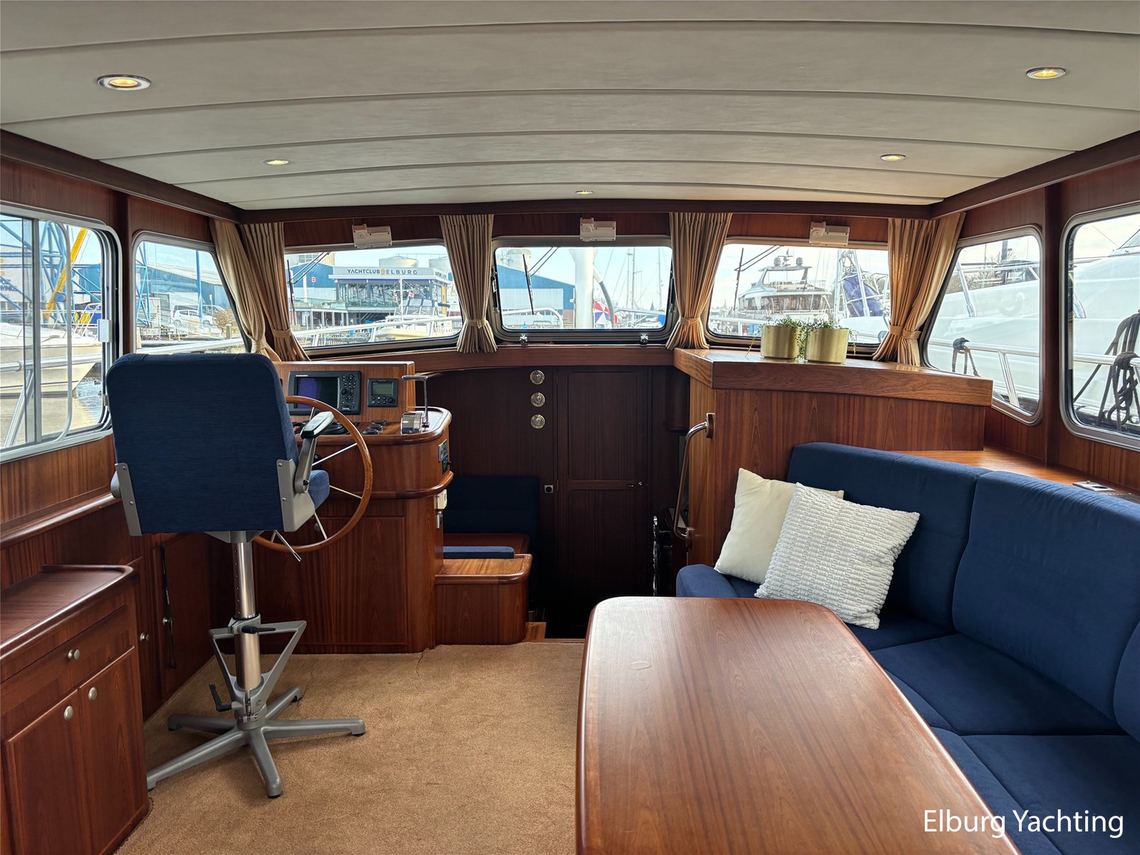 Bij de stuurstand heeft u goed overzicht door de raampartij, Het jacht is voorzien van een Sidepower afstandsbediening waardoor het jacht goed te manoeuvreren is. Vanaf de salon loopt u door middel van een trap naar beneden waar u aan de bakboord kant een ruime dinette vindt, en daar tegenover de kombuis. Als u rechtdoor loopt vindt u de eigenaars hut die voorzien is van een tweepersoons frans bed. Aangrenzend vindt u een douche in eigen cabine en een elektrisch toilet in eigen cabine. Vanuit de kombuis vindt u de gasten hut die is voorzien van een tweepersoons bed.