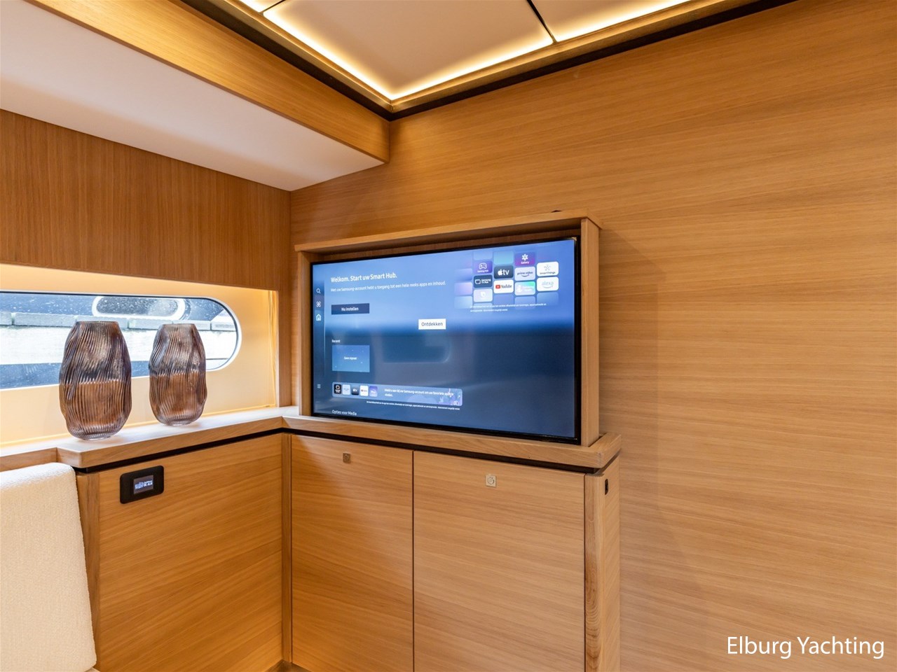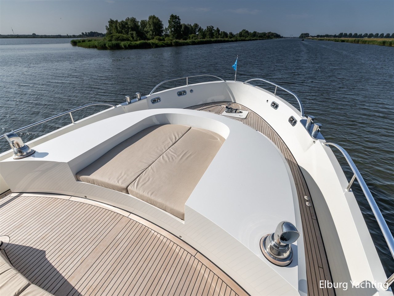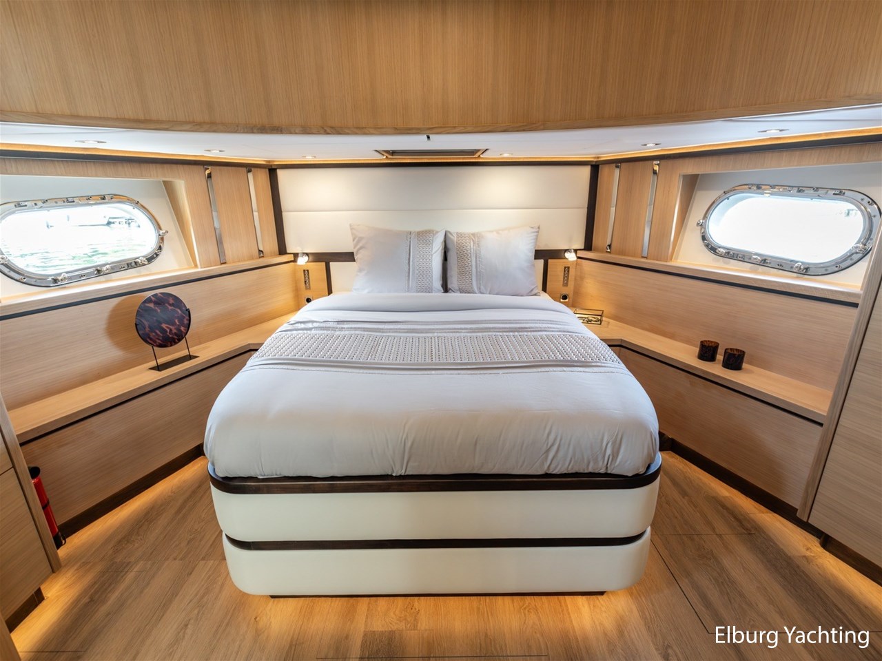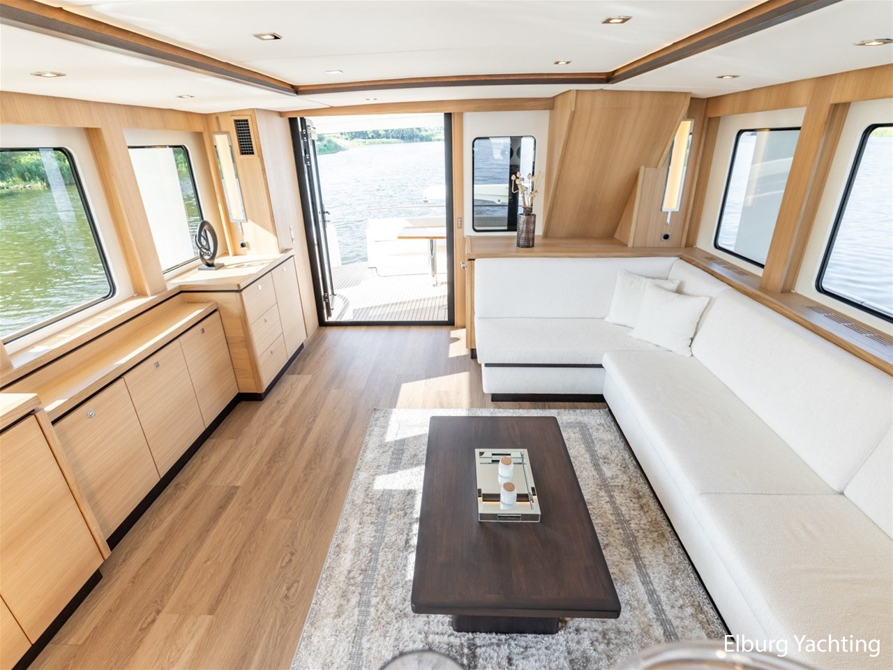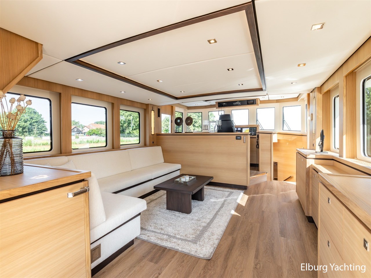 Aan boord valt direct het oog voor ruimte en design op. Het jacht is zeer ruimtelijk vormgegeven met veel hoogte (stahoogte salon ruim 2 meter). Het moderne eiken interieur in combinatie met de p.v.c. vloer (voorzien van vloerverwarming) is vakkundig tot stand gekomen en zorgt voor een aangename omgeving. Naast de centrale verwarming is het jacht voorzien van airconditioning in alle hutten, de salon en het stuurhuis. Het jacht beschikt over drie volwaardige hutten met in de eigenaarshut een ruim dubbel vrijstaand bed en on suite badkamer (lengte ca. 2 meter), aan bakboord twee enkele bedden (lengte ca. 2 meter) en aan stuurboord een ruim dubbel bed (lengte ca. 2 meter) + een enkel bed.