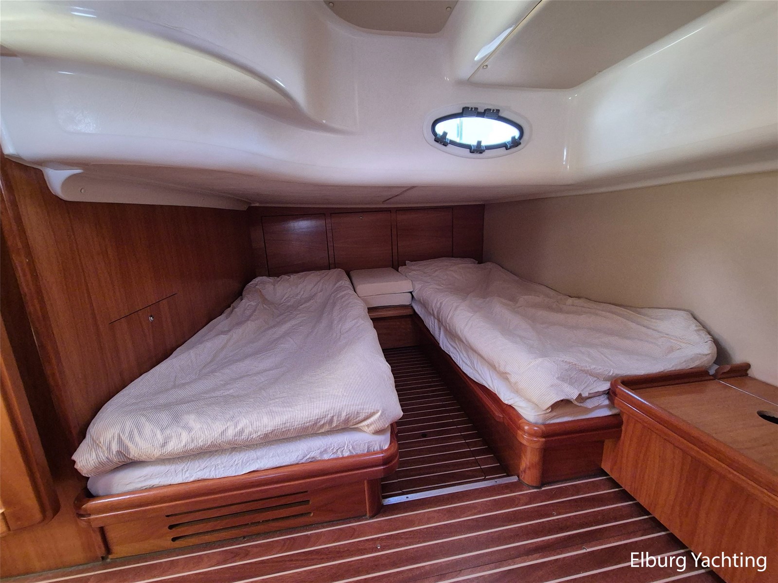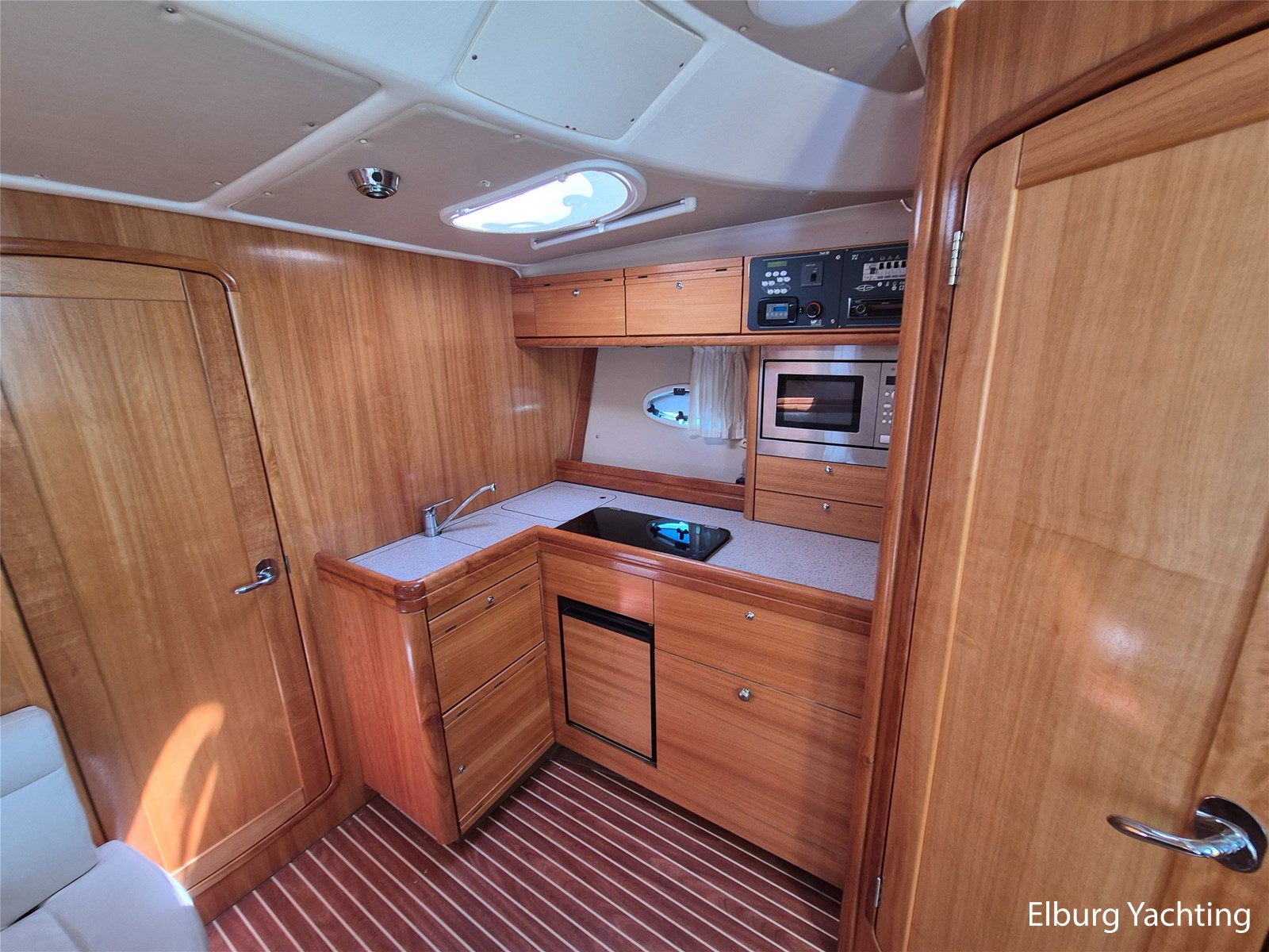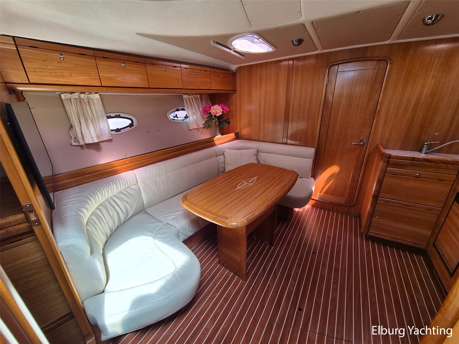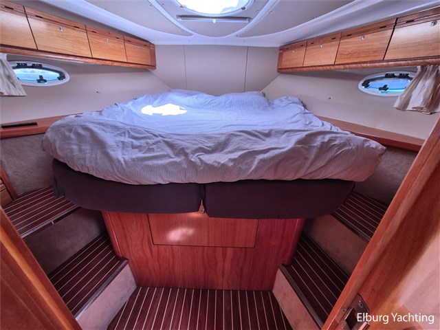 De indeling is praktisch met een fijne dinette met vaste tafel en handige kombuis met veel bergruimte, inductiekookplaat, dubbele spoelbak, magnetron/oven en ruime koelkast met vriesvak. Verder is ze voorzien van 2 ruime hutten (2 persoons vrijstaand Frans bed in de voorkajuit + 2 enkele bedden in de ruime achterkajuit) en een royale natte cel met elektrisch toilet, wastafel en grote afsluitbare douchekabine.