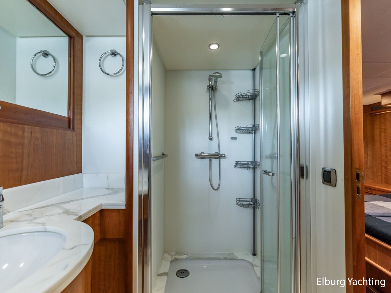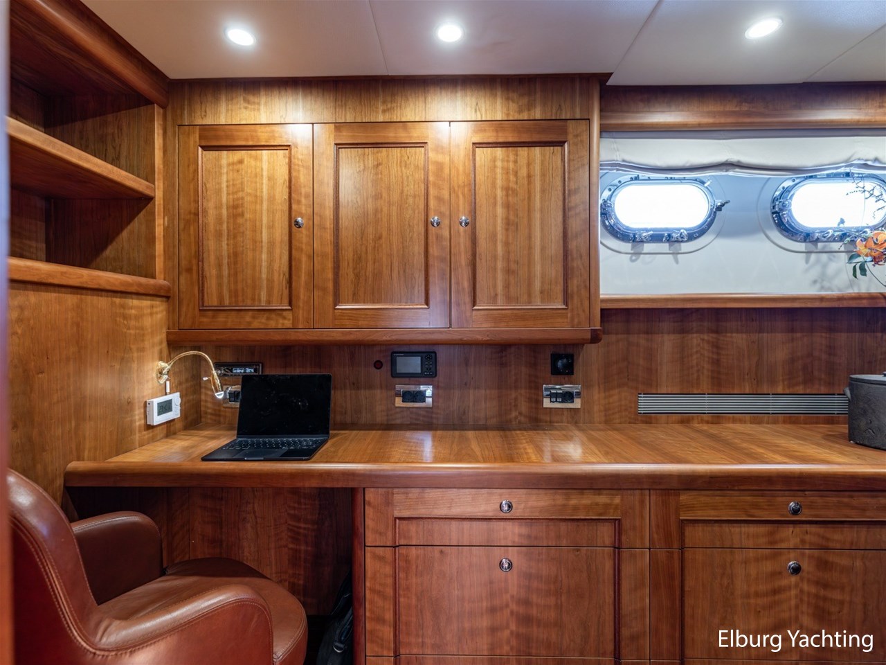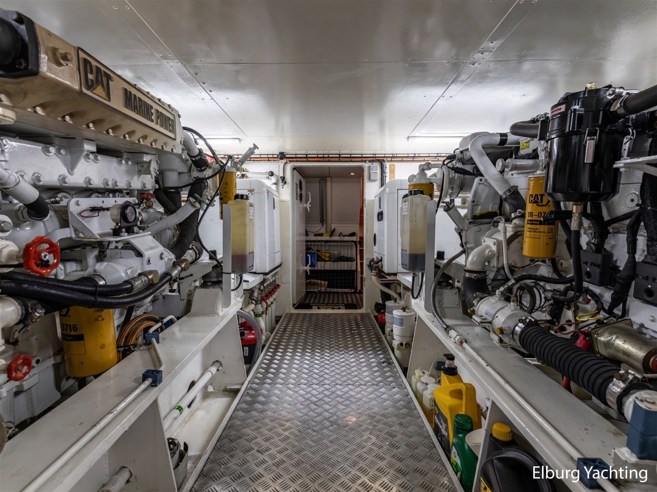 Het jacht beschikt over 3 luxe hutten en een crew cabin. Het interieur in kersenhout en wengé vloer, in combinatie met moderne technologie: Raymarine Axiom-systeem, Naiad stabilisatie, hydraulische transomdeur, passerelle, airconditioning en generatorsets. De brandstoftanks van ca. 7.200 L en vers watercapaciteit van ca. 2.500L garanderen lange zeereizen met comfort.