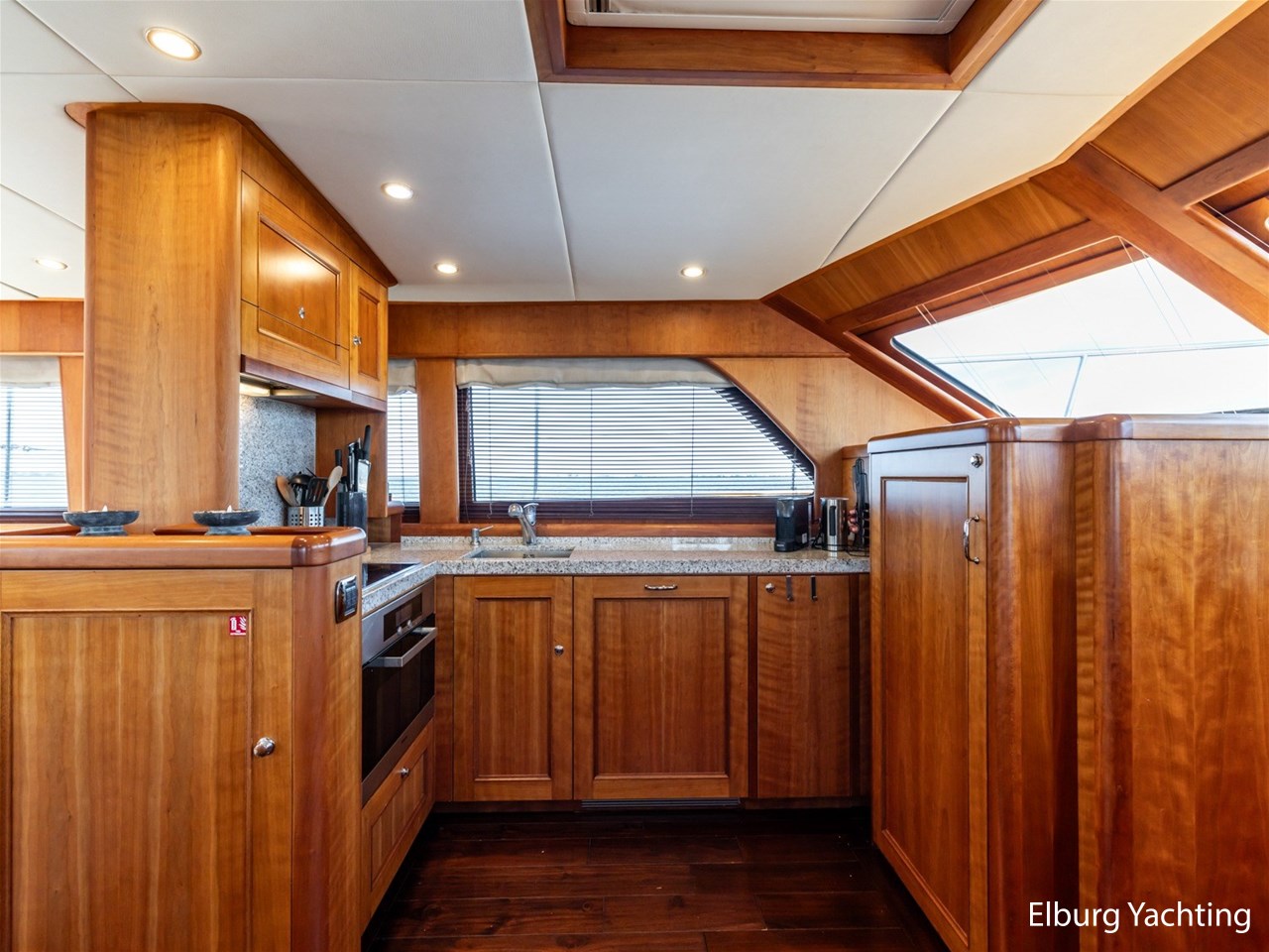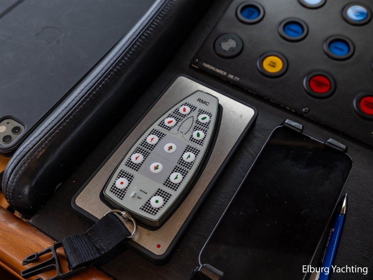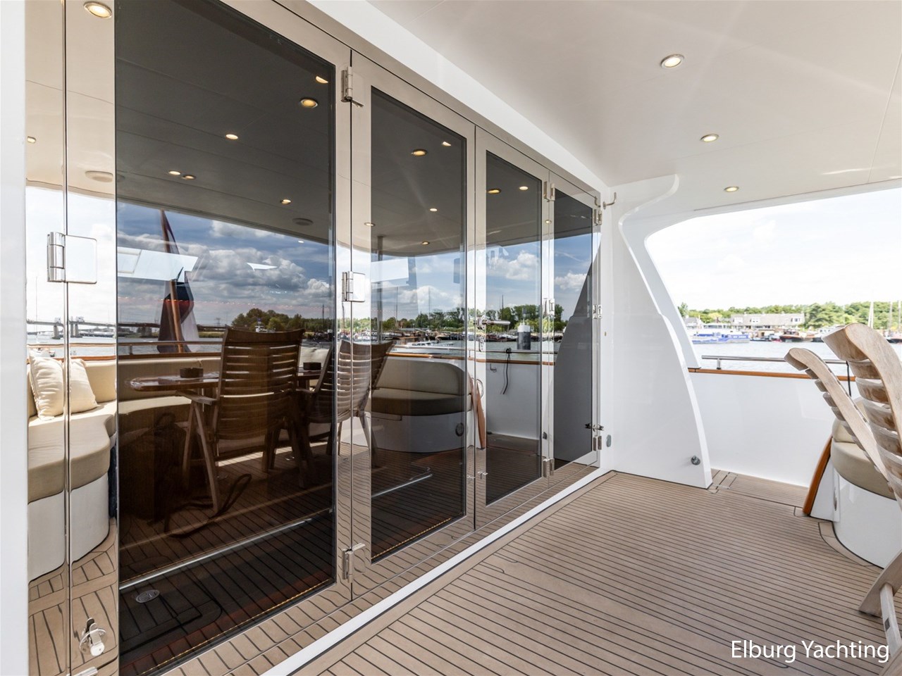 Het jacht beschikt over 3 luxe hutten en een crew cabin. Het interieur in kersenhout en wengé vloer, in combinatie met moderne technologie: Raymarine Axiom-systeem, Naiad stabilisatie, hydraulische transomdeur, passerelle, airconditioning en generatorsets. De brandstoftanks van ca. 7.200 L en vers watercapaciteit van ca. 2.500L garanderen lange zeereizen met comfort.