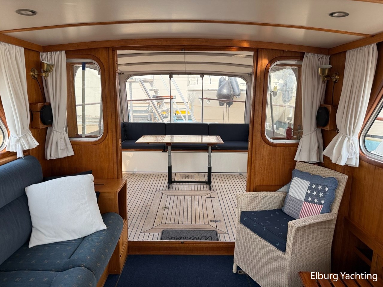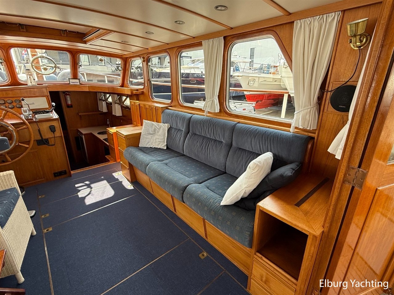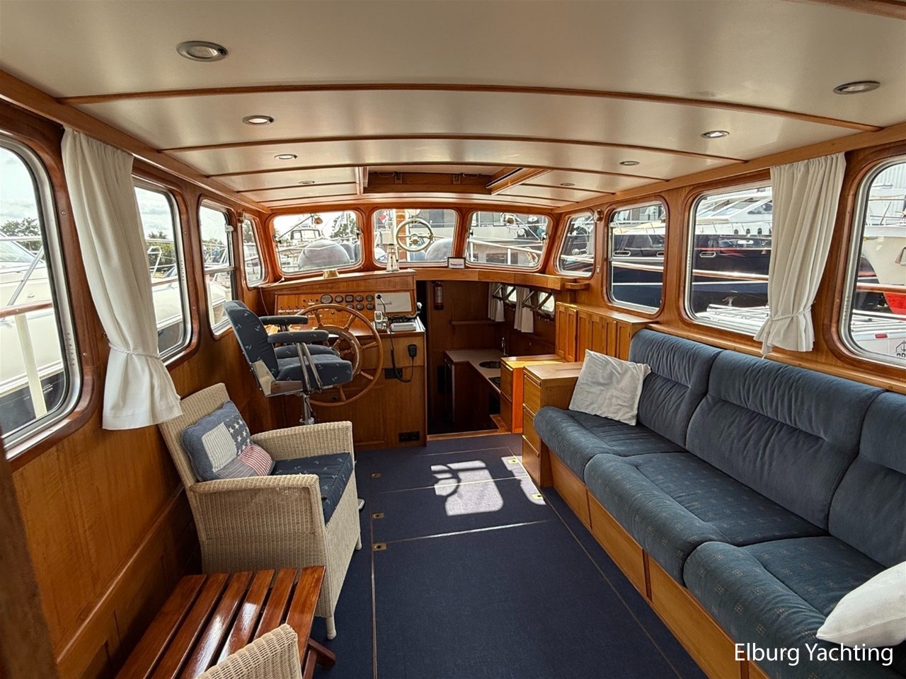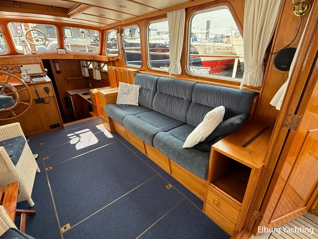 - Scheeps Teakhouten interieur met blauwe bekleding en recente blauwe vloerbedekking