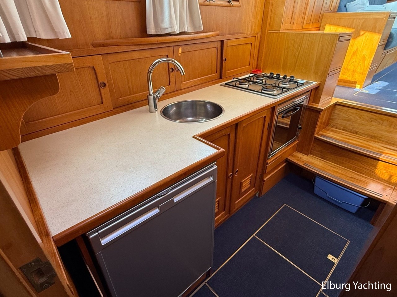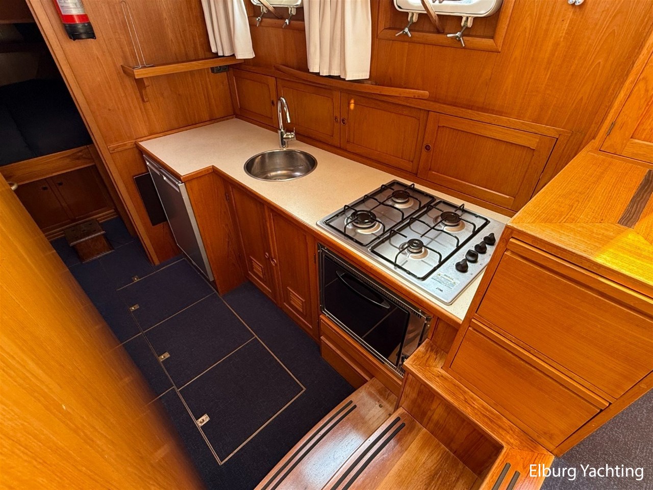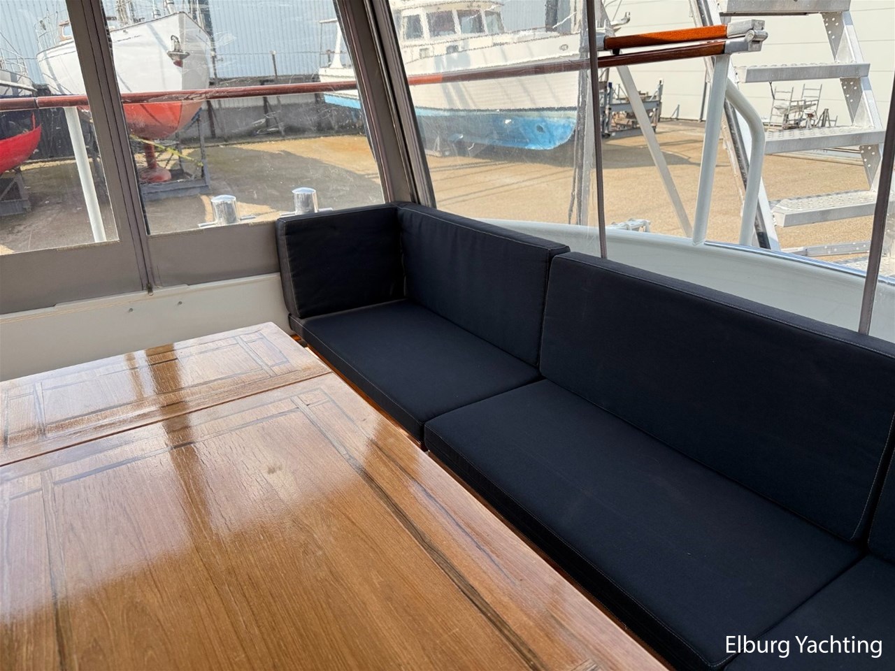 - Scheeps Teakhouten interieur met blauwe bekleding en recente blauwe vloerbedekking