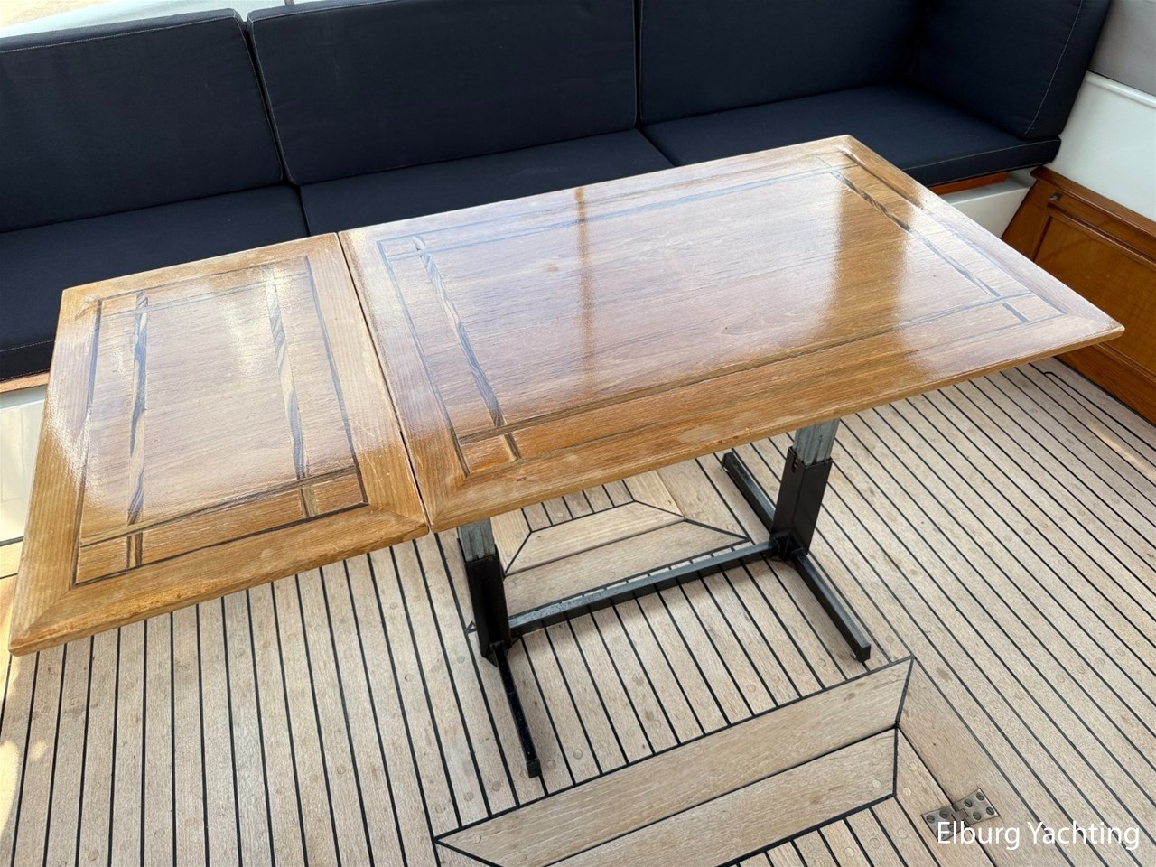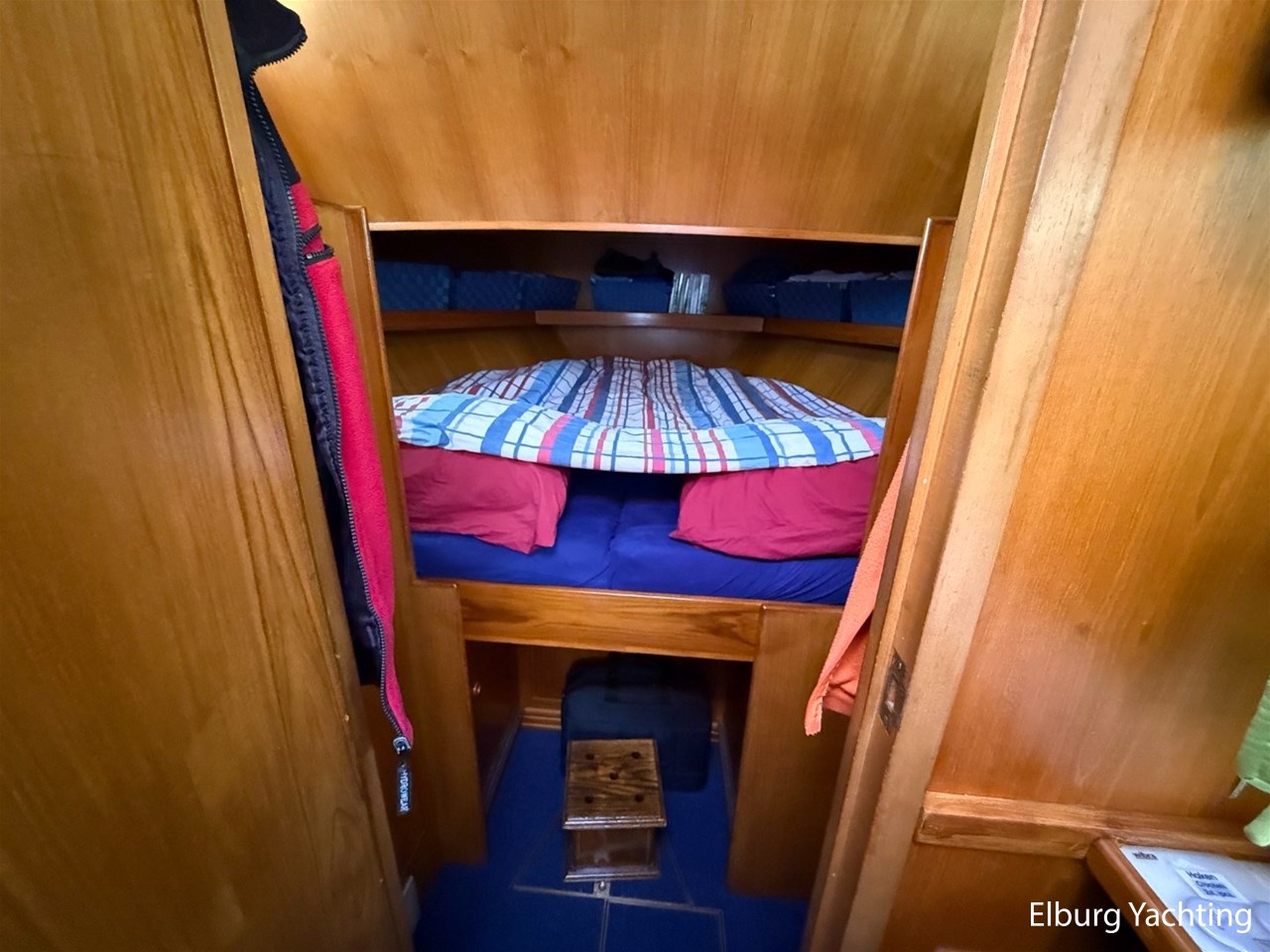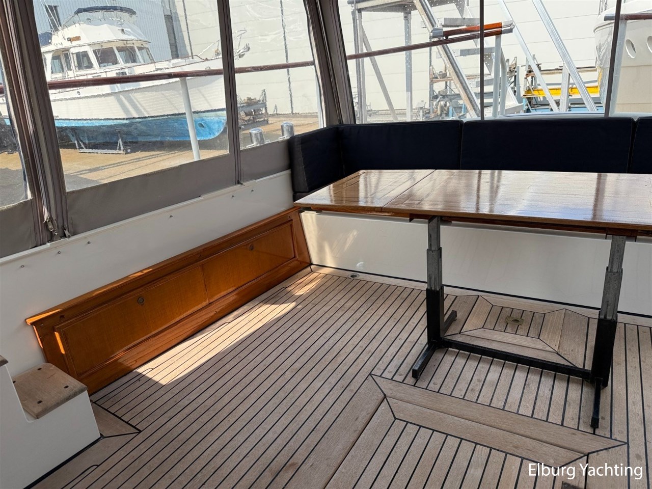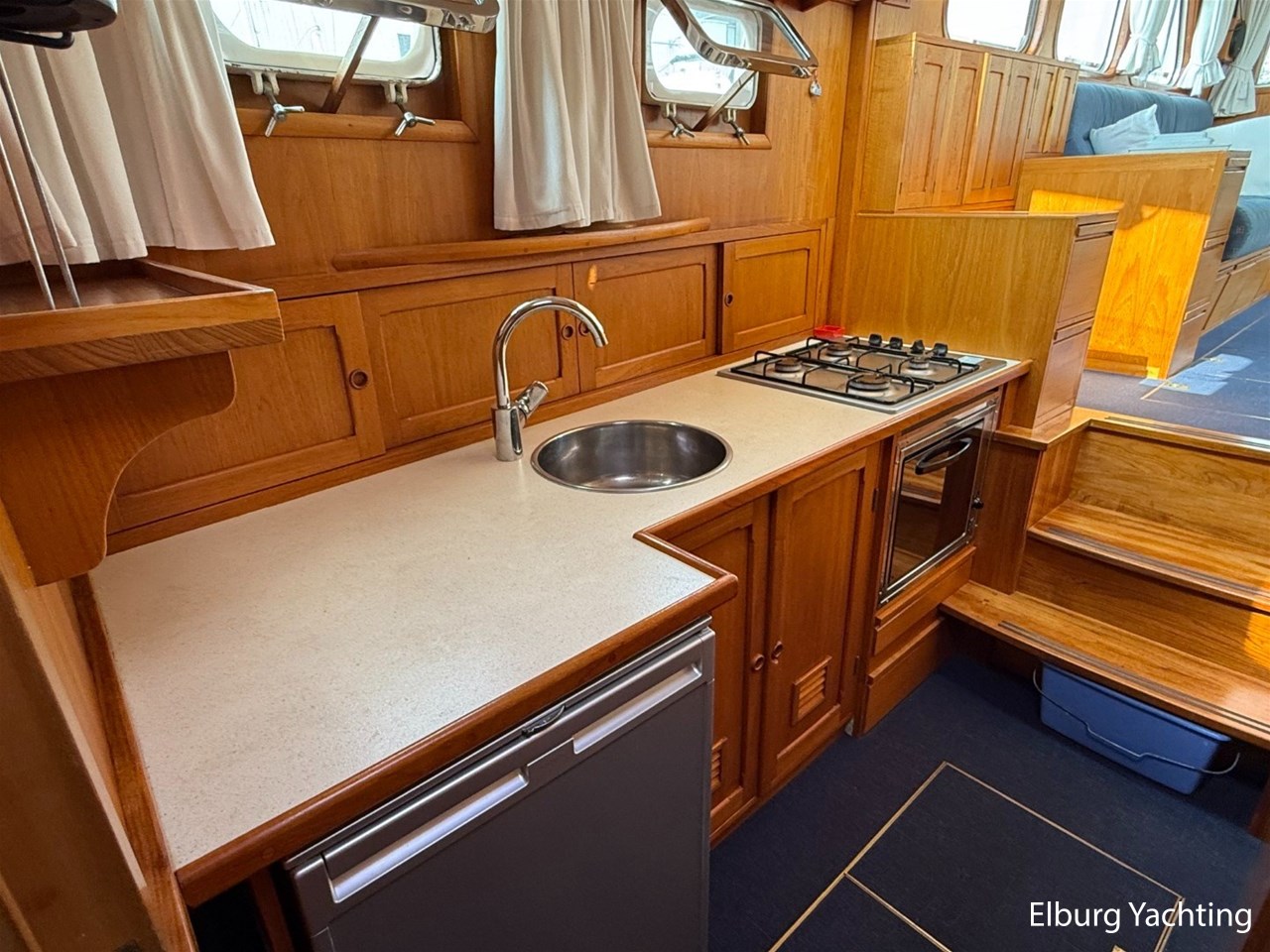 - Scheeps Teakhouten interieur met blauwe bekleding en recente blauwe vloerbedekking
