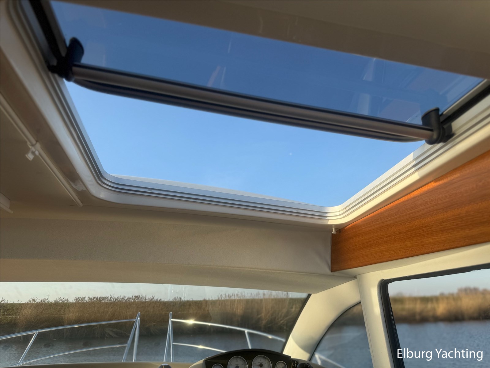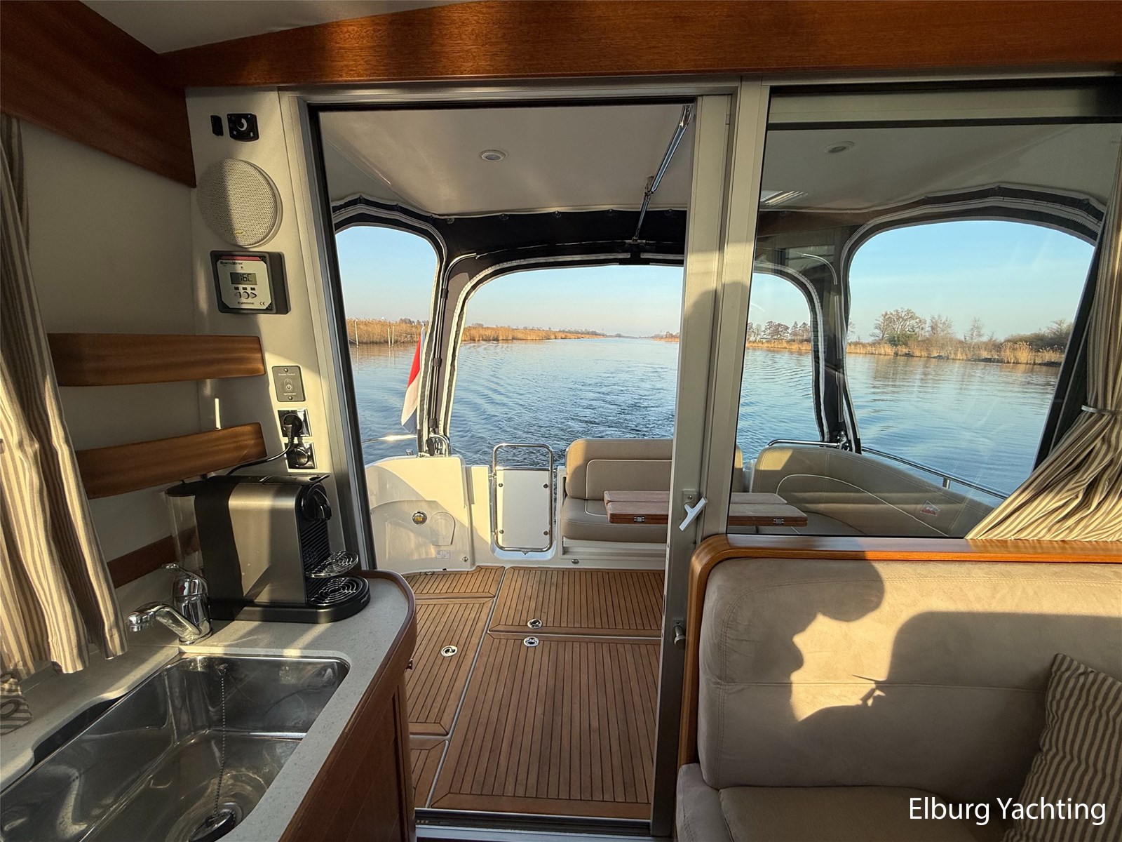 De Nimbus 335 beschikt over een ruime en verzorgde kuip, waarin comfort en functionaliteit mooi samenkomen. De zitbank met kussens nodigt uit tot ontspannen momenten aan boord, terwijl de diepe opbergbak praktische bergruimte biedt. Dankzij de volledig afsluitbare kuiptent is deze buitenruimte ook bij minder weer een prettige plek om te verblijven. Via een gemakkelijke doorgang bereikt u het zwemplatform. De salon is bereikbaar via een schuifdeur en biedt aan stuurboordzijde de kombuis en de stuurstand. De stuurstand is voorzien van een handige deur naar het gangboord. Aan bakboord bevindt zich een comfortabele dinette met in hoogte verstelbare tafel. Voorin, tegenover de stuurstand, is een klapbare meevaarbank aanwezig met een uitschuifbare tv. De combinatie van mahoniehouten betimmering en lichte bekleding geeft het interieur een warme, stijlvolle Scandinavische uitstraling. In 2025 zijn onder andere het toilet, de radar, omvormer, marifoon, Fusion-radio en de matrassen vernieuwd. De warmtewisselaar is gereviseerd. In 2025 is het schip voorzien van nieuwe antifouling en is er een uitgebreide poets- en polijstbeurt uitgevoerd. De motor kreeg in 2025 een onderhoudsbeurt en de plotter werd vervangen in 2023. Grote luiken in de kuipvloer zorgen voor uitstekende toegang tot de motorruimte, bergruimte en technische installaties. Het gemiddeld brandstofverbruik (5-6 knopen varen) bedroeg circa 3 liter per uur. Met originele Nimbus-details zoals het servies, een chique dubbele RVS zeerailing en een doordachte indeling is dit jacht een compleet geheel. Volledige documentatie beschikbaar.