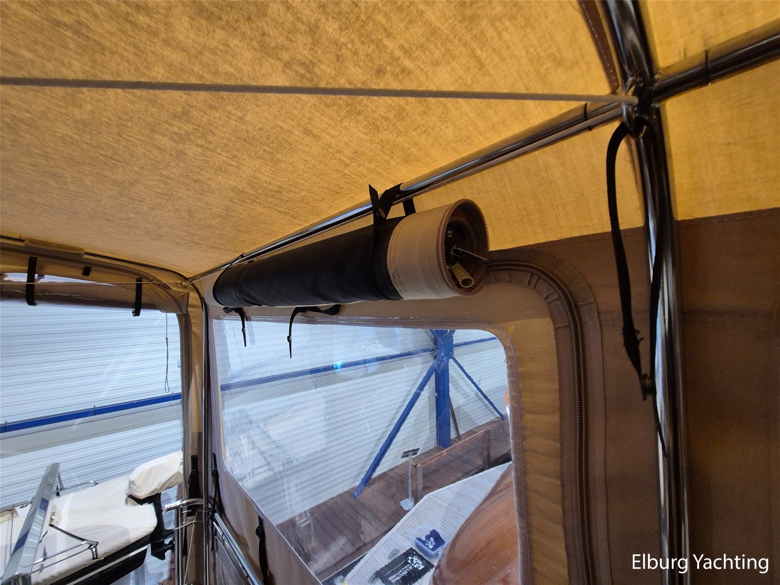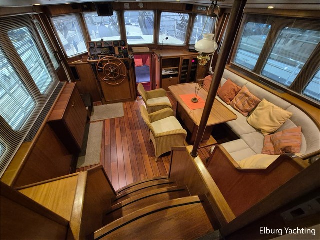 Verder voorzien van o.a. een complete tent over het achterdek, met uitritsbare delen, salon voorzien van dakluik en muggenhorren, voorkajuit in 2015 omgebouwd naar frans bed met veel opbergruimte, ventilatieroosters onder de bedden, blindering (geheel gewassen en nagelopen zomer 2025), een hydraulisch klapbare mast, Intellion TV (2015), Wasdroger Candy (2015), blindering voor alle vensters, dekdouche, twee wateraansluitingen aan dek (voor en achter), davits met bijpassende bijboot, zij-instap in de zeereling en zijdeuren aan weerszijden van de opbouw. Het enorme achterdek kan dienen als buitenruimte of als serre, al naar gelang de wensen van de eigenaar is deze ruimte geheel of gedeeltelijk te overkappen. Diverse bakskisten met goed georganiseerde bergruimte completeren de functionaliteit. Onder een grote hoes loopplanken, schuifhouten voor de franse sluizen, en extra meubilair. Verder: dubbele bolders voor en achter, middenbolder, grote eettafel met stoelen op achterdek, salon voorzien van luxaflex rondom, dakluik, was-droogcombinatie, voorhut met zeer veel kastruimte (essentieel voor verre reizen of wonen aan boord), zeer overzichtelijke motorkamer waarbij alle componenten goed bereikbaar zijn, mangaten in de tanks en ontdreuningsplaatjes voor reductie van geluid, veiligheidsrailing rondom de motor, camera in de motorkamer, vaatwasser, goed uitgeruste en ruime kombuis met dinette ernaast, en eigenaarshut met veel daglicht en separate toilet en douche.