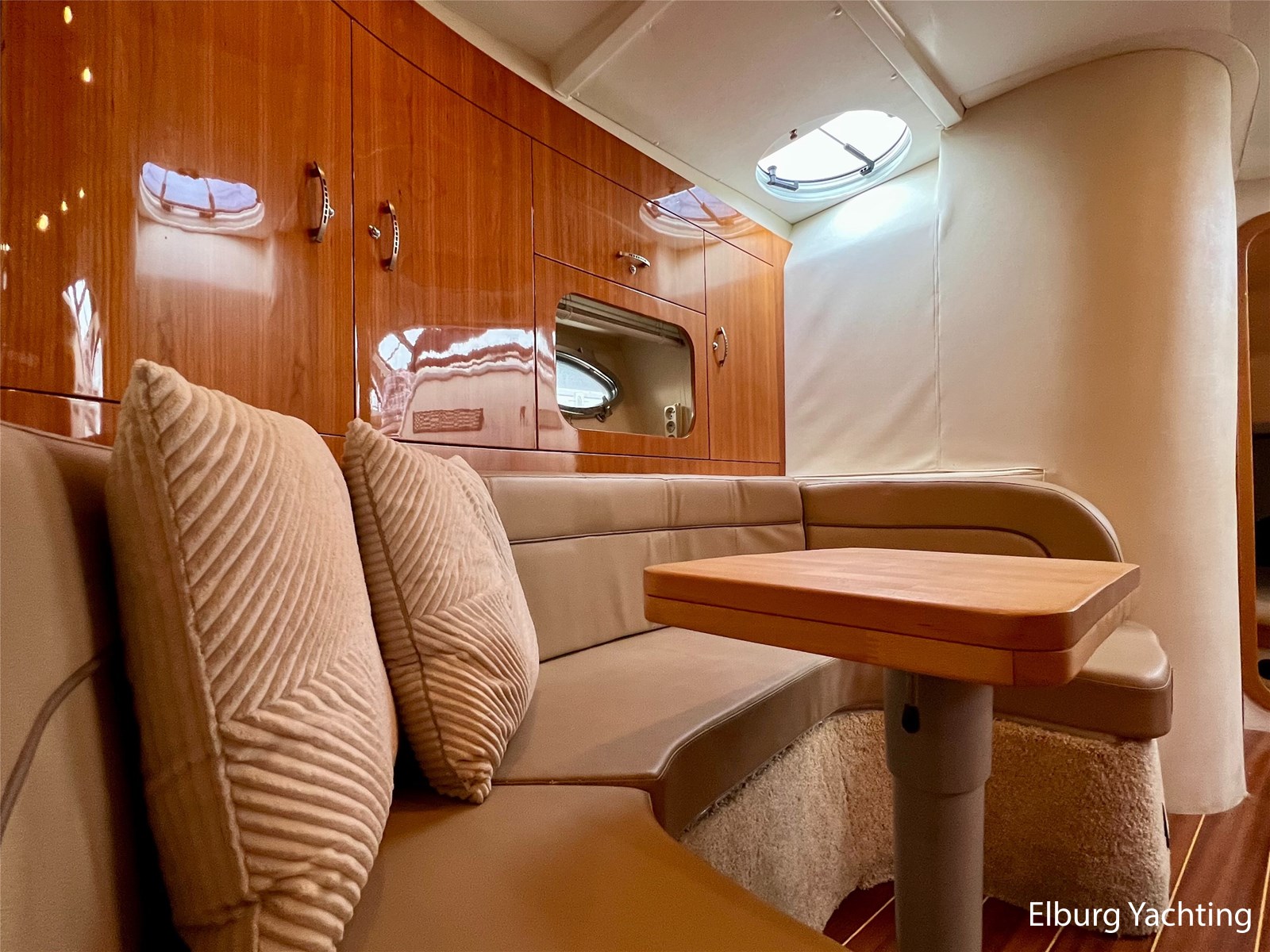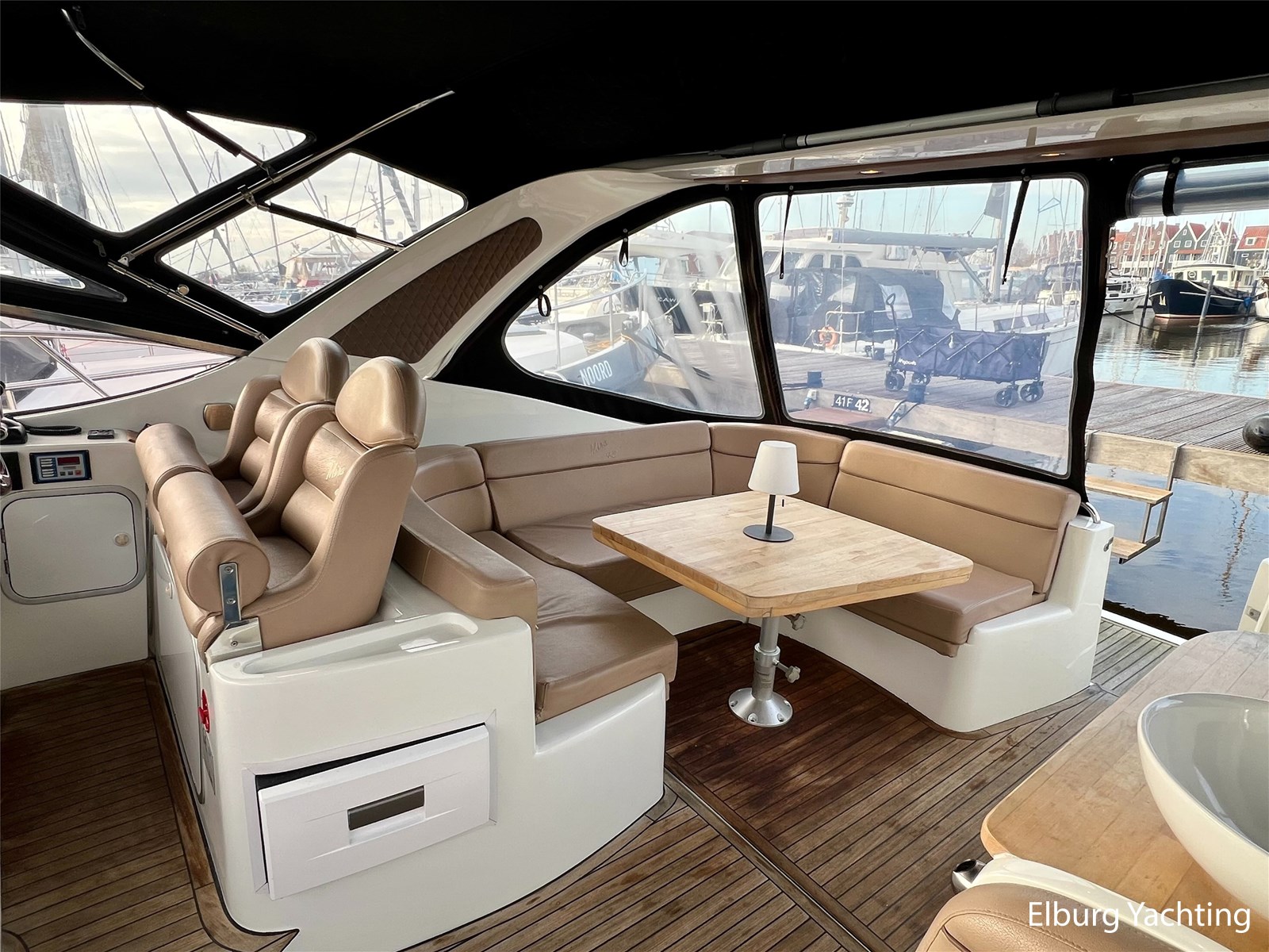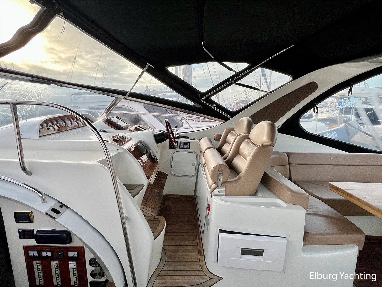 - Gelakt teak interieur met creme kleurige lederen bekleding, licht tapijt over teakvloer (niet verlijmd)