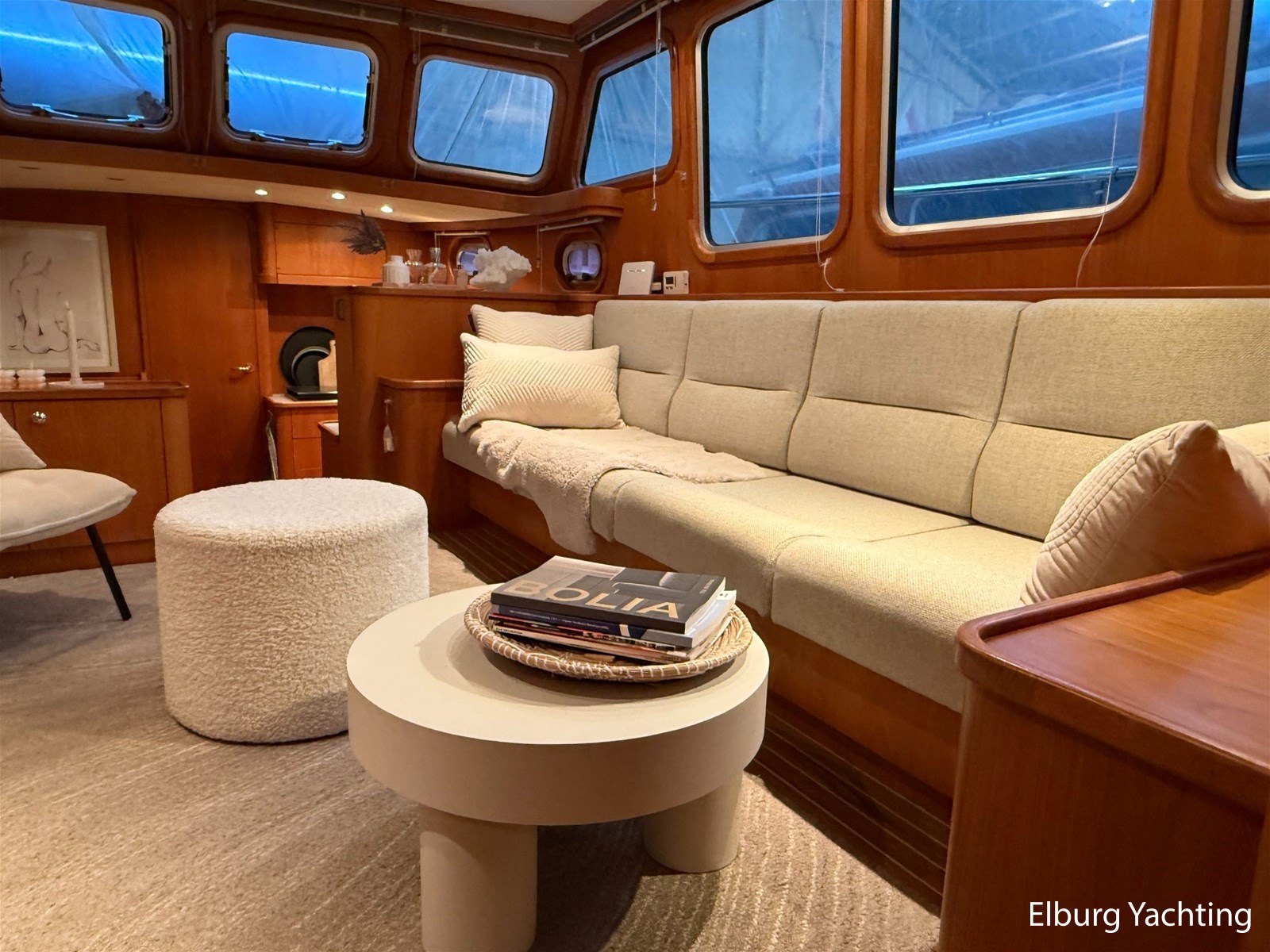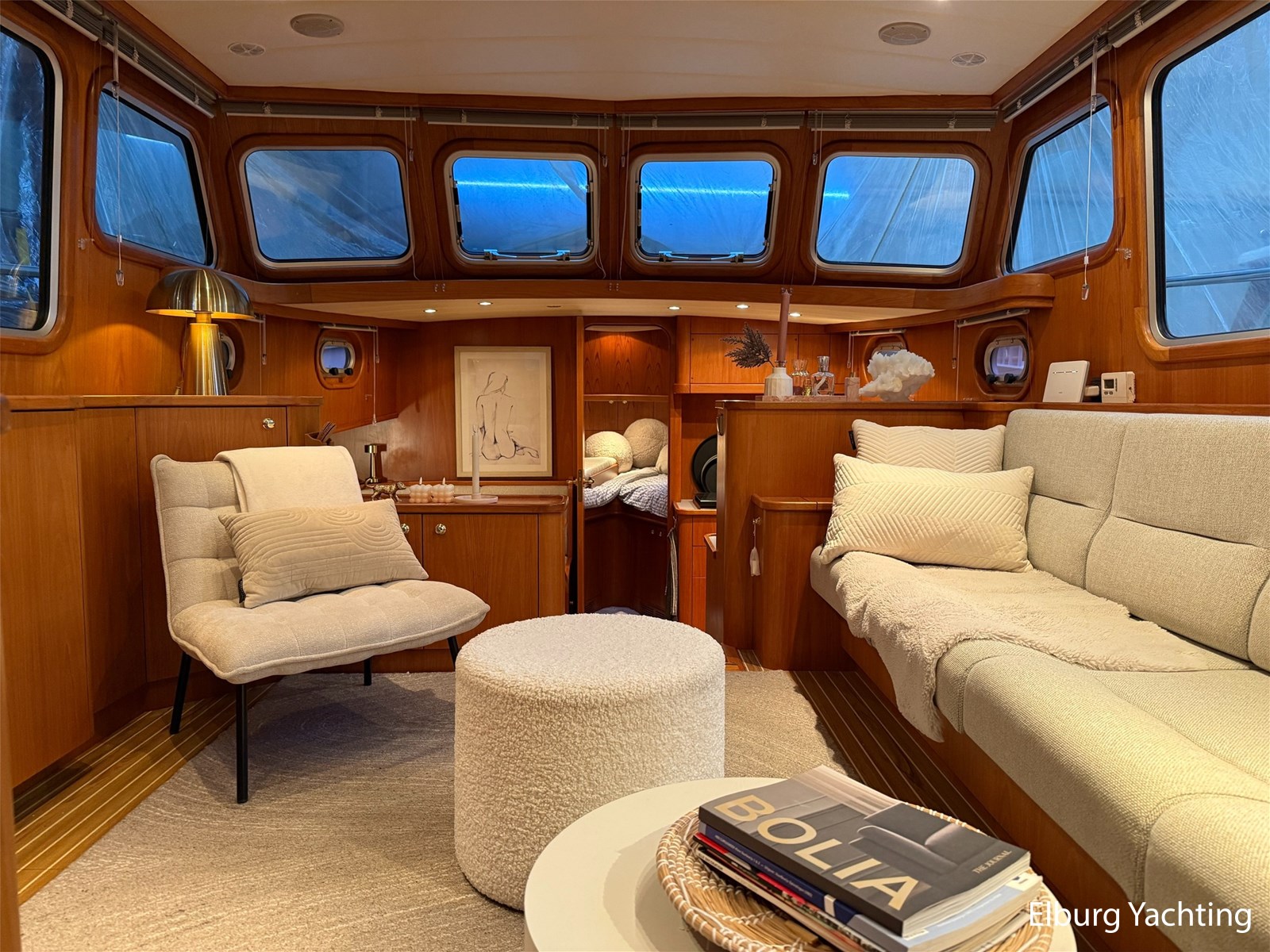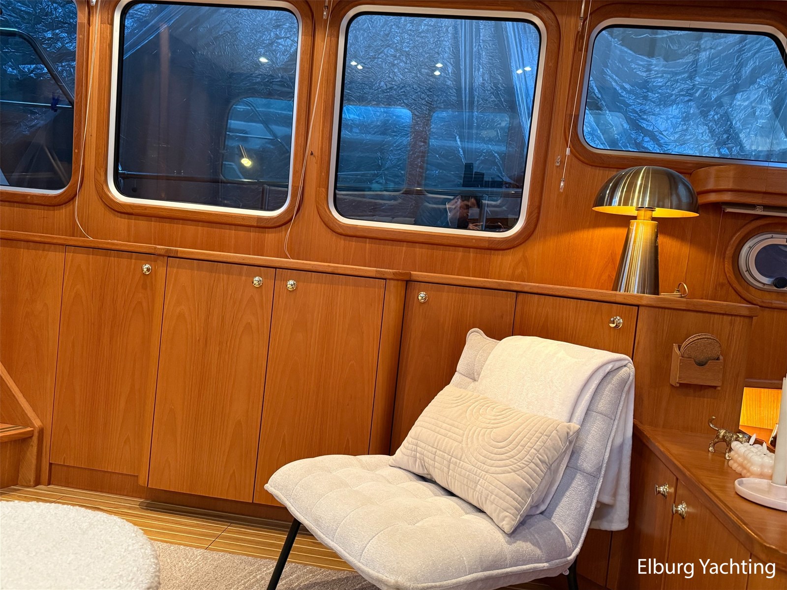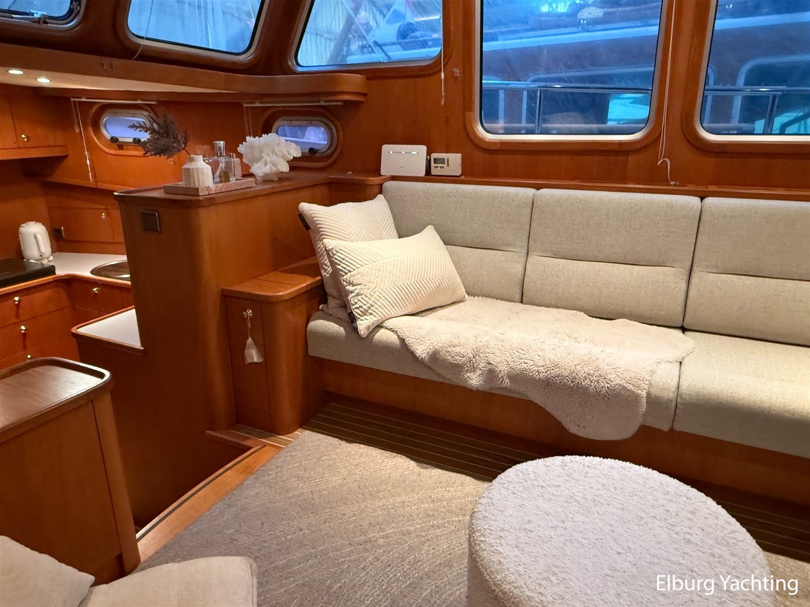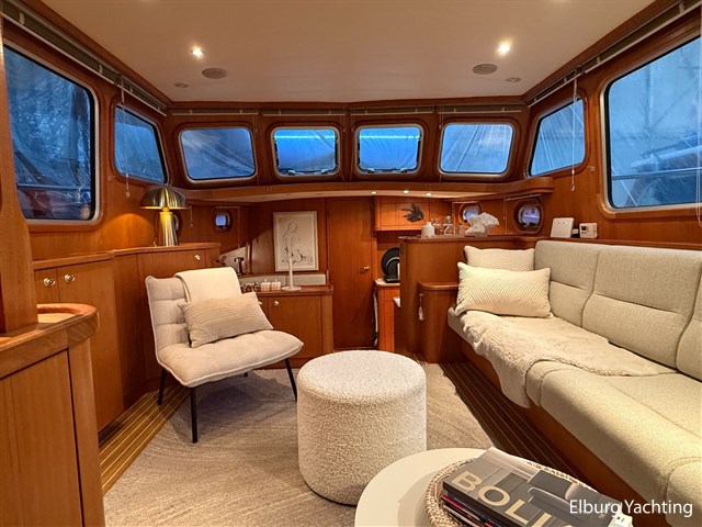 - Hoogwaardig Teakhouten interieur met ronde afwerking en nieuwe grijze stoffering (2024)