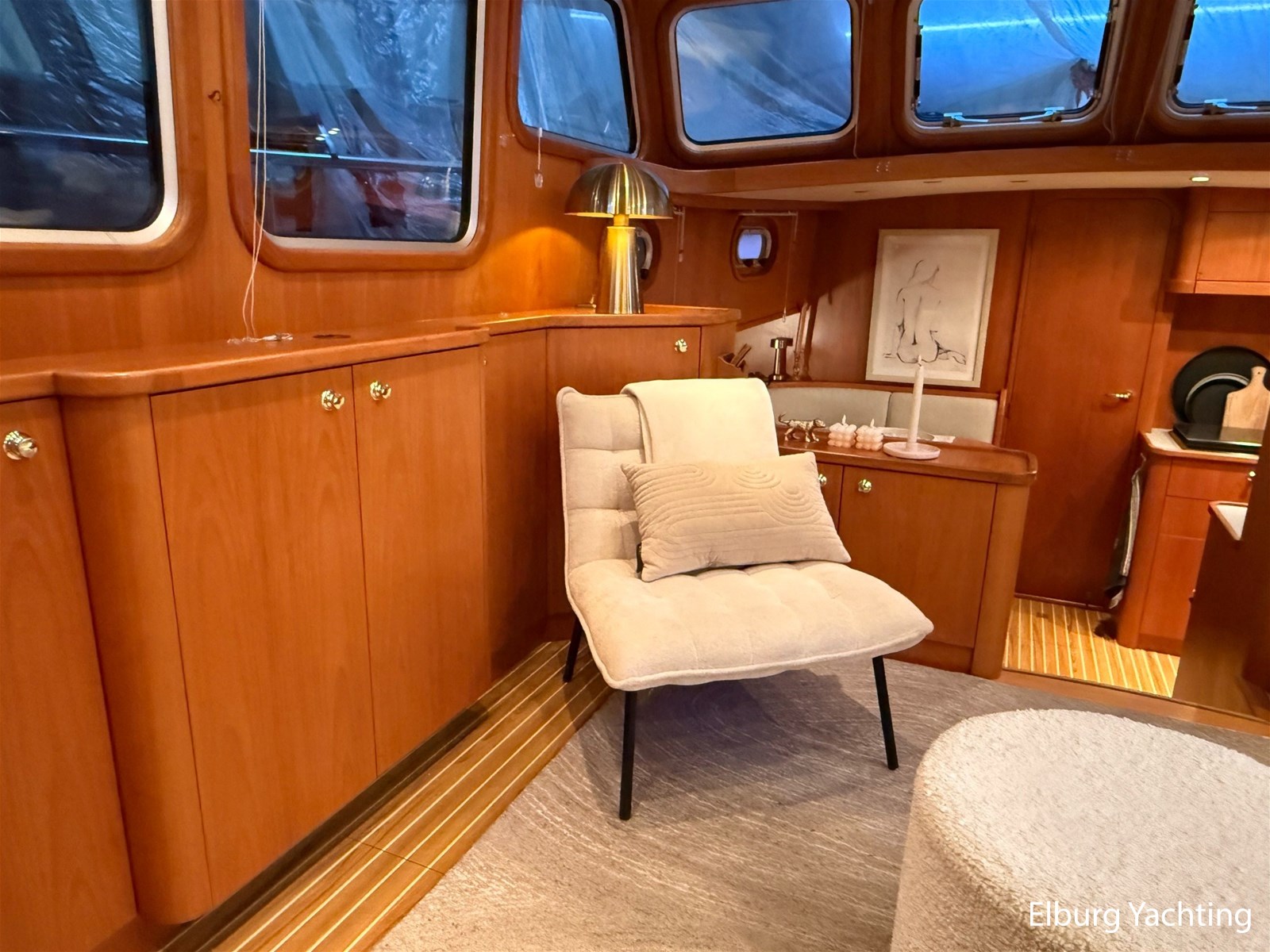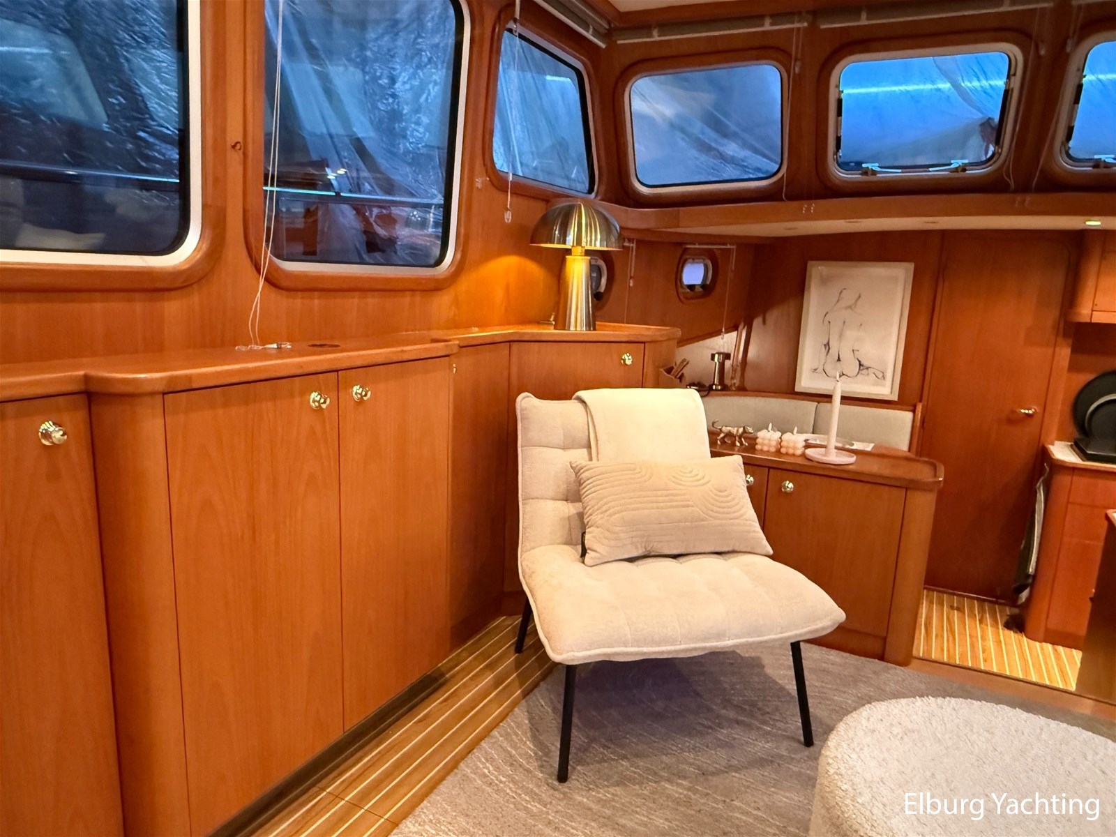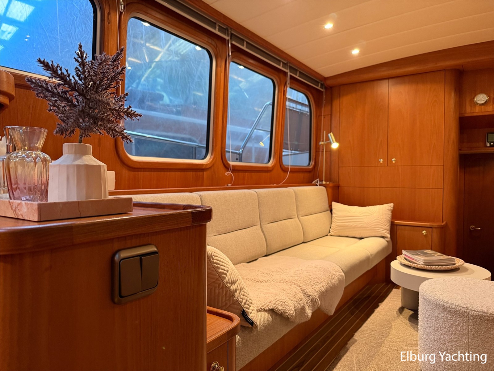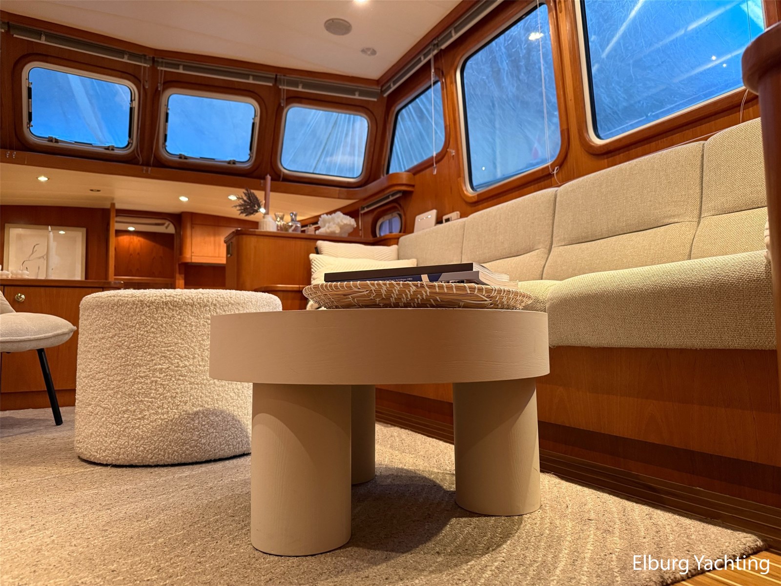 - Hoogwaardig Teakhouten interieur met ronde afwerking en nieuwe grijze stoffering (2024)