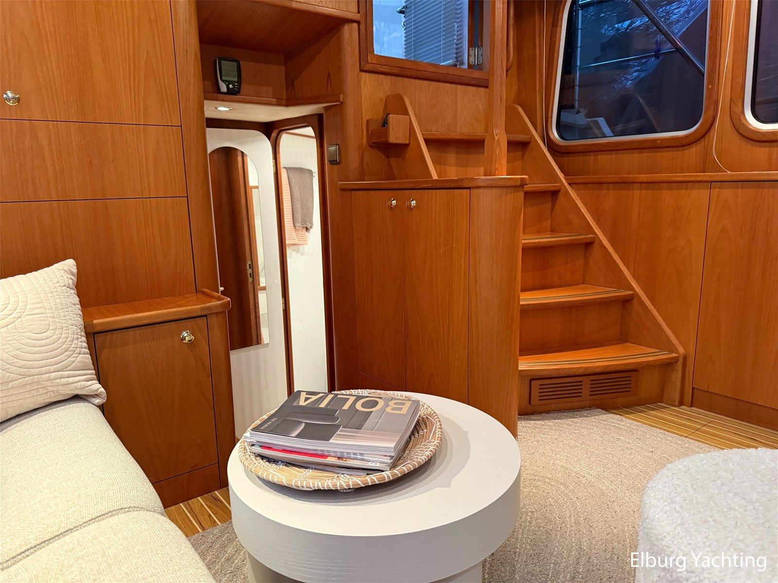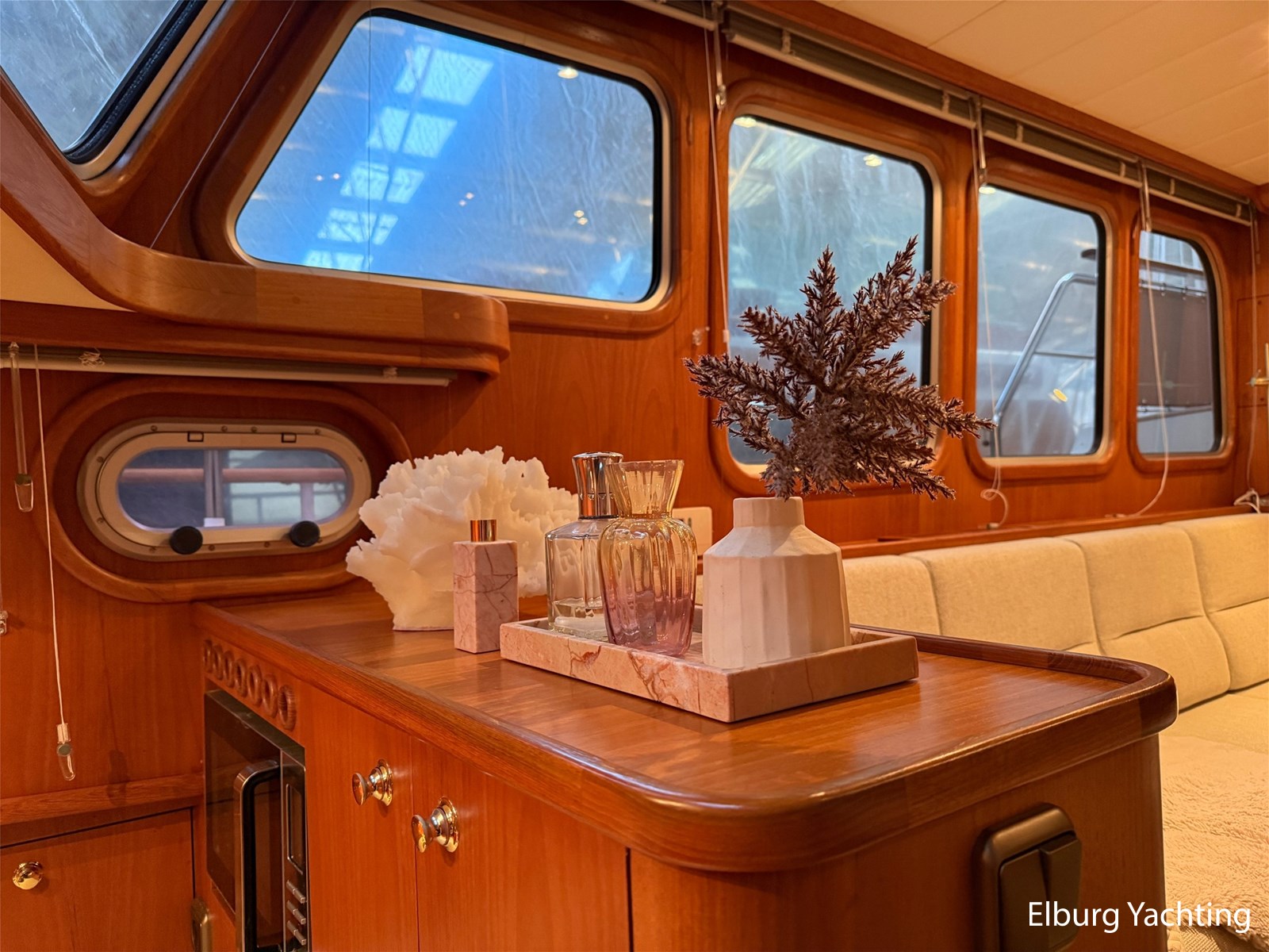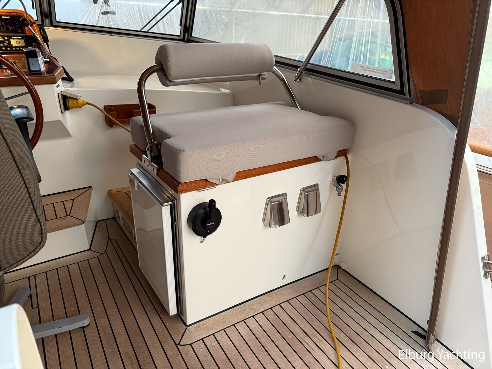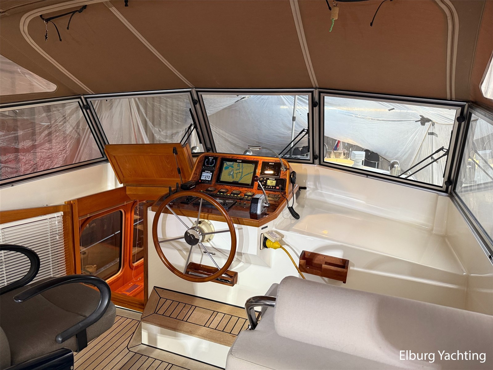 - Hoogwaardig Teakhouten interieur met ronde afwerking en nieuwe grijze stoffering (2024)