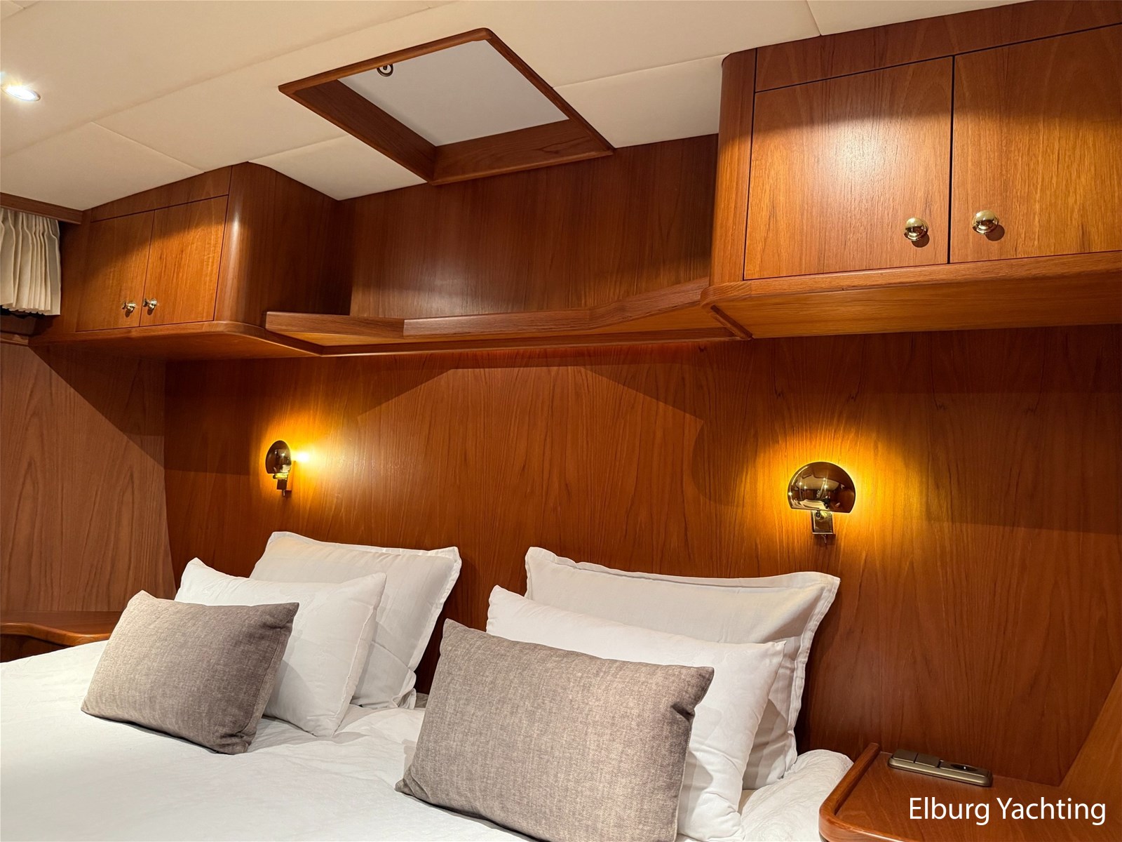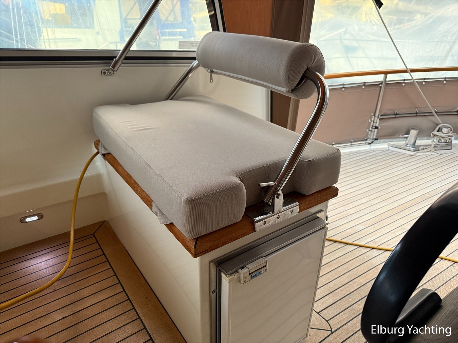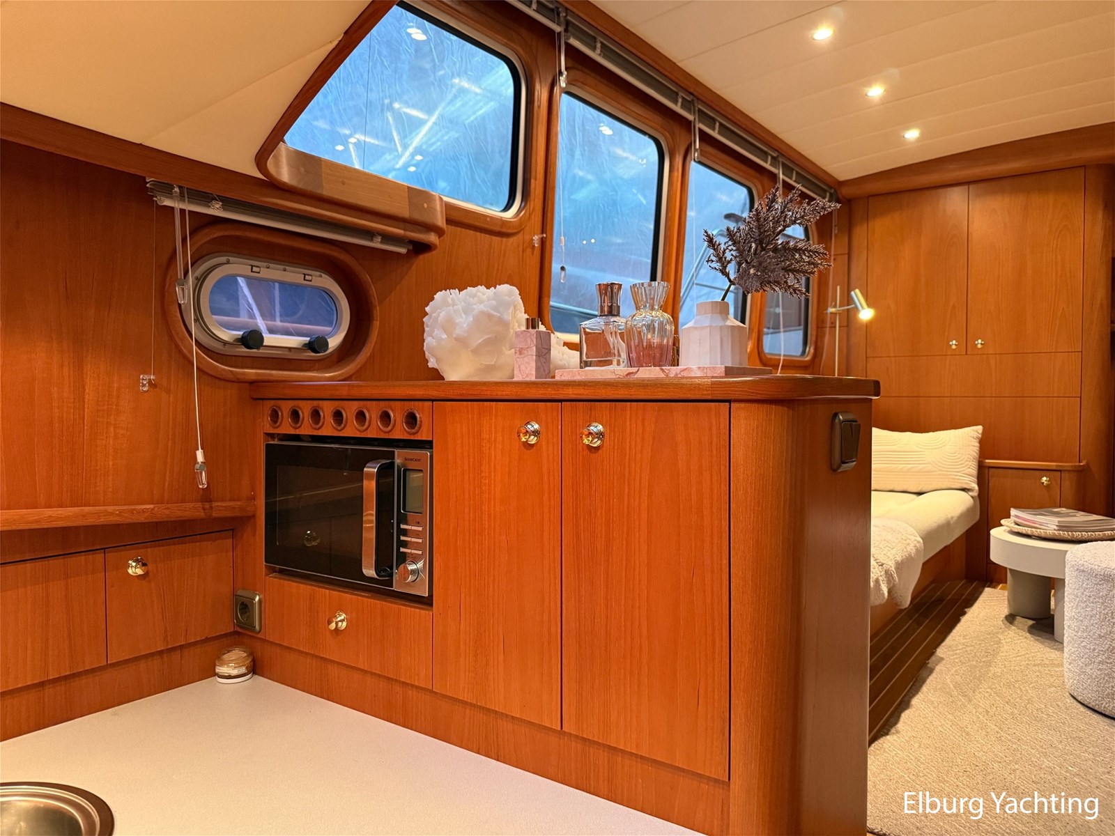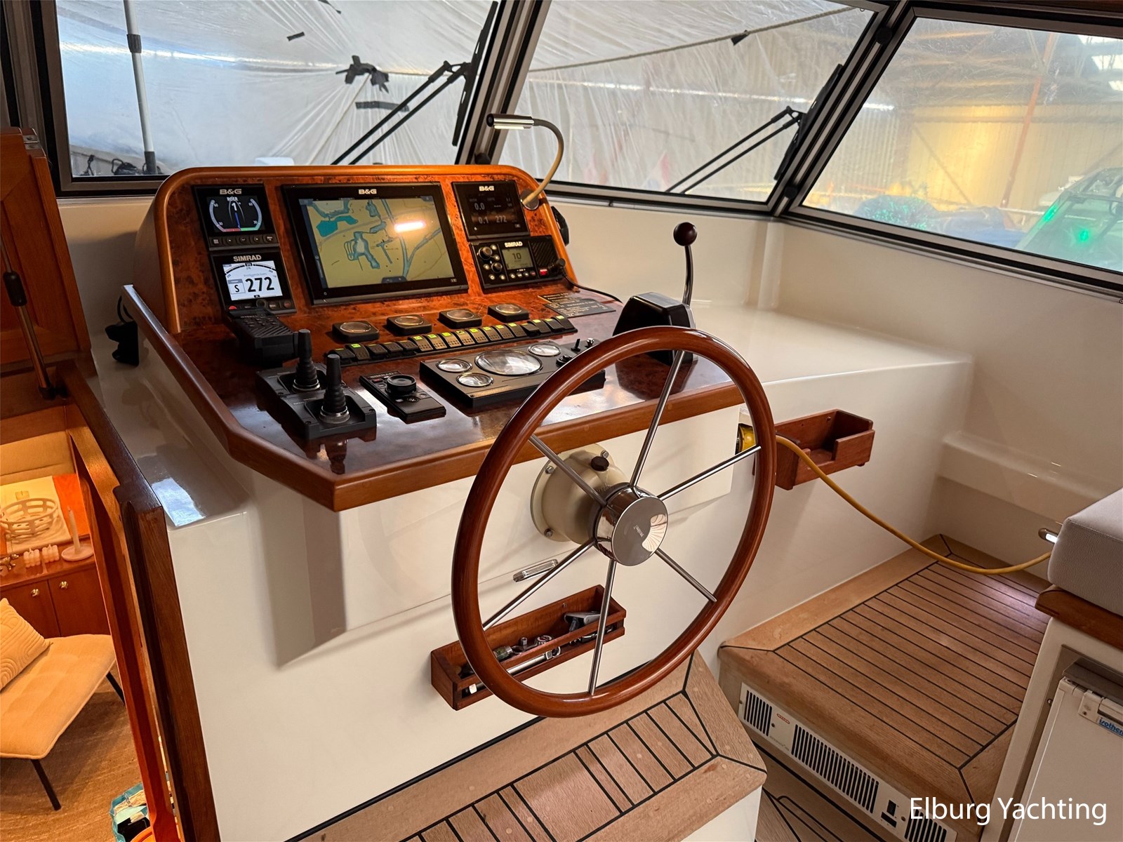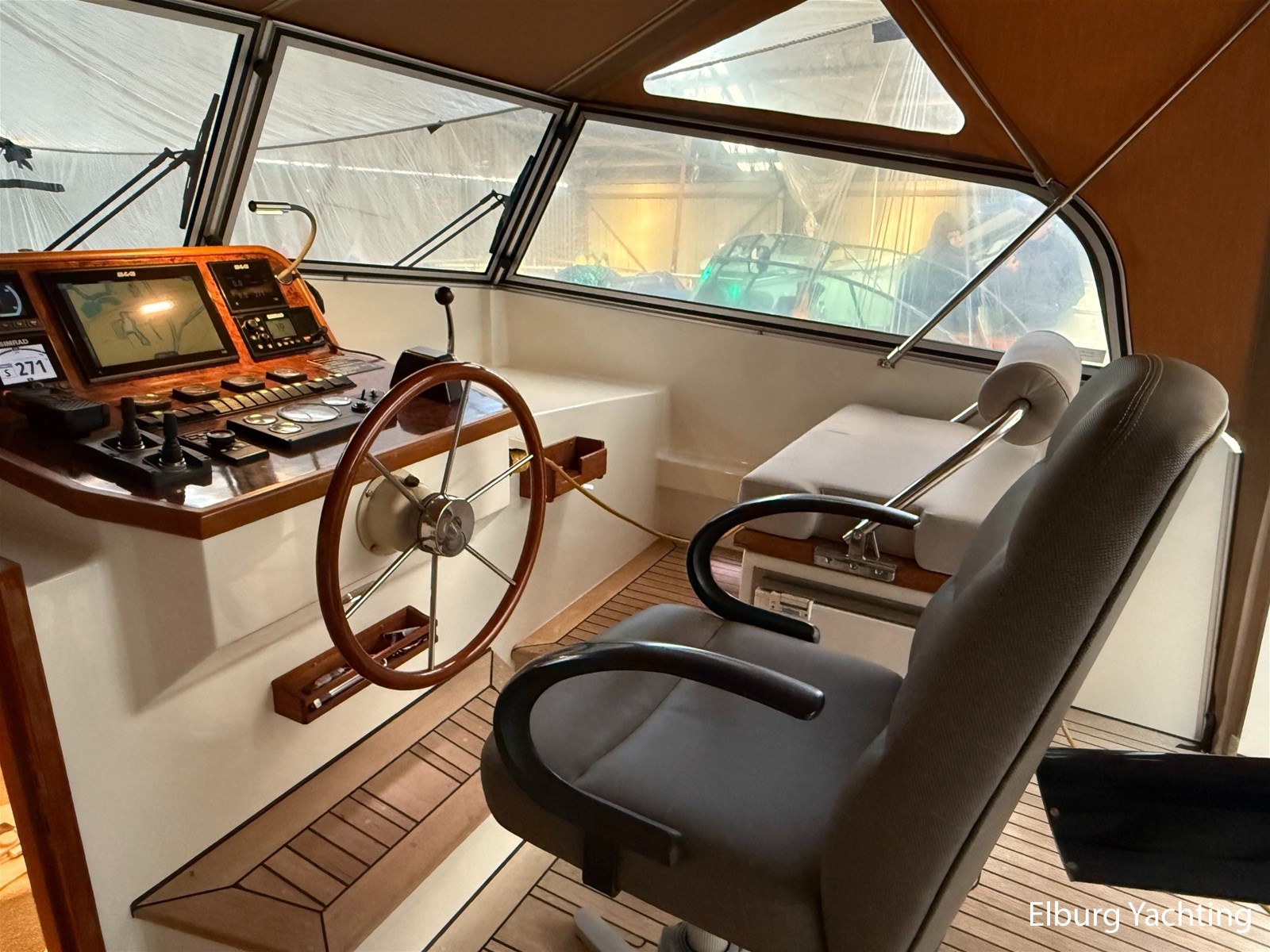 - Hoogwaardig Teakhouten interieur met ronde afwerking en nieuwe grijze stoffering (2024)
