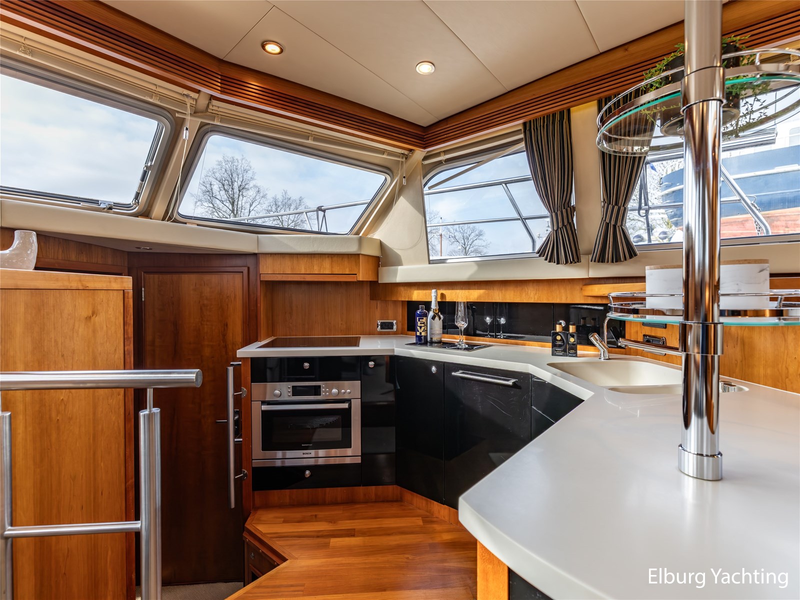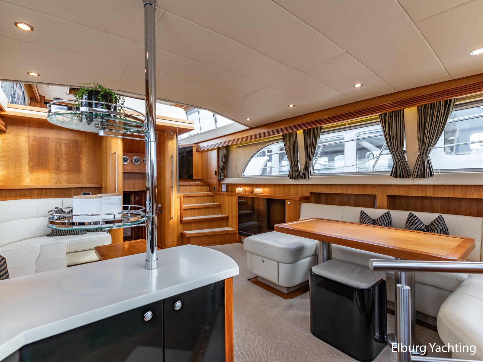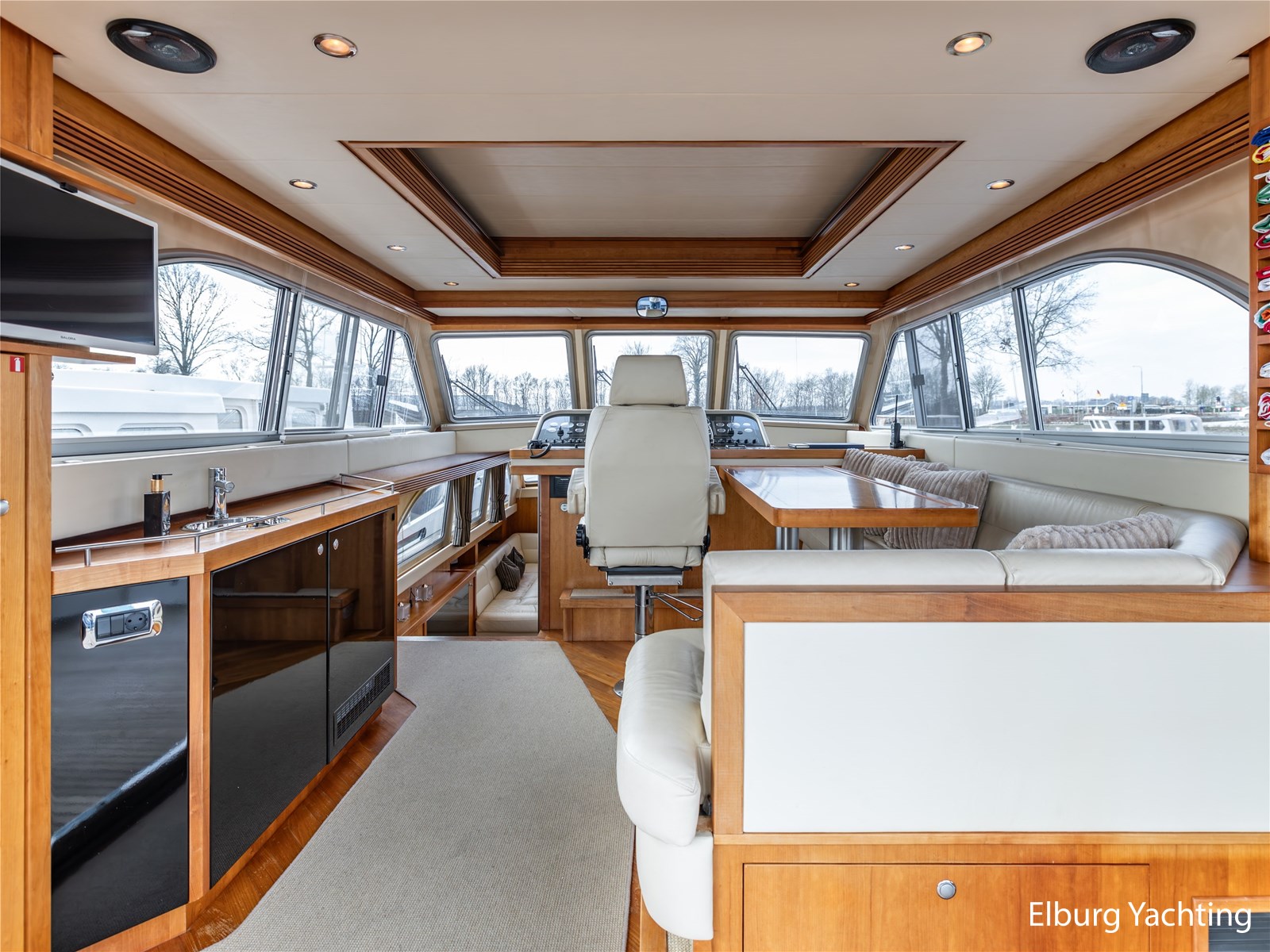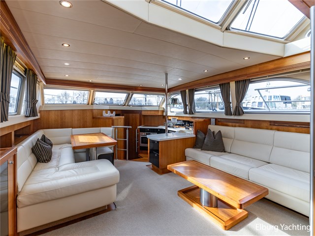 Vanuit de stuurhut loopt u via een niveauverschil naar de ruime salon, uitgevoerd in teak met crème-witte lederen bekleding en royale lichtinval dankzij de grote ramen. De salon is sfeervol verlicht met ingebouwde LED-verlichting en uitgerust met een flatscreen-tv, zodat ontspanning aan boord gegarandeerd is. Aansluitend bevindt zich, een niveau lager, de volledig uitgeruste kombuis. Deze keuken is voorzien van een Corian werkblad, keramische kookplaat, afzuigkap, Bosch oven, combimagnetron en dubbele koelkast. Alles is aanwezig om aan boord volwaardig te kunnen koken en leven.