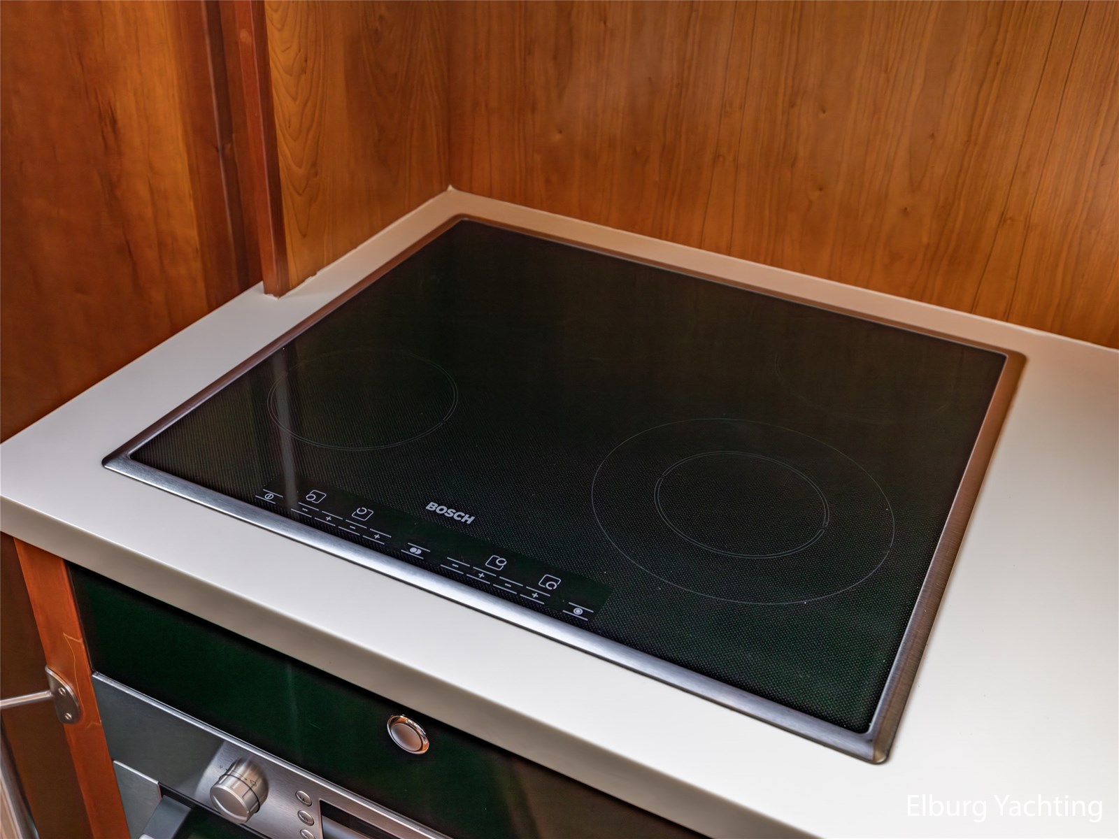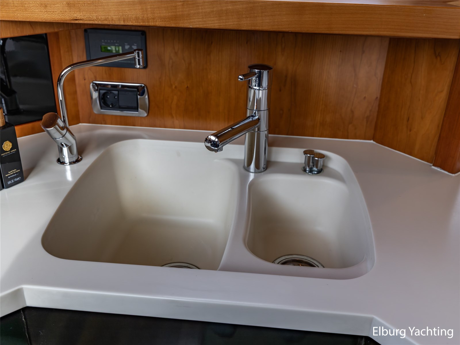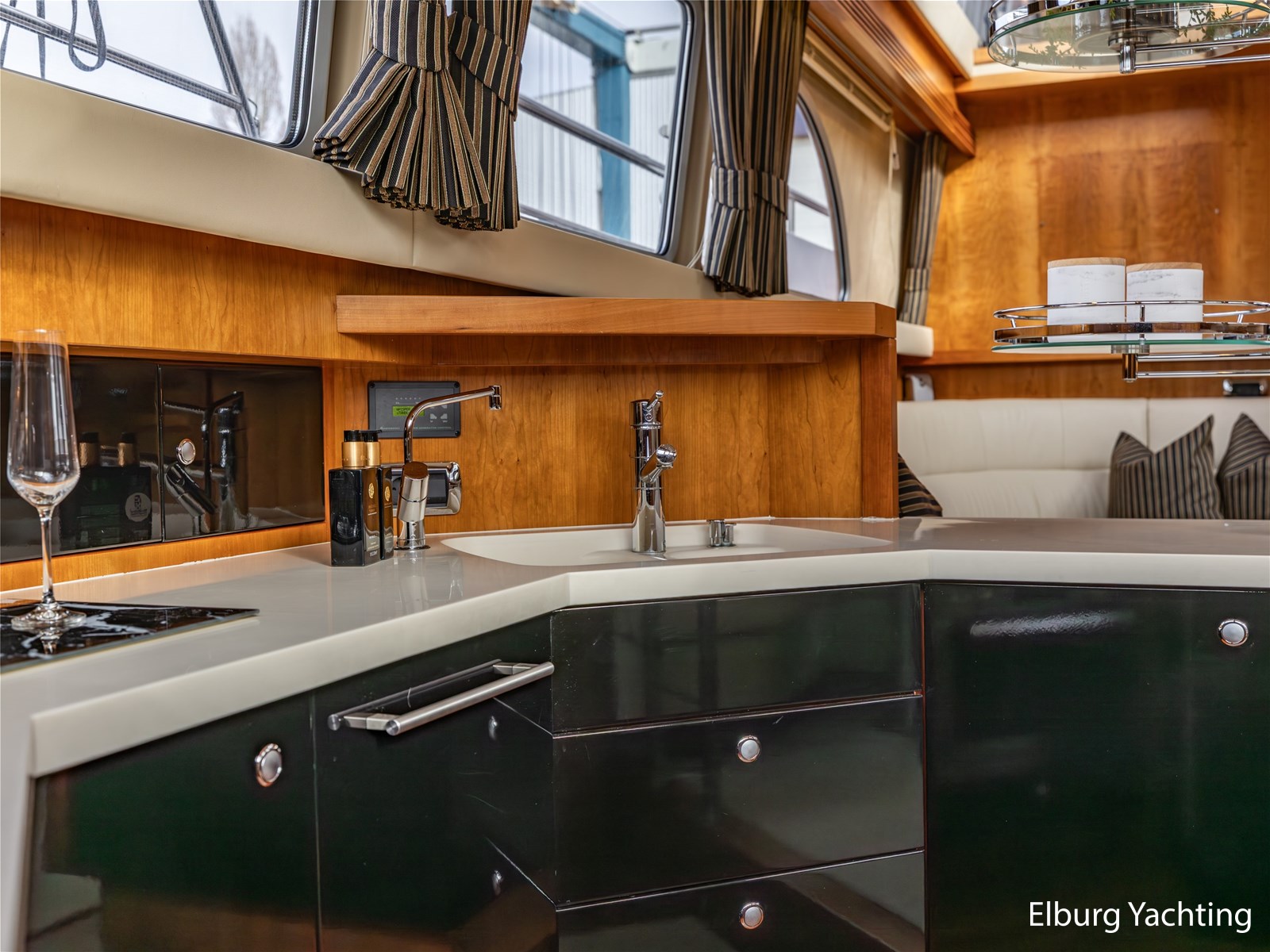 Vanuit de stuurhut loopt u via een niveauverschil naar de ruime salon, uitgevoerd in teak met crème-witte lederen bekleding en royale lichtinval dankzij de grote ramen. De salon is sfeervol verlicht met ingebouwde LED-verlichting en uitgerust met een flatscreen-tv, zodat ontspanning aan boord gegarandeerd is. Aansluitend bevindt zich, een niveau lager, de volledig uitgeruste kombuis. Deze keuken is voorzien van een Corian werkblad, keramische kookplaat, afzuigkap, Bosch oven, combimagnetron en dubbele koelkast. Alles is aanwezig om aan boord volwaardig te kunnen koken en leven.