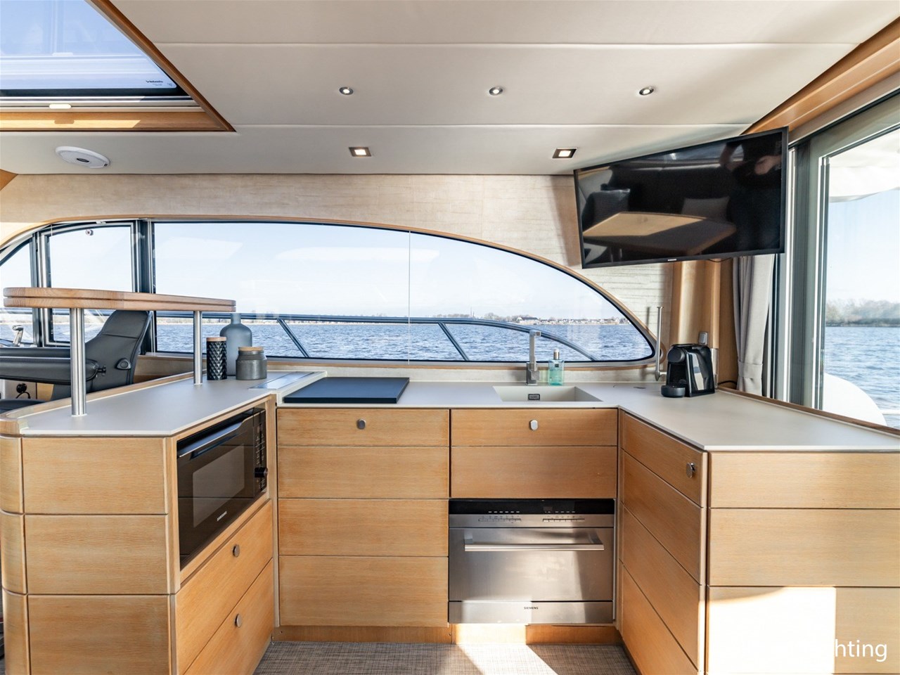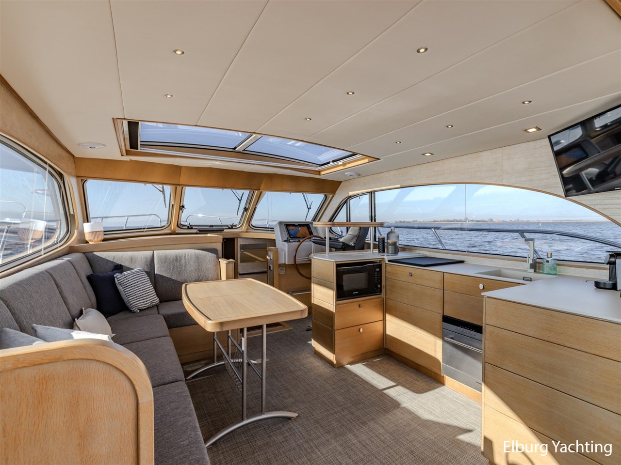 De keuken, stuurstand, 4-persoons eettafel en salonbank zijn opgenomen in een en dezelfde ruimte waardoor er veel contact mogelijk is. De aandrijving wordt verzorgd door een enkele 170 pk Vetus Deutz motor, dit zorgt voor een soepele toch krachtige manoeuvreerbaarheid in combinatie met een boeg- en hekschroef.