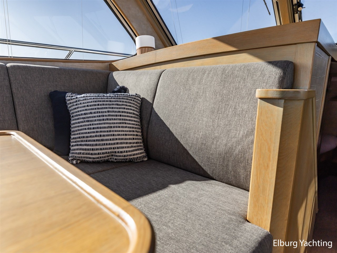 - Greywash eiken scheepsinterier + grijs stoffen bekleding