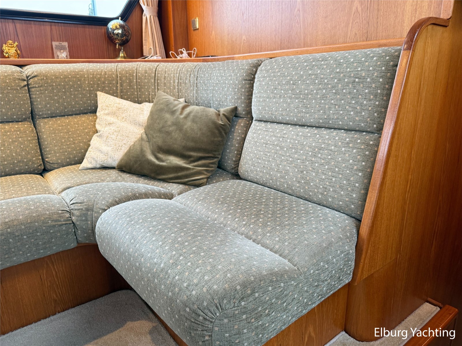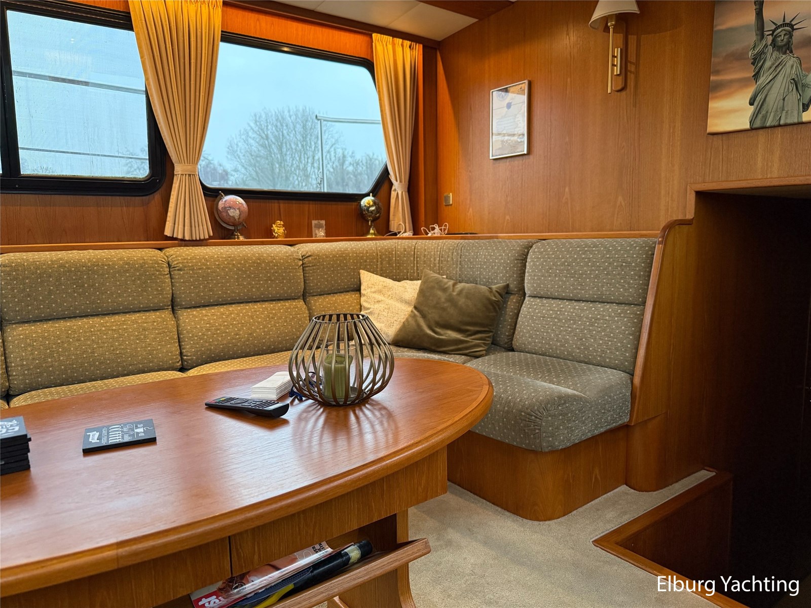 Binnen is het interieur van prachtig scheeps Teakhout in combinatie met bruine stoffen bekleding. Dit creëert een rustige ruimtelijke omgeving waar men heerlijk tot rust komt. Het jacht heeft een grote salon met comfortabele bank met tv en vloerbedekking. Verder naar voren de kombuis met daartegenover de dinette. Helemaal voorin is de voorhut met dubbel vrijstaand bed. Achter de salon via de luie trap naar beneden zijn de derde hut met stapelbed en daar tegenover de badkamer met elektrisch toilet, douche en wastafel gesitueerd en helemaal achterin zit de eigenaarshut met vrijstaand tweepersoons bed.