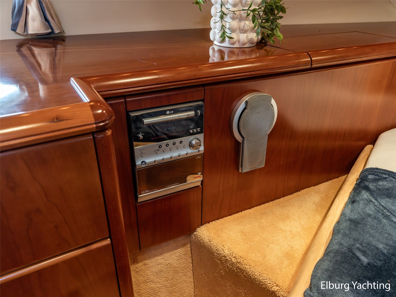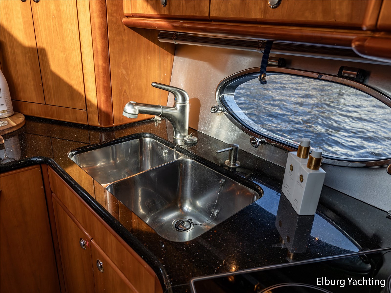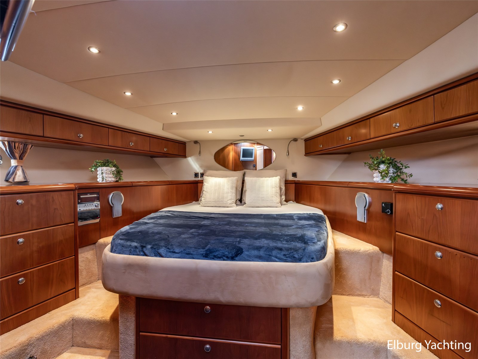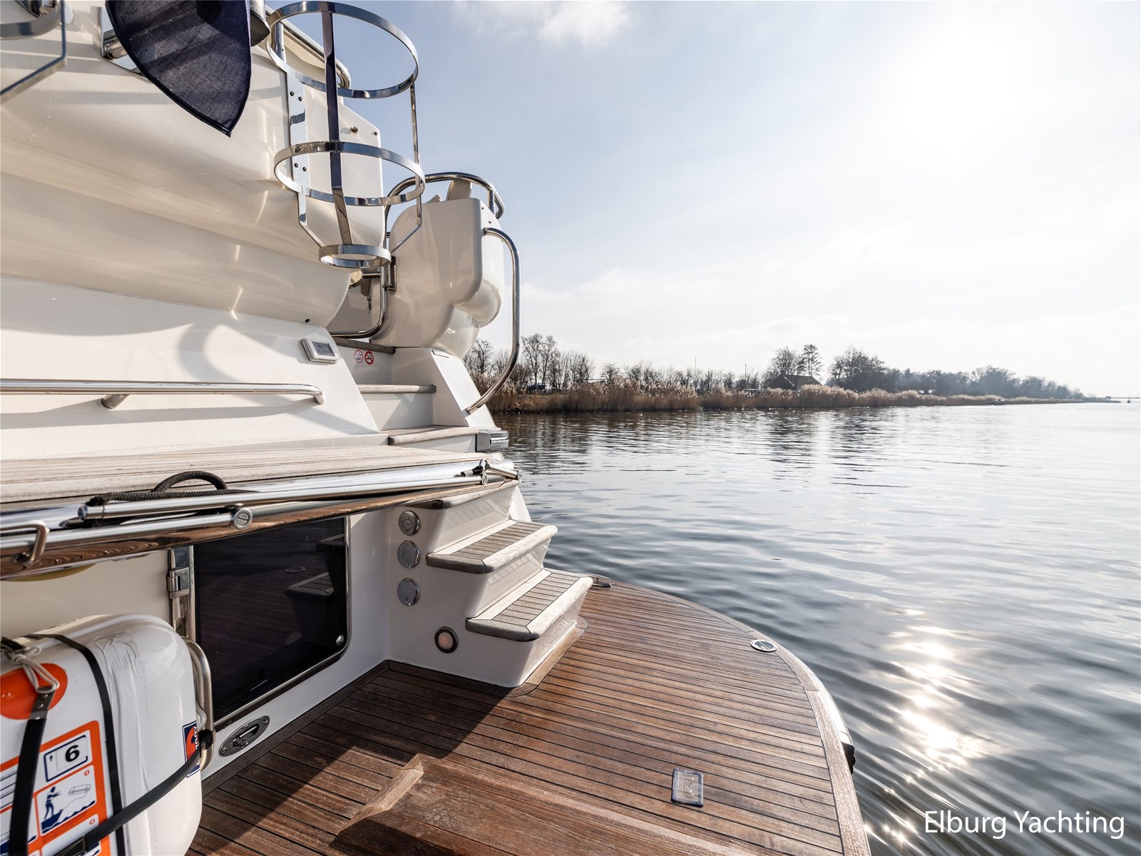 Rondom is het jacht voorzien van een prachtig Teakdek in combinatie met een driedubbel uitgevoerde r.v.s. zeereling. Aan beide zijden zijn relingpoortjes aangebracht met een comfortabele boegopstap waardoor het jacht ook bij de lagere steigers eenvoudig te betreden is. Het zwemplateau is eenvoudig te bereiken via de luie trap aan stuurboordzijde en een hydraulische gangway tevens is het zwemplateau voorzien van een Teakdek met steunen voor de bijboot, welke eenvoudig met de uitschuifbare gangway kunt kranen. Binnen is het jacht voorzien van een warm luxe Kersenhouten interieur met granieten werkbladen. De Kombuis is voorzien van Miele kwaliteitsapparatuur, het is aangenaam op temperatuur te krijgen via de Kabola centrale verwarming. Dimbare verlichting en 3 volwaardige hutten met 3 maal sanitair (3 x elektrische toiletten met 3 douches). Aan boord is de kastruimte goed doordacht en het interieur is prachtig afgewerkt.