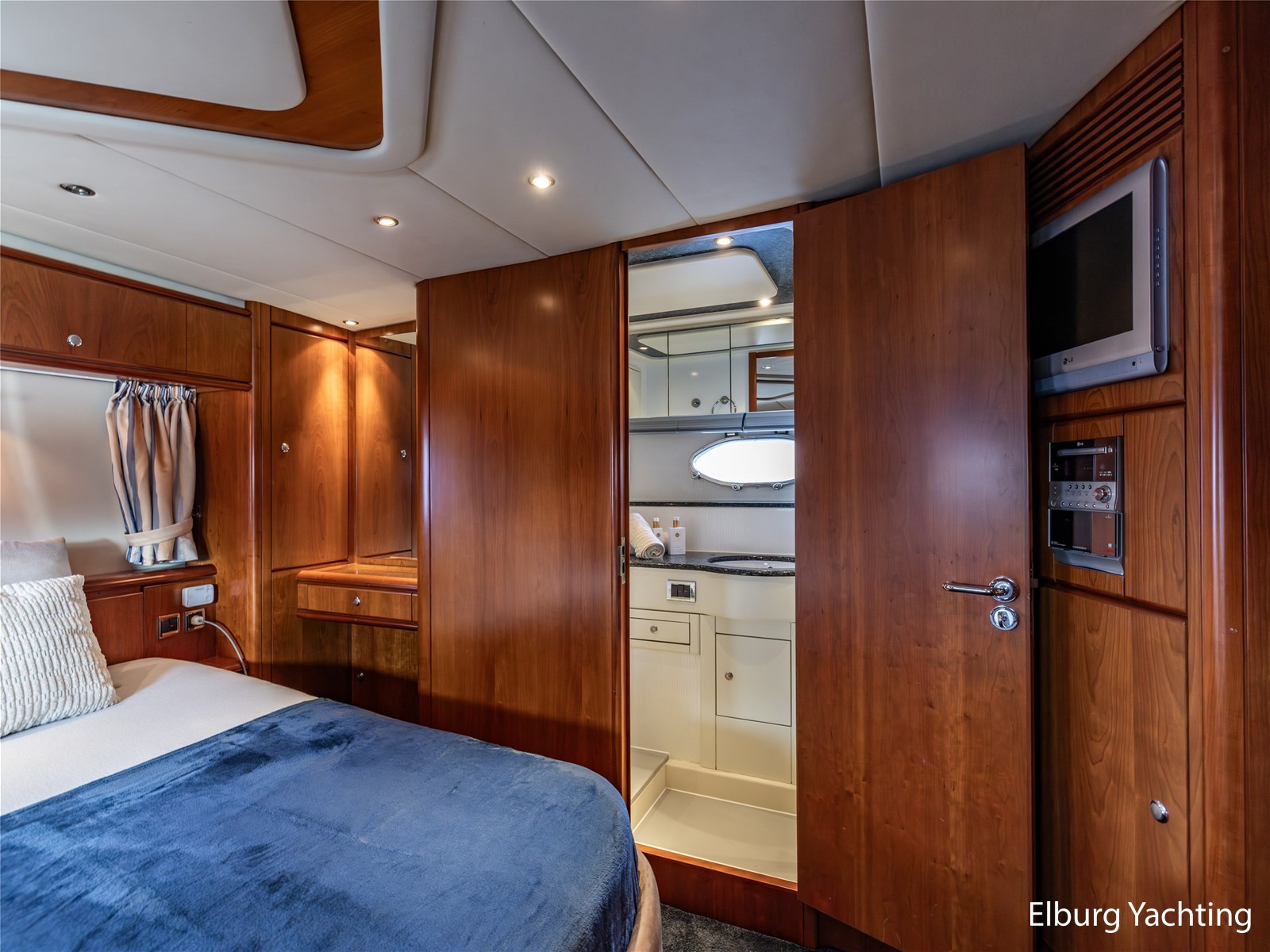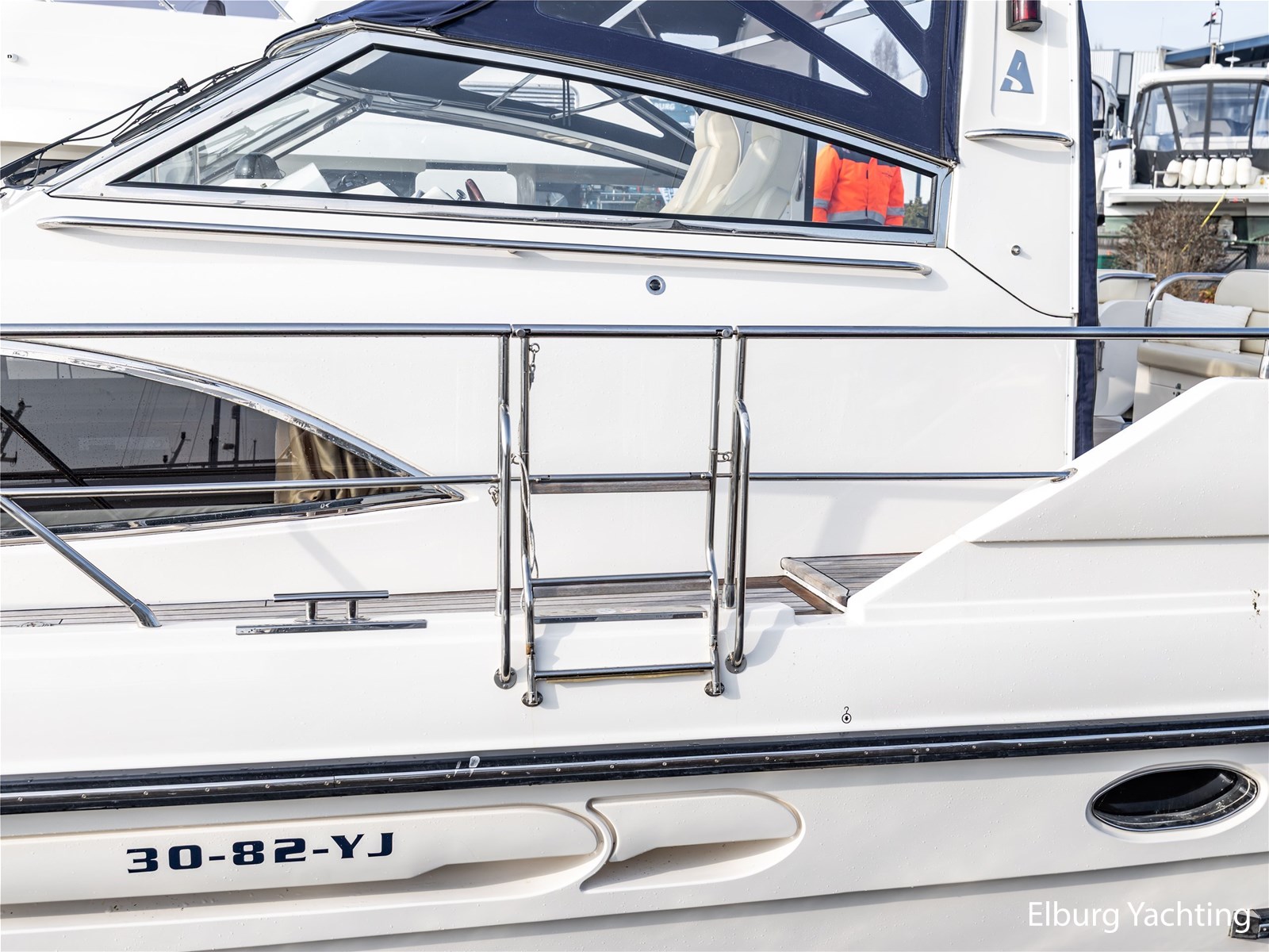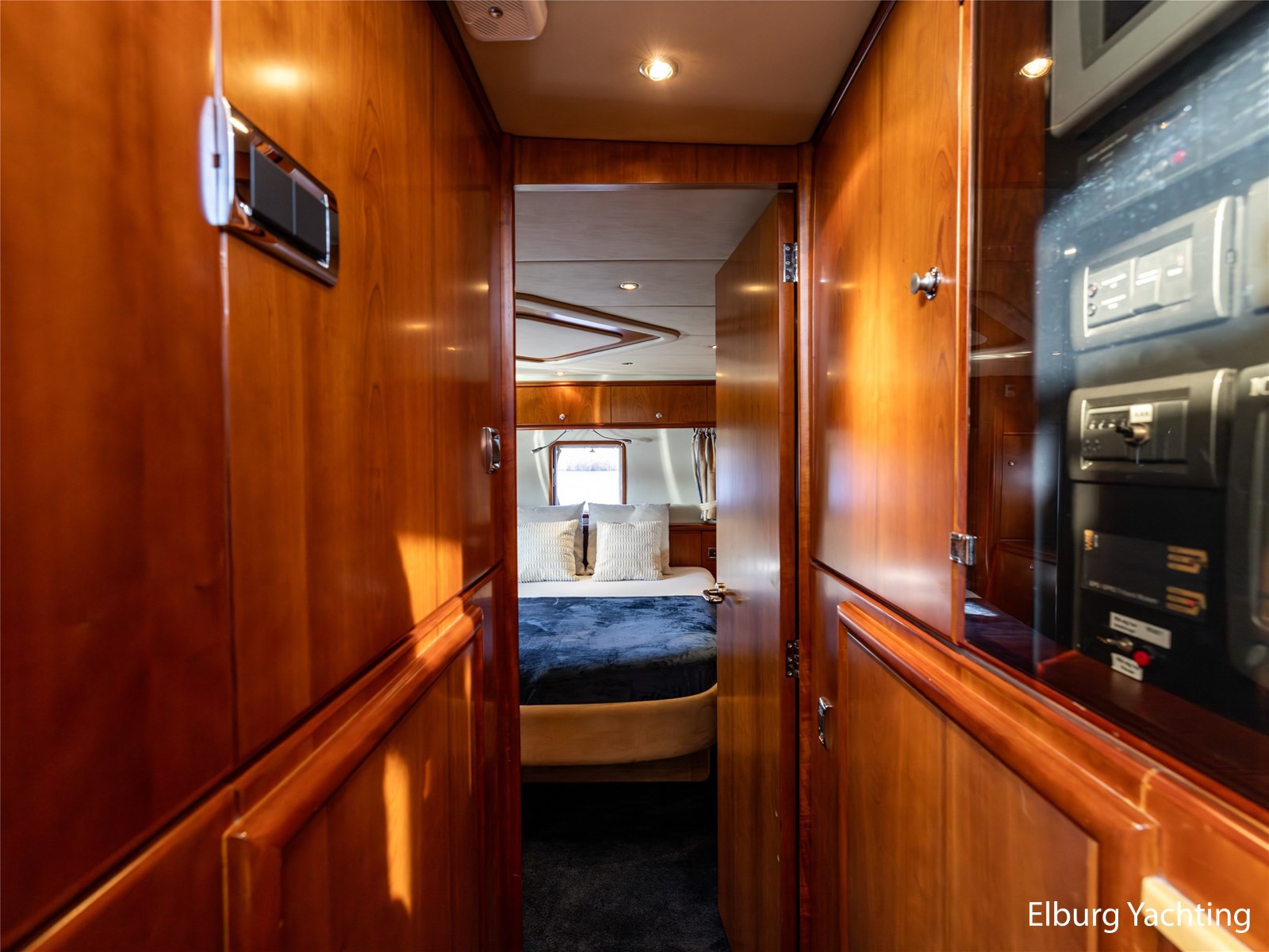 Rondom is het jacht voorzien van een prachtig Teakdek in combinatie met een driedubbel uitgevoerde r.v.s. zeereling. Aan beide zijden zijn relingpoortjes aangebracht met een comfortabele boegopstap waardoor het jacht ook bij de lagere steigers eenvoudig te betreden is. Het zwemplateau is eenvoudig te bereiken via de luie trap aan stuurboordzijde en een hydraulische gangway tevens is het zwemplateau voorzien van een Teakdek met steunen voor de bijboot, welke eenvoudig met de uitschuifbare gangway kunt kranen. Binnen is het jacht voorzien van een warm luxe Kersenhouten interieur met granieten werkbladen. De Kombuis is voorzien van Miele kwaliteitsapparatuur, het is aangenaam op temperatuur te krijgen via de Kabola centrale verwarming. Dimbare verlichting en 3 volwaardige hutten met 3 maal sanitair (3 x elektrische toiletten met 3 douches). Aan boord is de kastruimte goed doordacht en het interieur is prachtig afgewerkt.