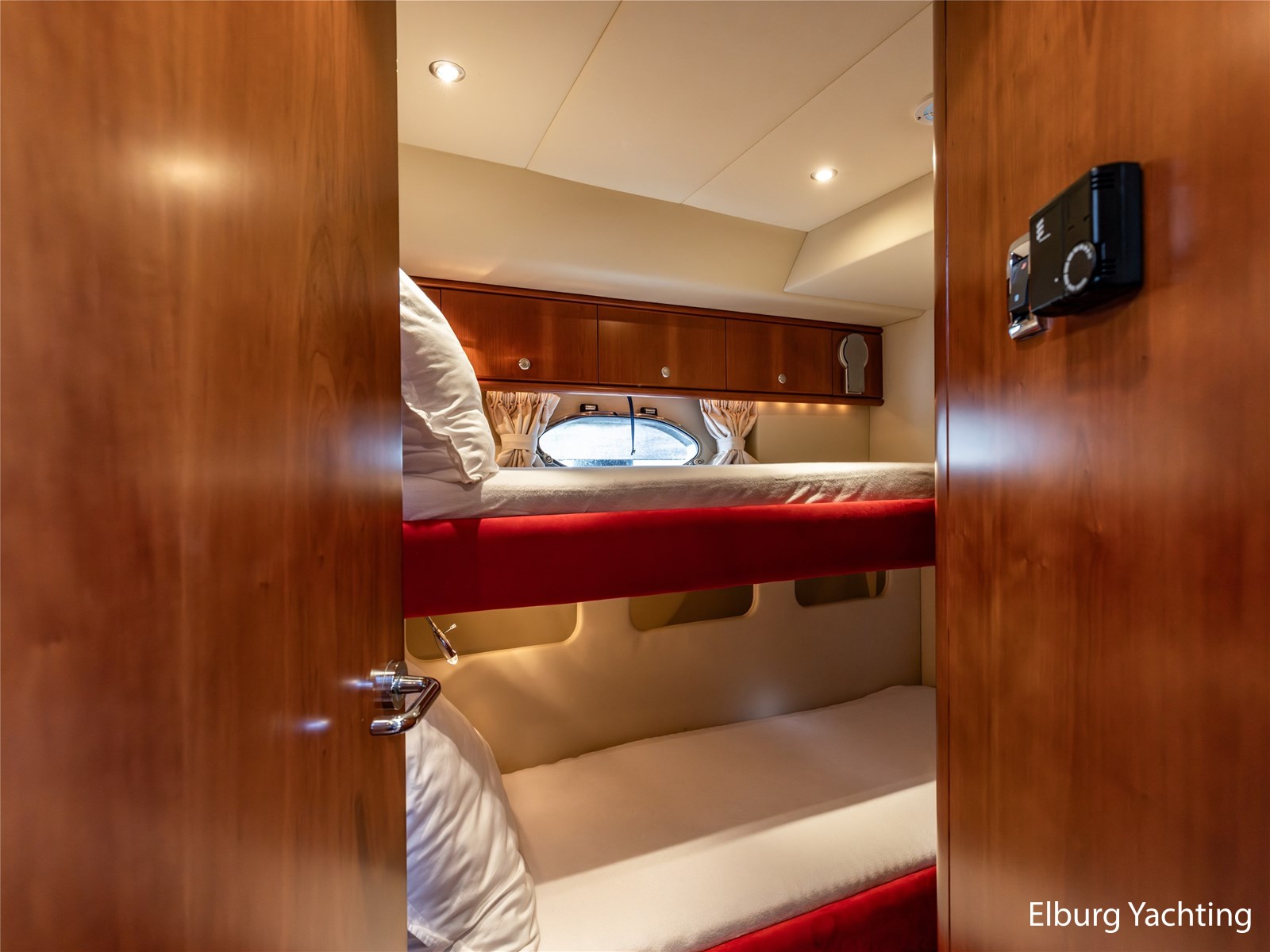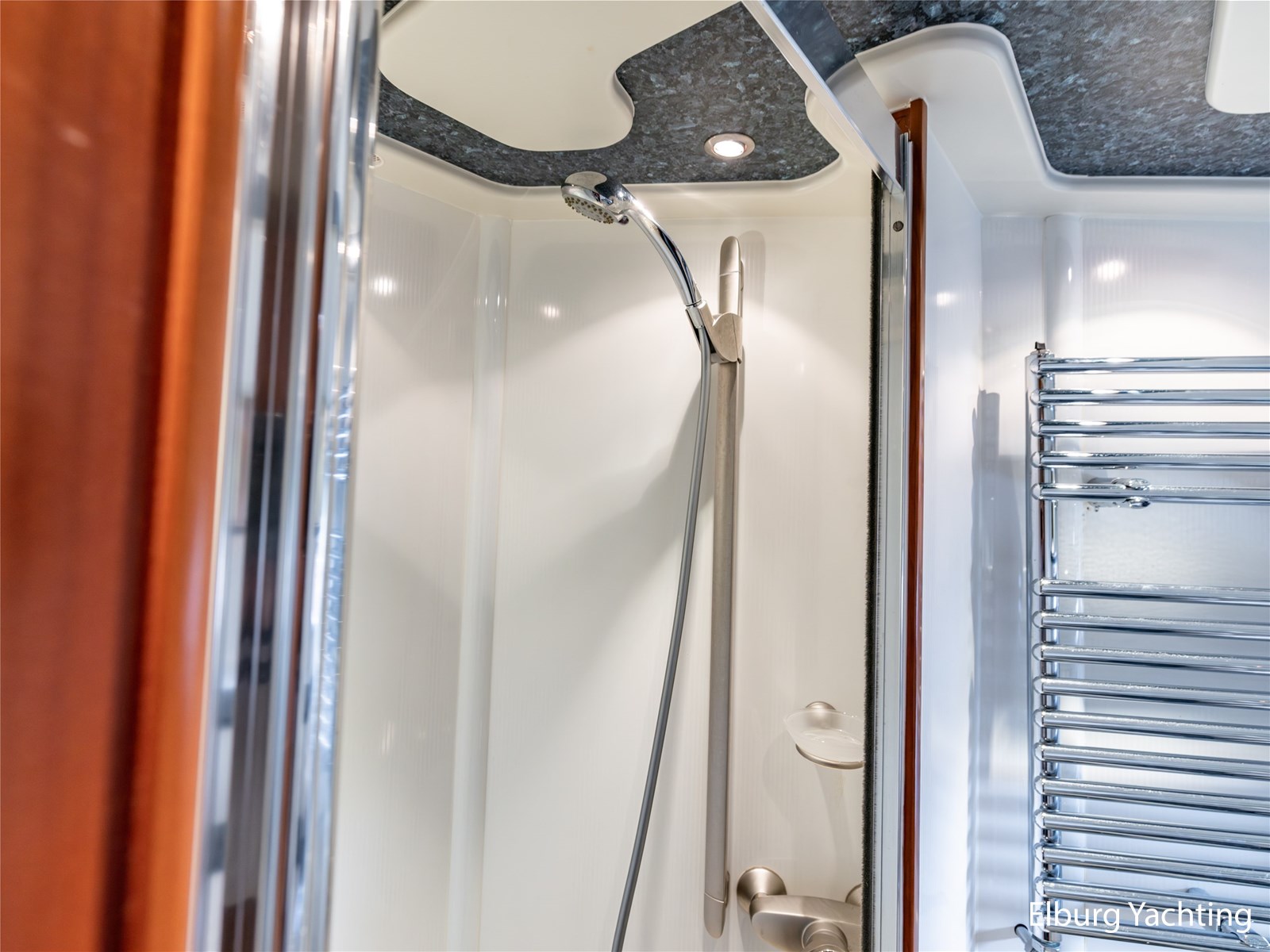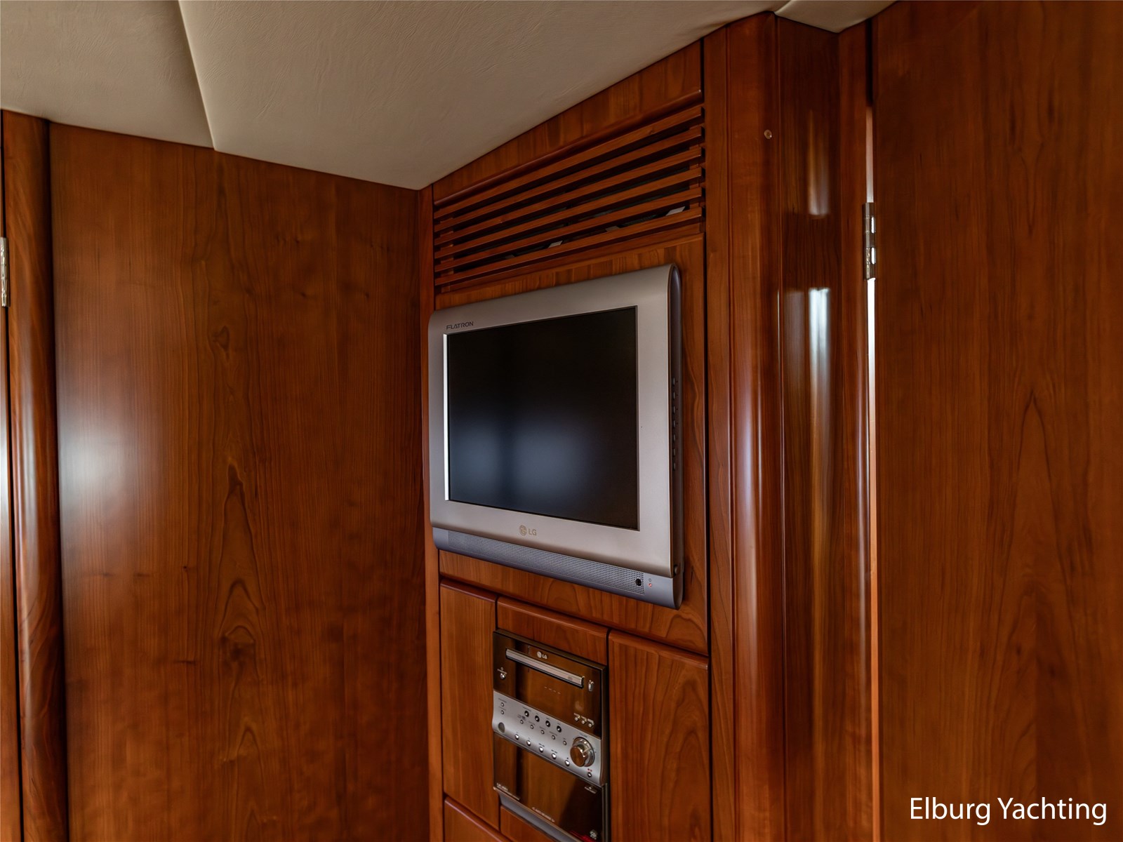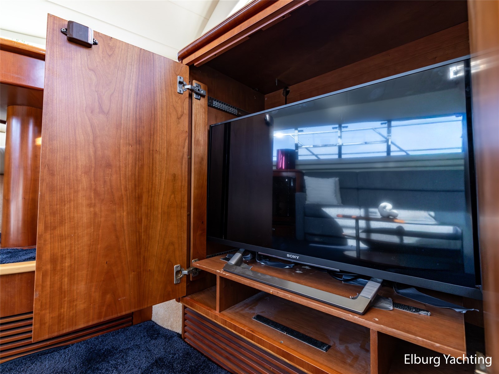Rondom is het jacht voorzien van een prachtig Teakdek in combinatie met een driedubbel uitgevoerde r.v.s. zeereling. Aan beide zijden zijn relingpoortjes aangebracht met een comfortabele boegopstap waardoor het jacht ook bij de lagere steigers eenvoudig te betreden is. Het zwemplateau is eenvoudig te bereiken via de luie trap aan stuurboordzijde en een hydraulische gangway tevens is het zwemplateau voorzien van een Teakdek met steunen voor de bijboot, welke eenvoudig met de uitschuifbare gangway kunt kranen. Binnen is het jacht voorzien van een warm luxe Kersenhouten interieur met granieten werkbladen. De Kombuis is voorzien van Miele kwaliteitsapparatuur, het is aangenaam op temperatuur te krijgen via de Kabola centrale verwarming. Dimbare verlichting en 3 volwaardige hutten met 3 maal sanitair (3 x elektrische toiletten met 3 douches). Aan boord is de kastruimte goed doordacht en het interieur is prachtig afgewerkt.