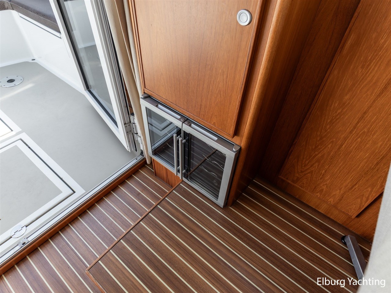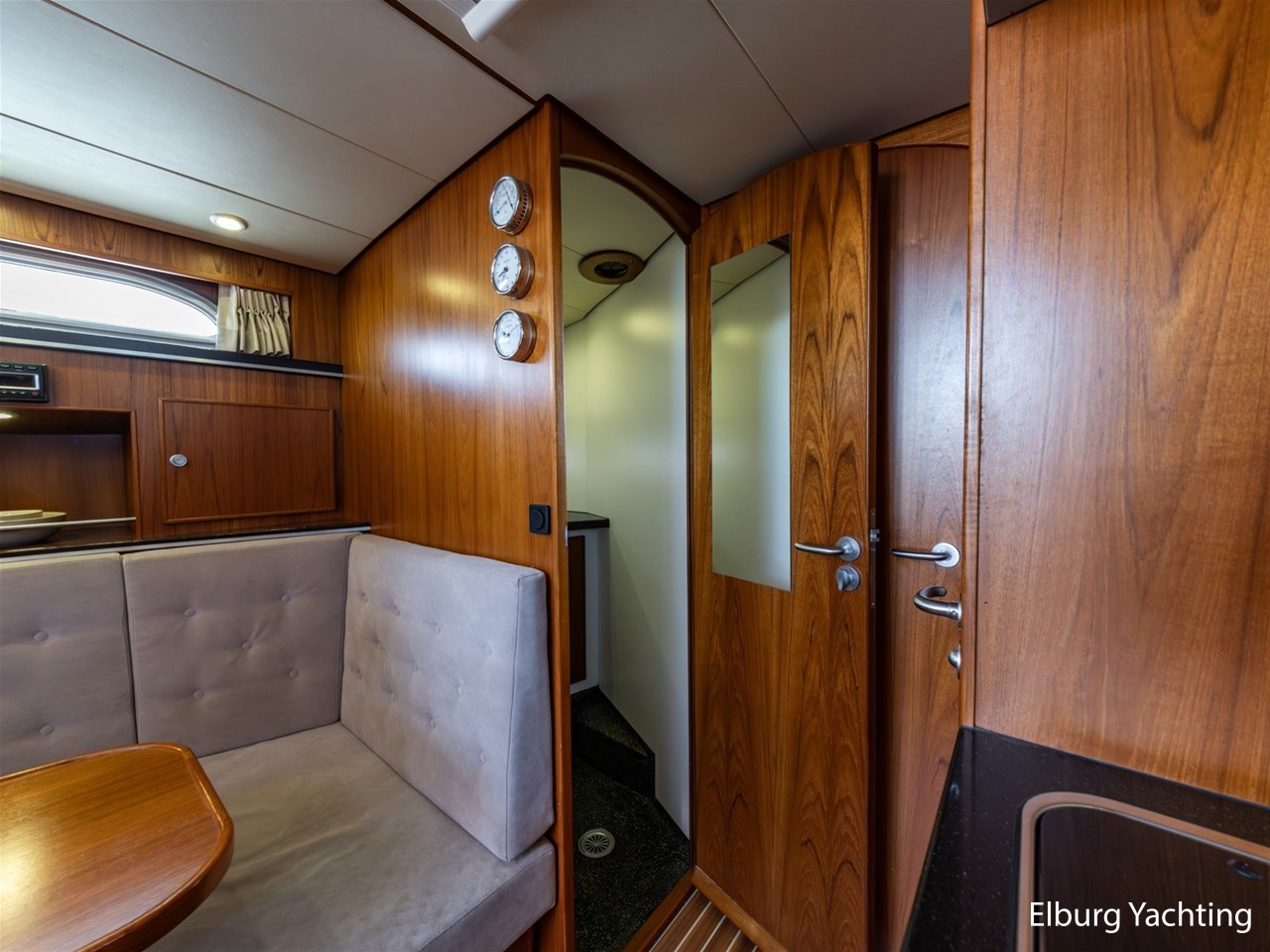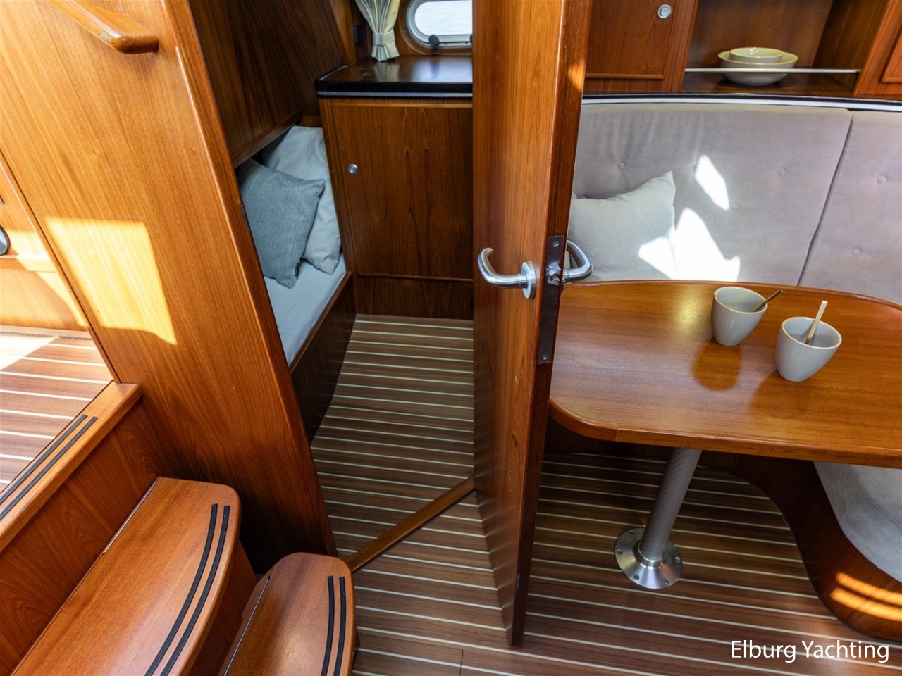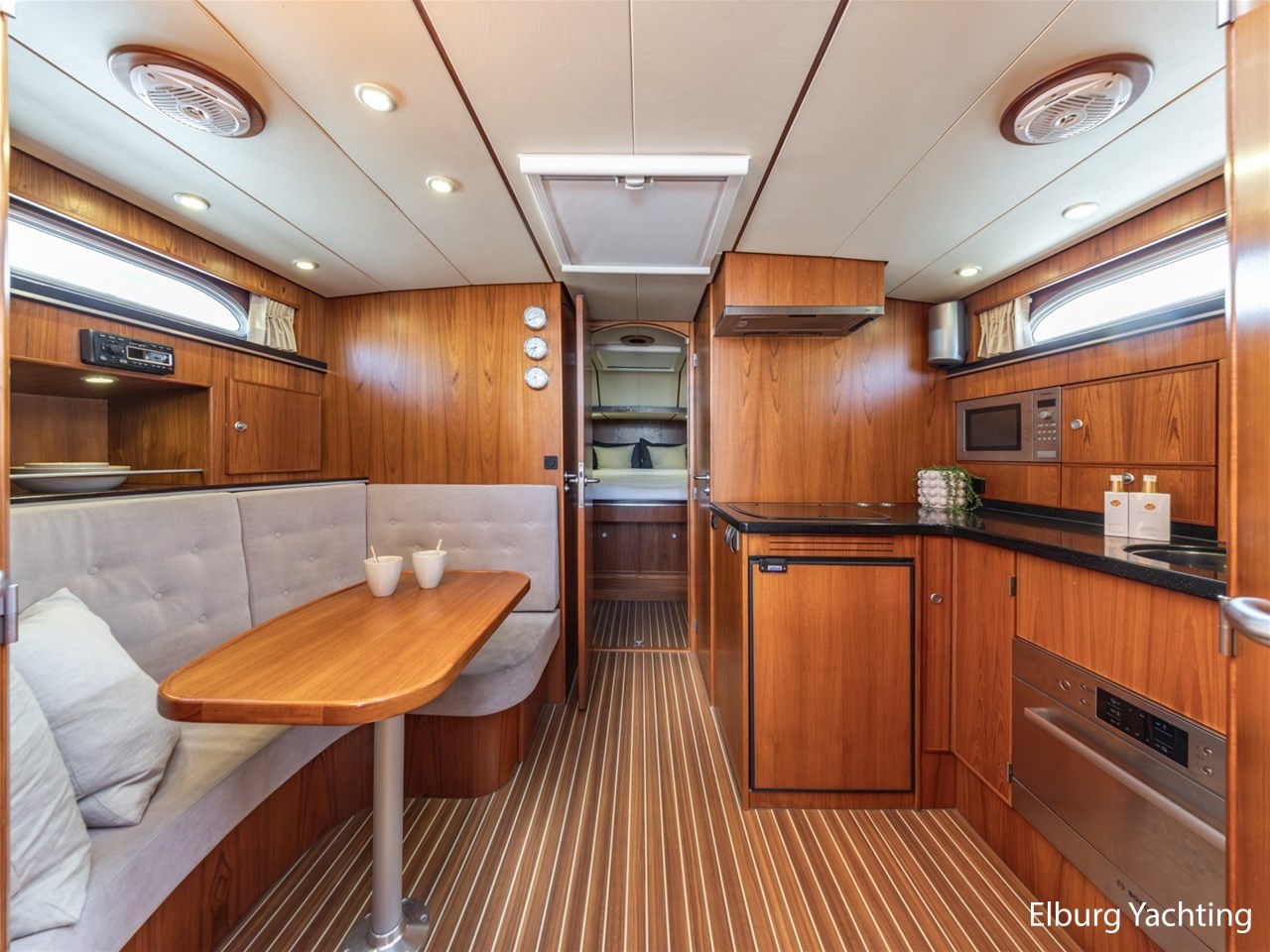 - Teak scheepsinterieur met wengé afwerking en r.v.s. accenten