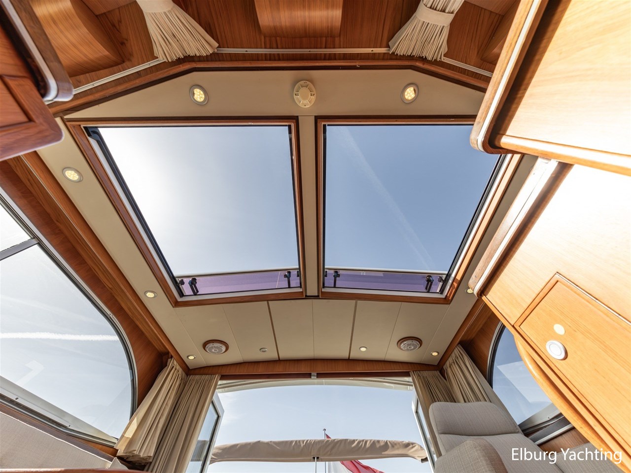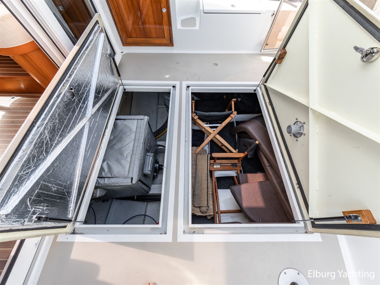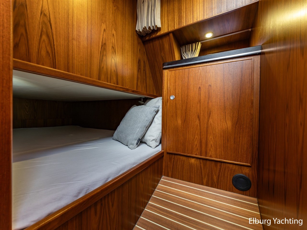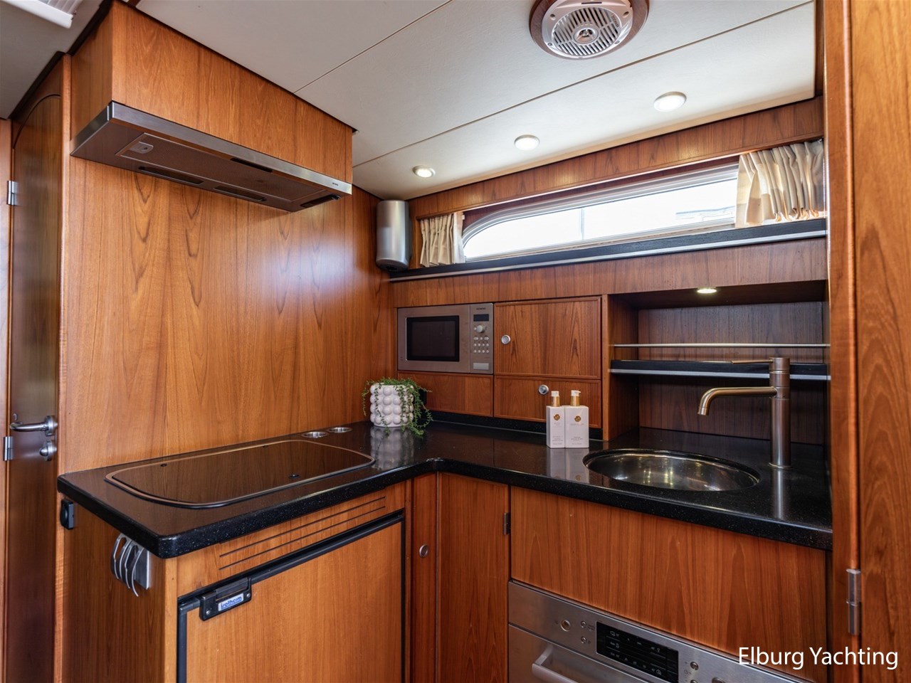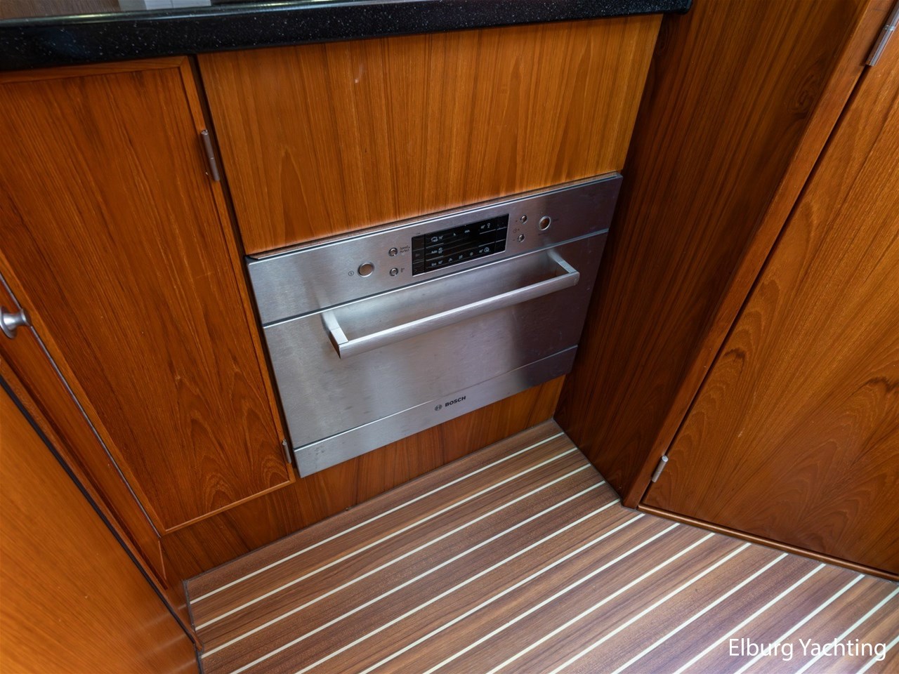 - Teak scheepsinterieur met wengé afwerking en r.v.s. accenten