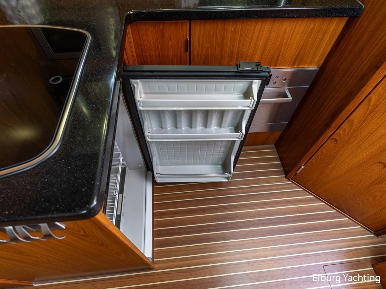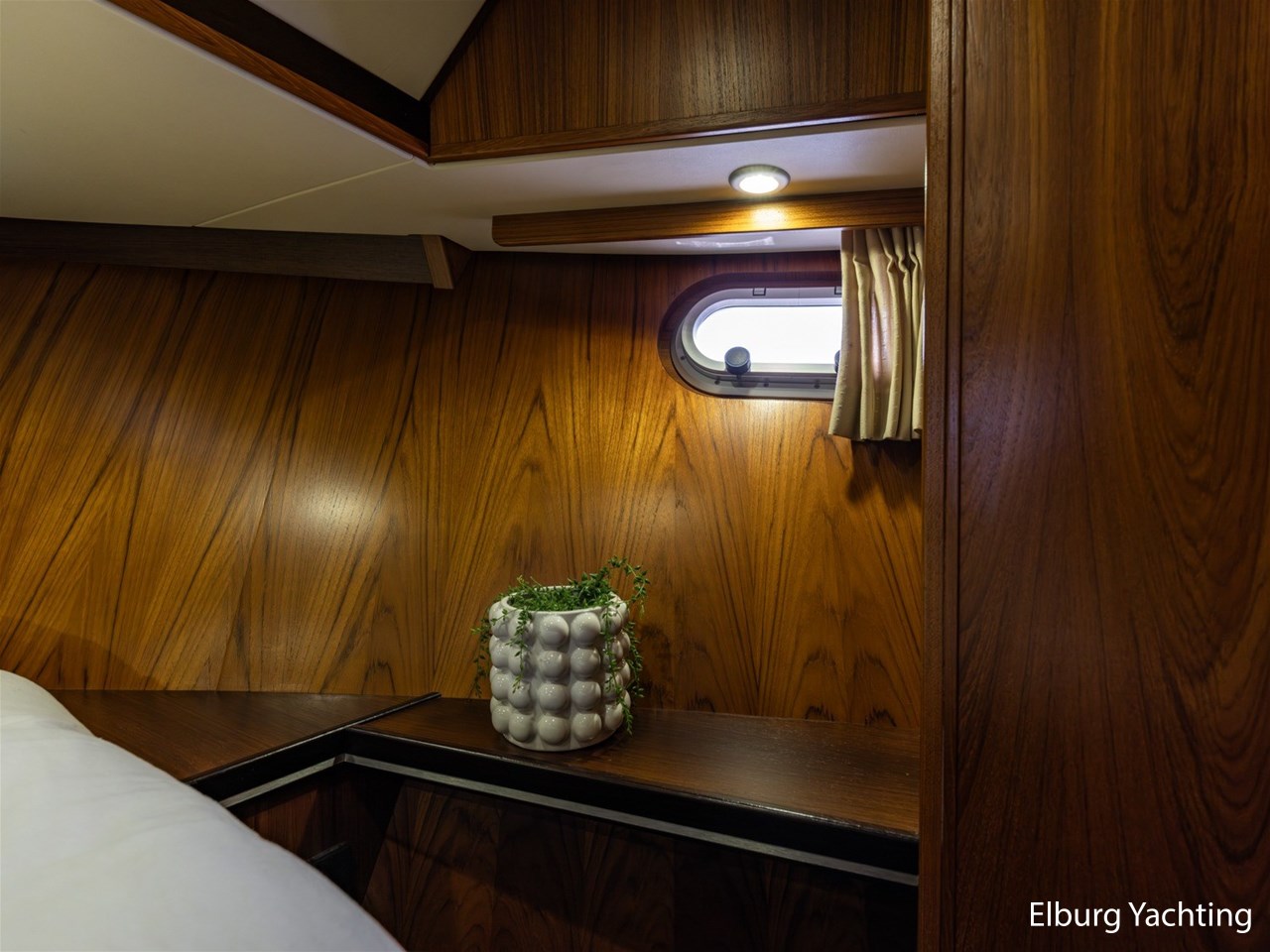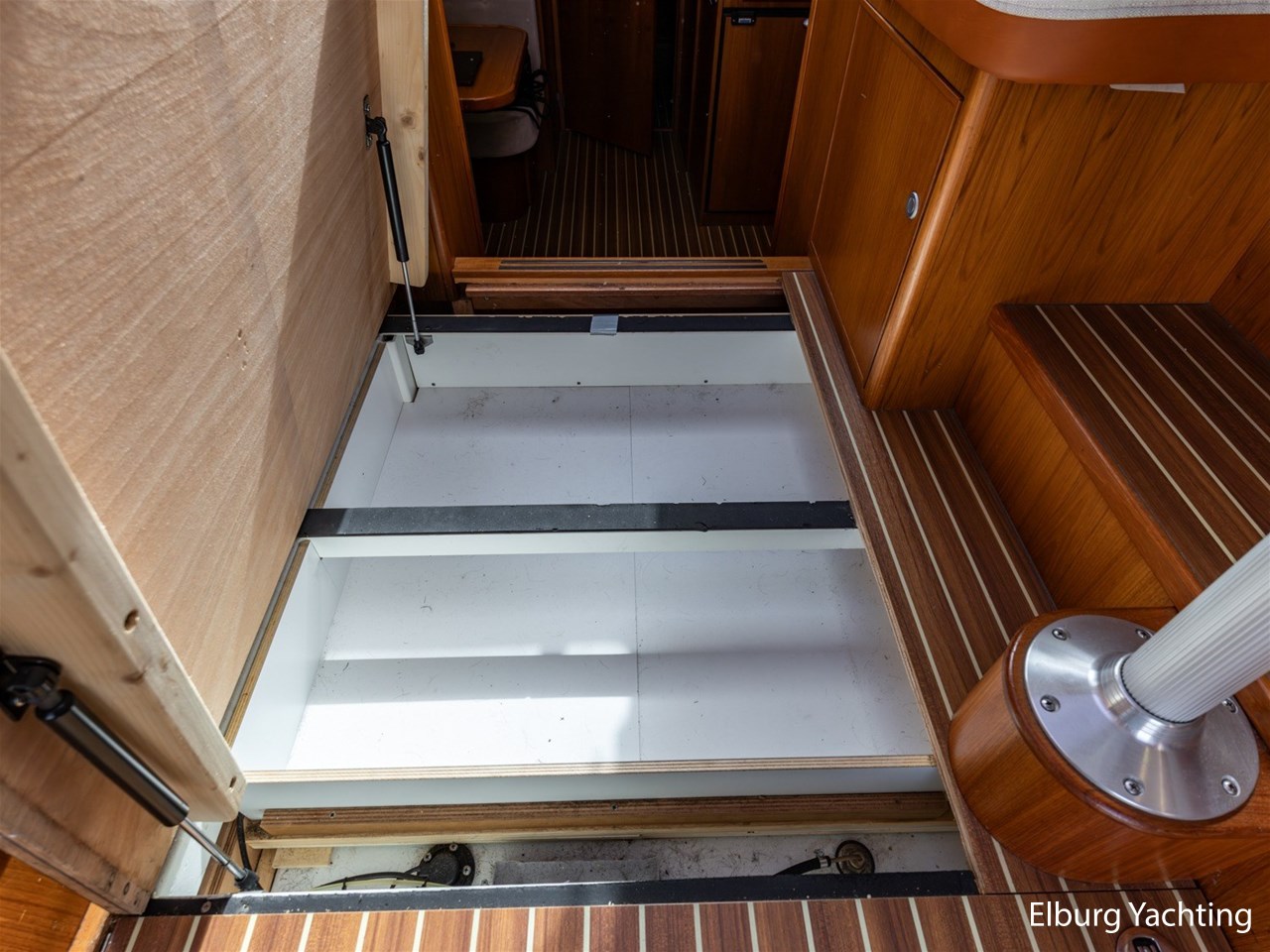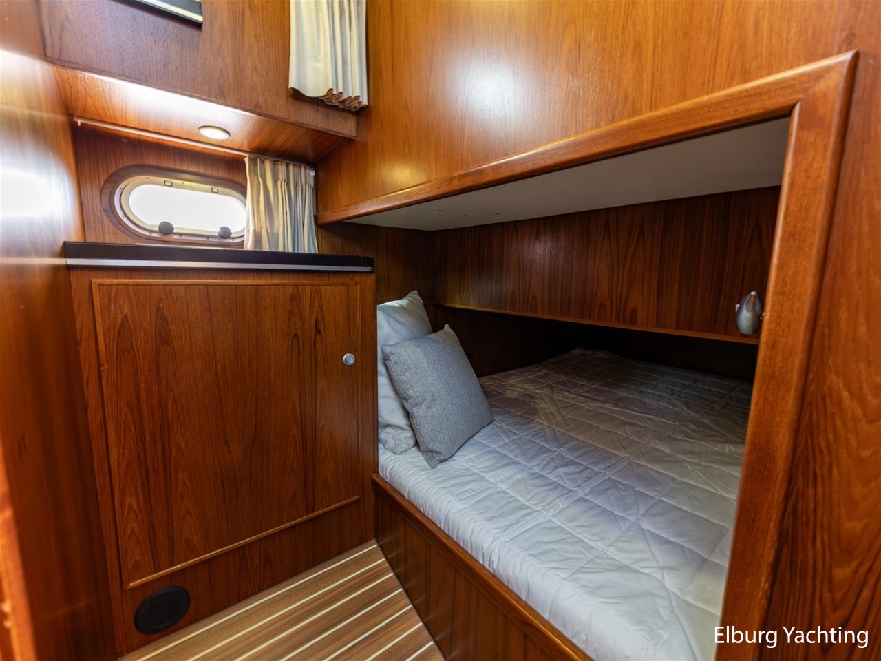 - Teak scheepsinterieur met wengé afwerking en r.v.s. accenten
