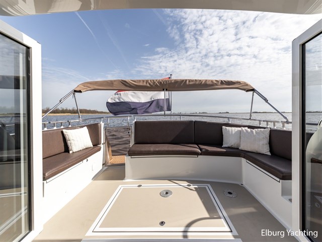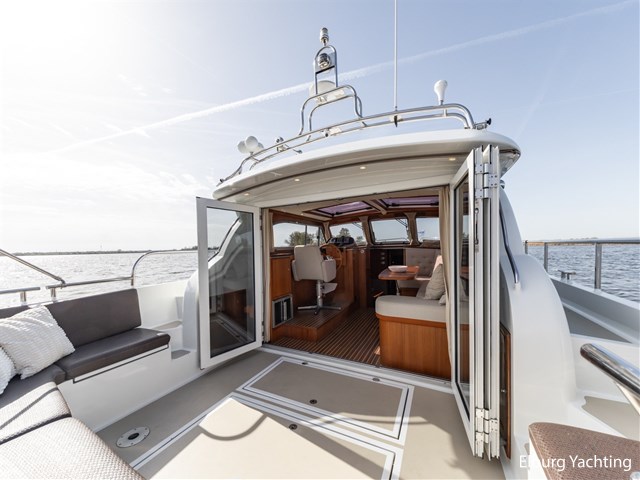 Deze modern gelijnde Steeler NG40, ontworpen door Martin Bekebrede en gebouwd door de werf Steeler Yachts, verkeert in uitstekende staat. Het schip is volledig klaar voor het nieuwe vaarseizoen dankzij grootschalig onderhoud in 2025: de romp (Beigegrijs, RAL 7006) en opbouw zijn volledig nieuw gespoten, de Steyr hoofdmotor (uitgerust met extra isolatie) heeft een grote beurt gehad en alle accu’s zijn vernieuwd. Eerder in 2022 is het onderwaterschip volledig gestraald en voorzien van een nieuw verfsysteem. Het interieur is hoogwaardig afgewerkt in teak met wengé details en r.v.s. accenten. Uniek voor deze lengte zijn de zes vaste slaapplaatsen, verdeeld over drie hutten waaronder een ruime eigenaarshut met een 2-persoons frans bed. Door de twee grote panoramadaken in de salon komt er veel daglicht naar binnen. Het achterdek en de salon zijn gelijkvloers en open met elkaar te verbinden door de drie aluminium klapdeuren. Voor extra gemak aan boord is de kombuis uitgerust met een Bosch vaatwasser en een wijnkoeler in de salon. In de kuip is een grote U-vorming bank aanwezig met afneembare kussens en een inklapbare biminitop voor beschutting tegen de zon. Dankzij de klapbare beugel heeft deze Steeler NG40 een minimale doorvaarthoogte van slechts 2,70 meter.