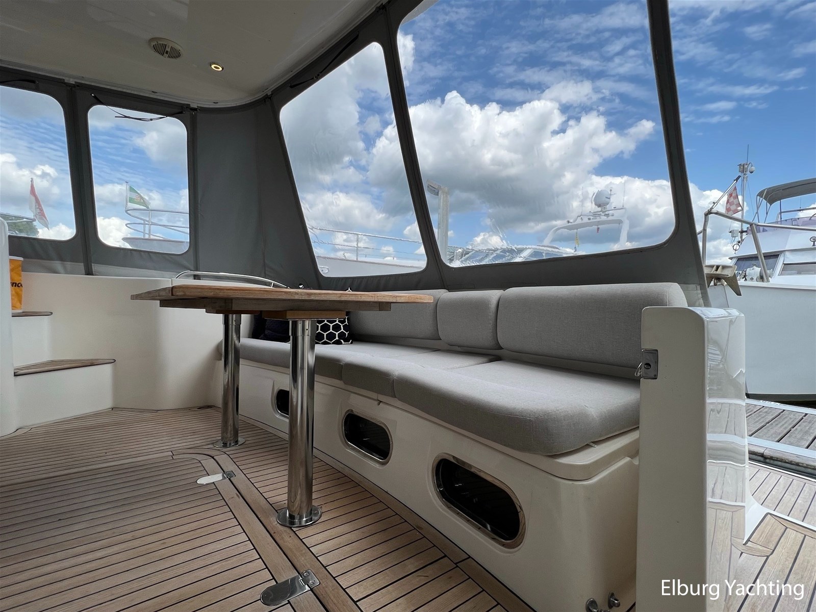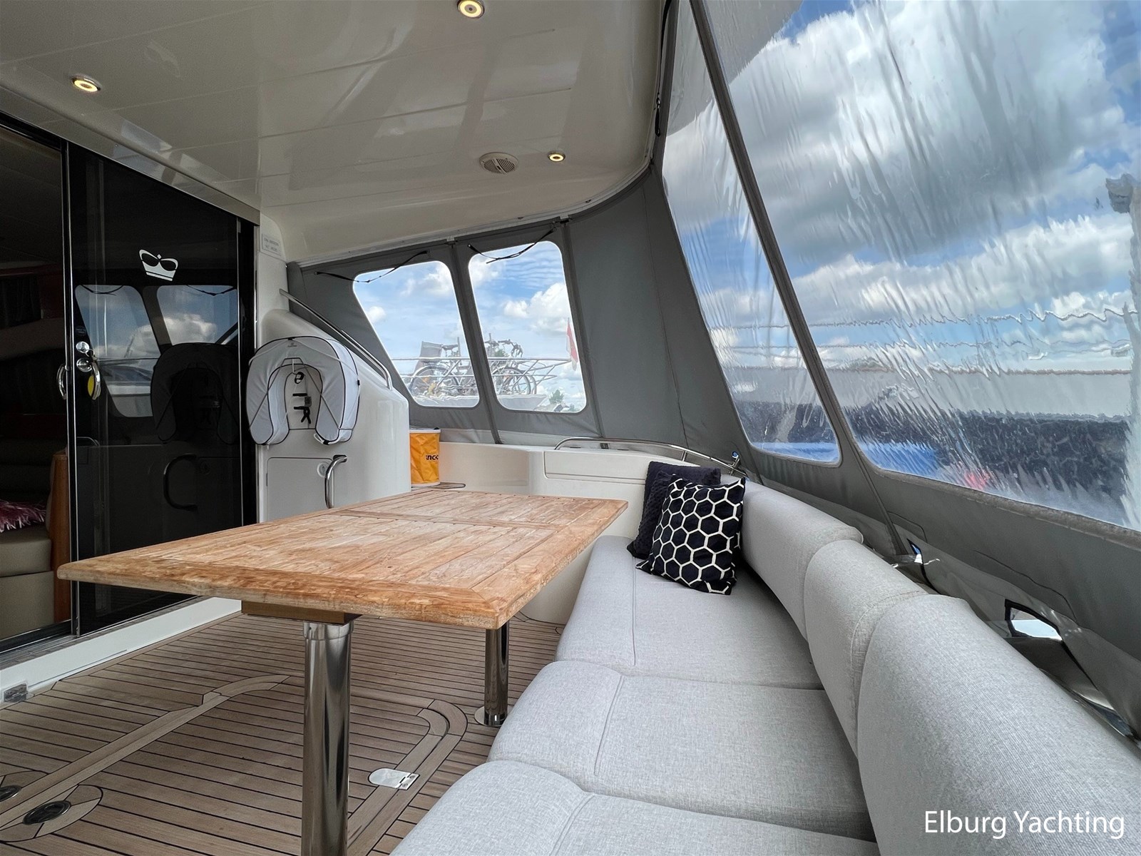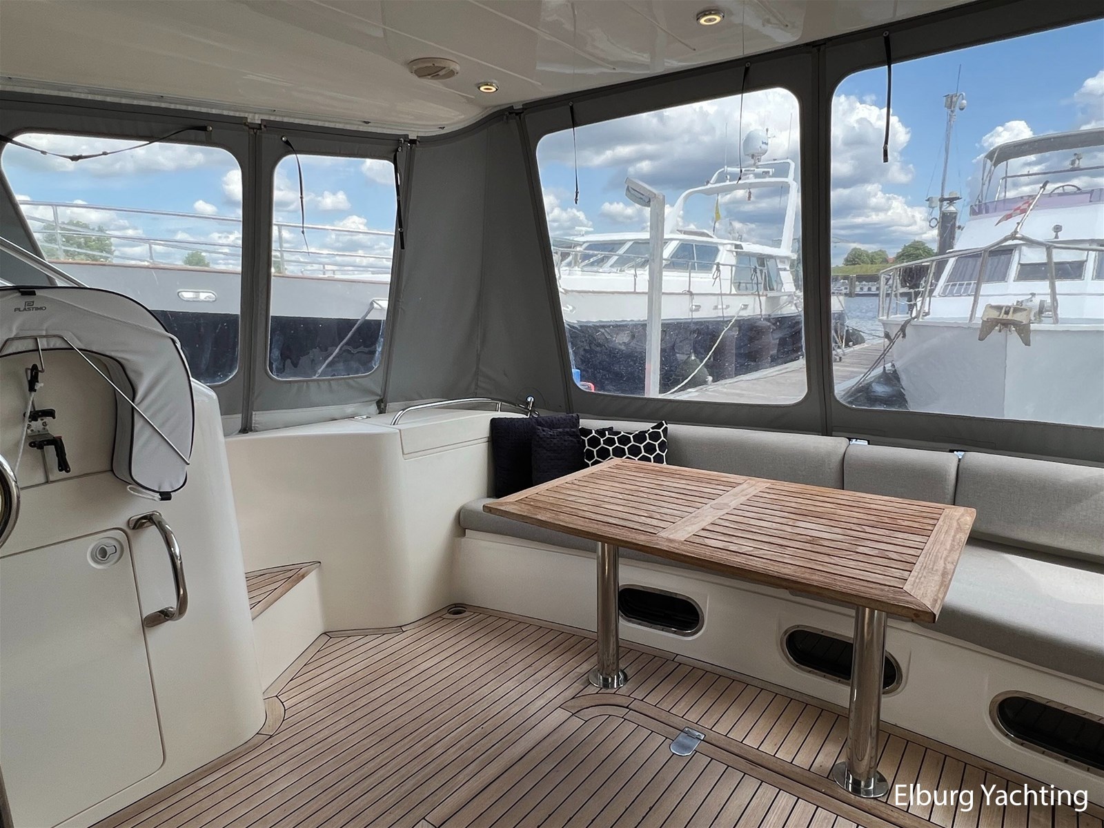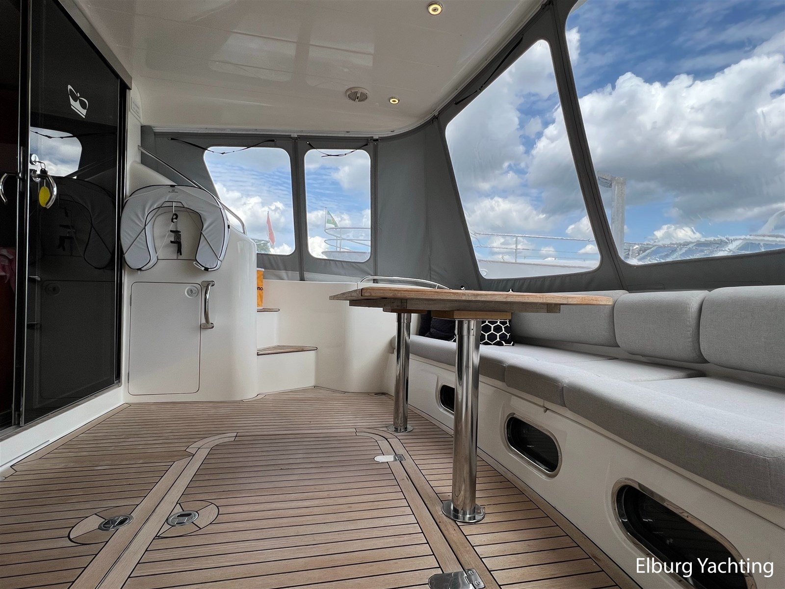 - Flexiteak op flybridge en gangboord (2022), teak hout in openkuip en zwemplateau