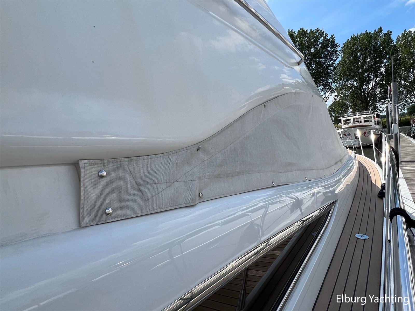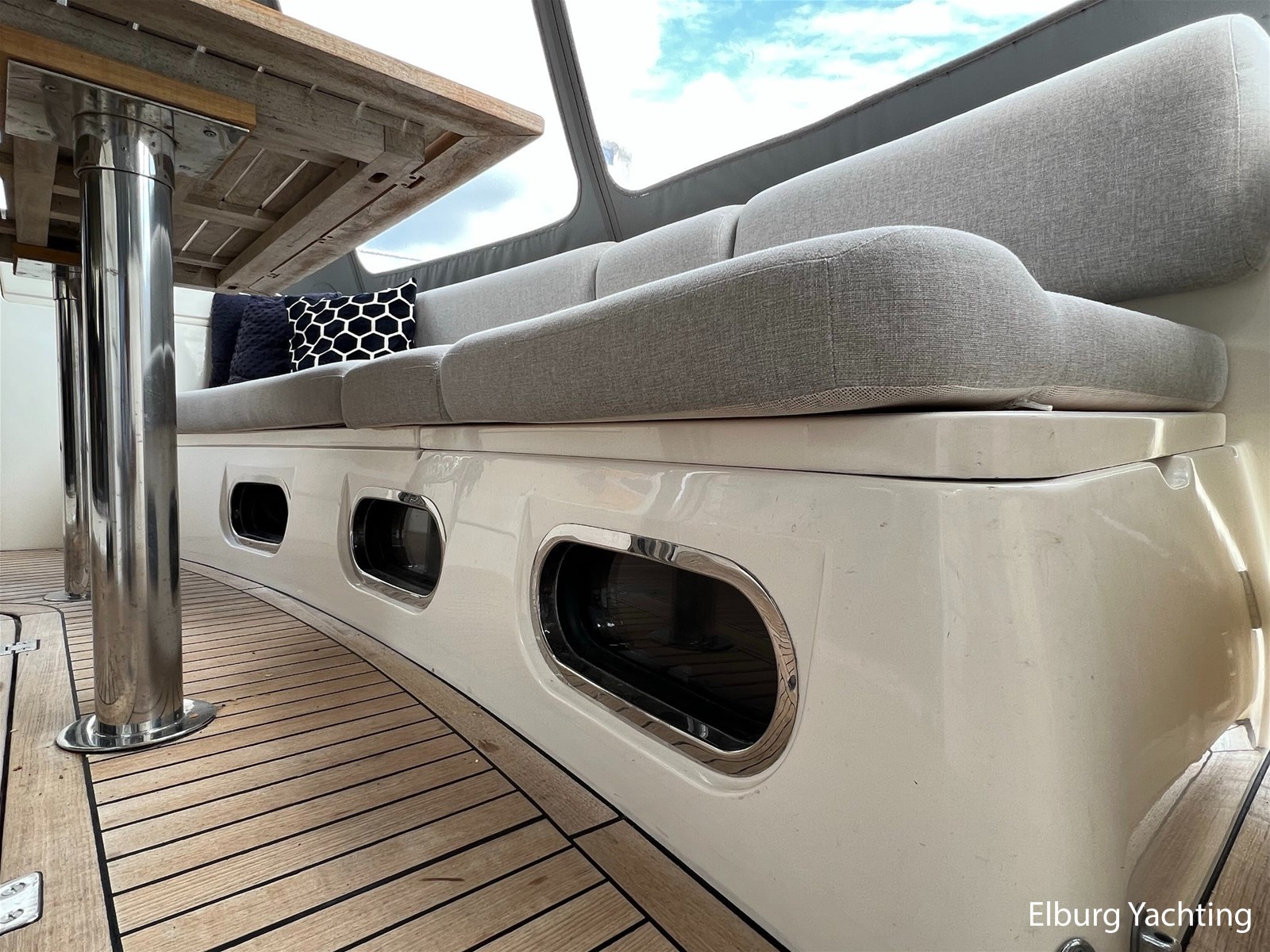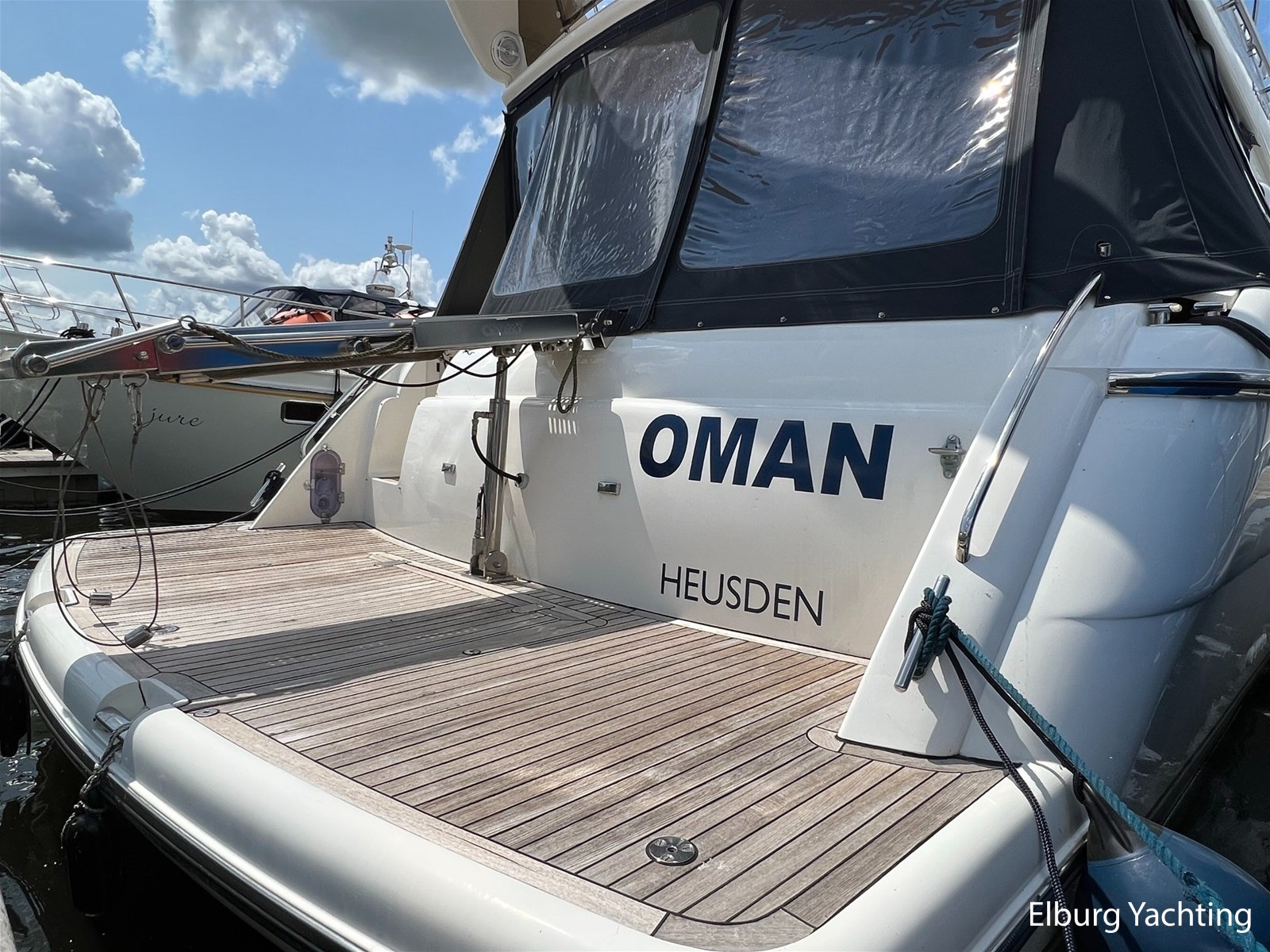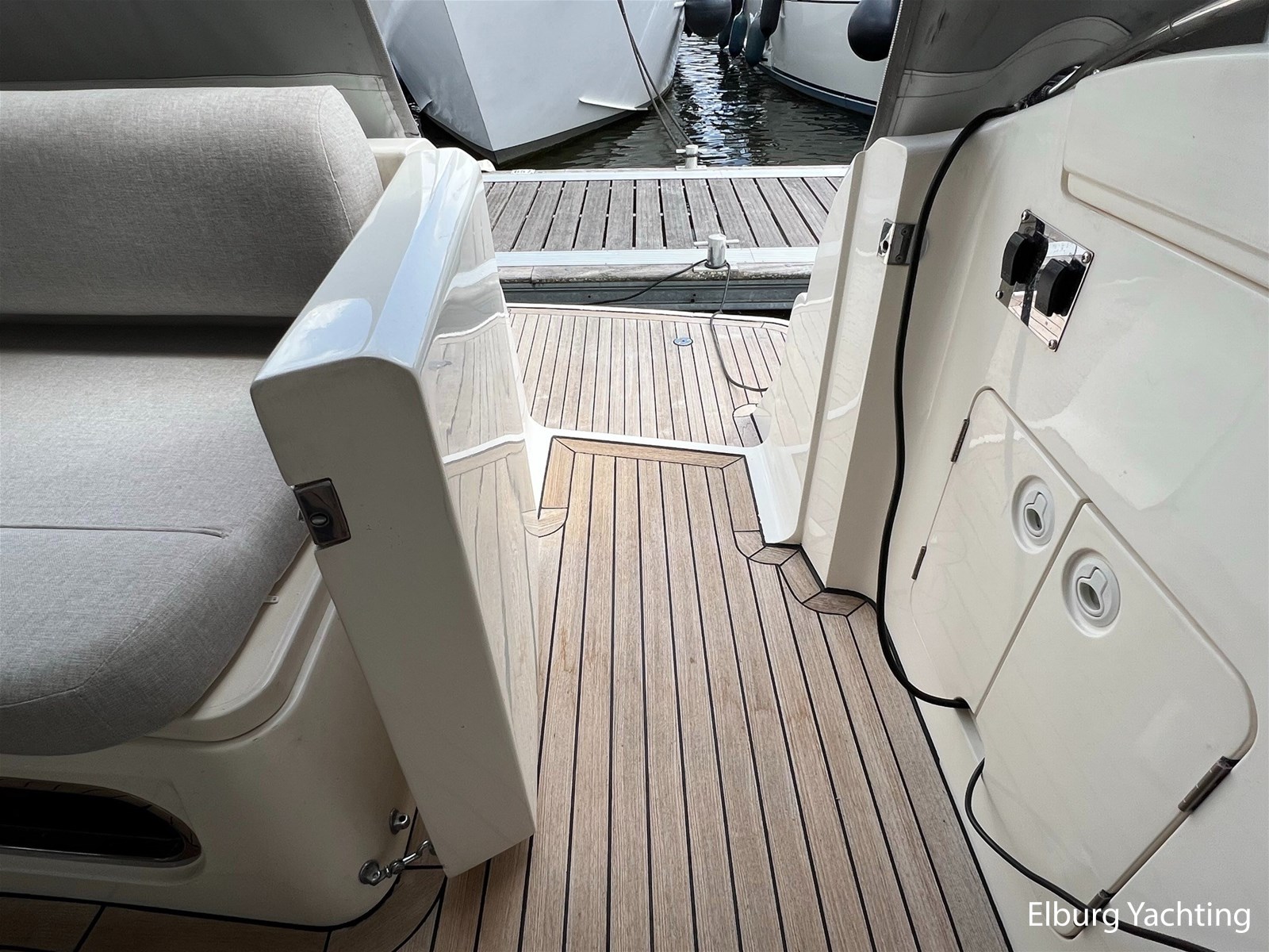 - Flexiteak op flybridge en gangboord (2022), teak hout in openkuip en zwemplateau