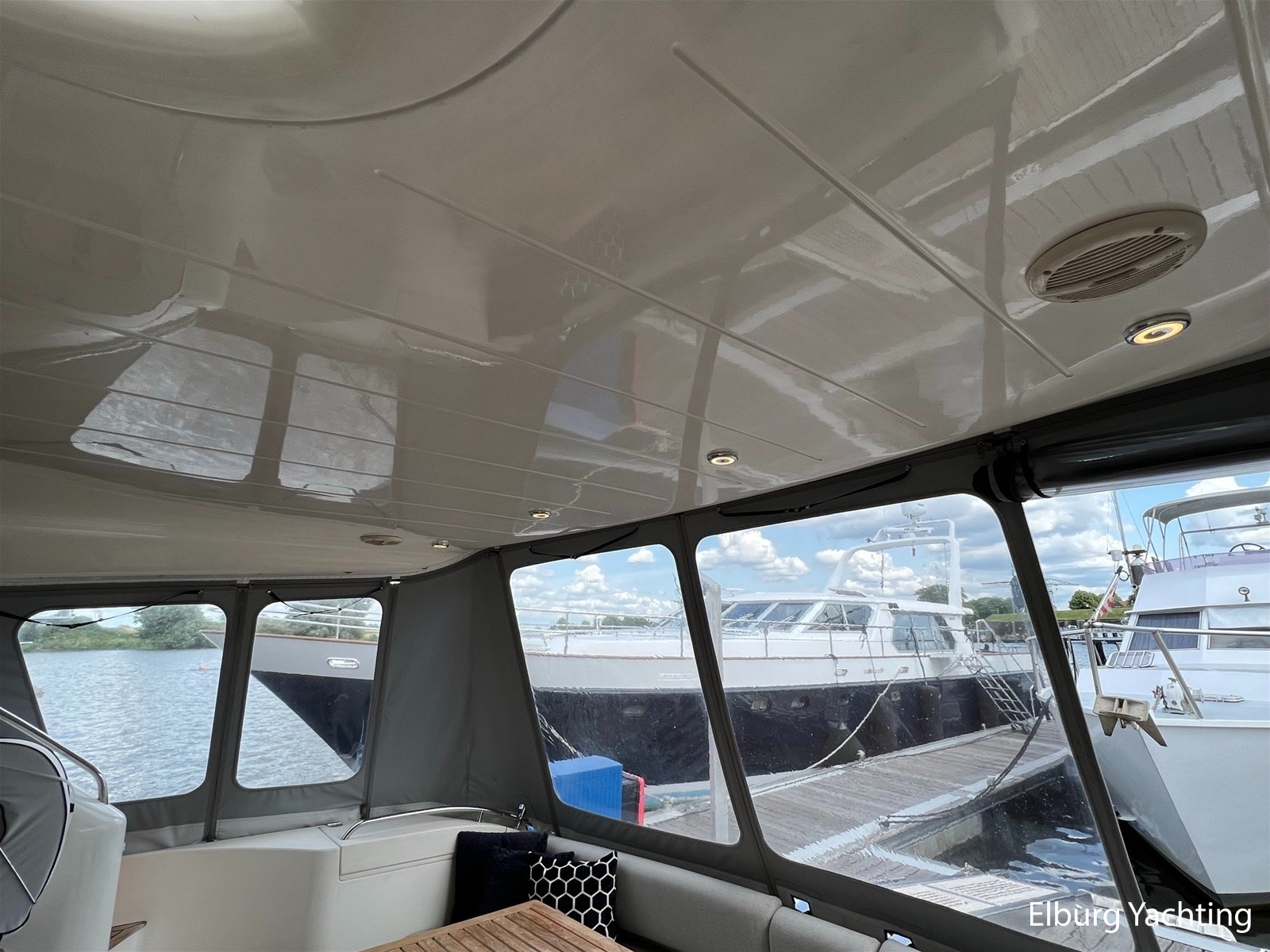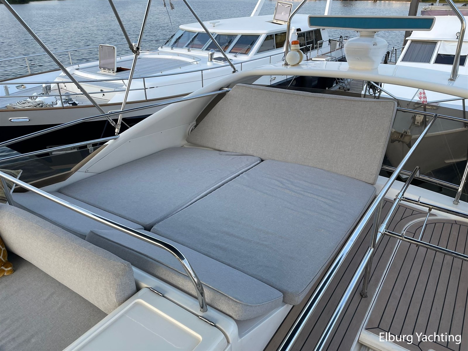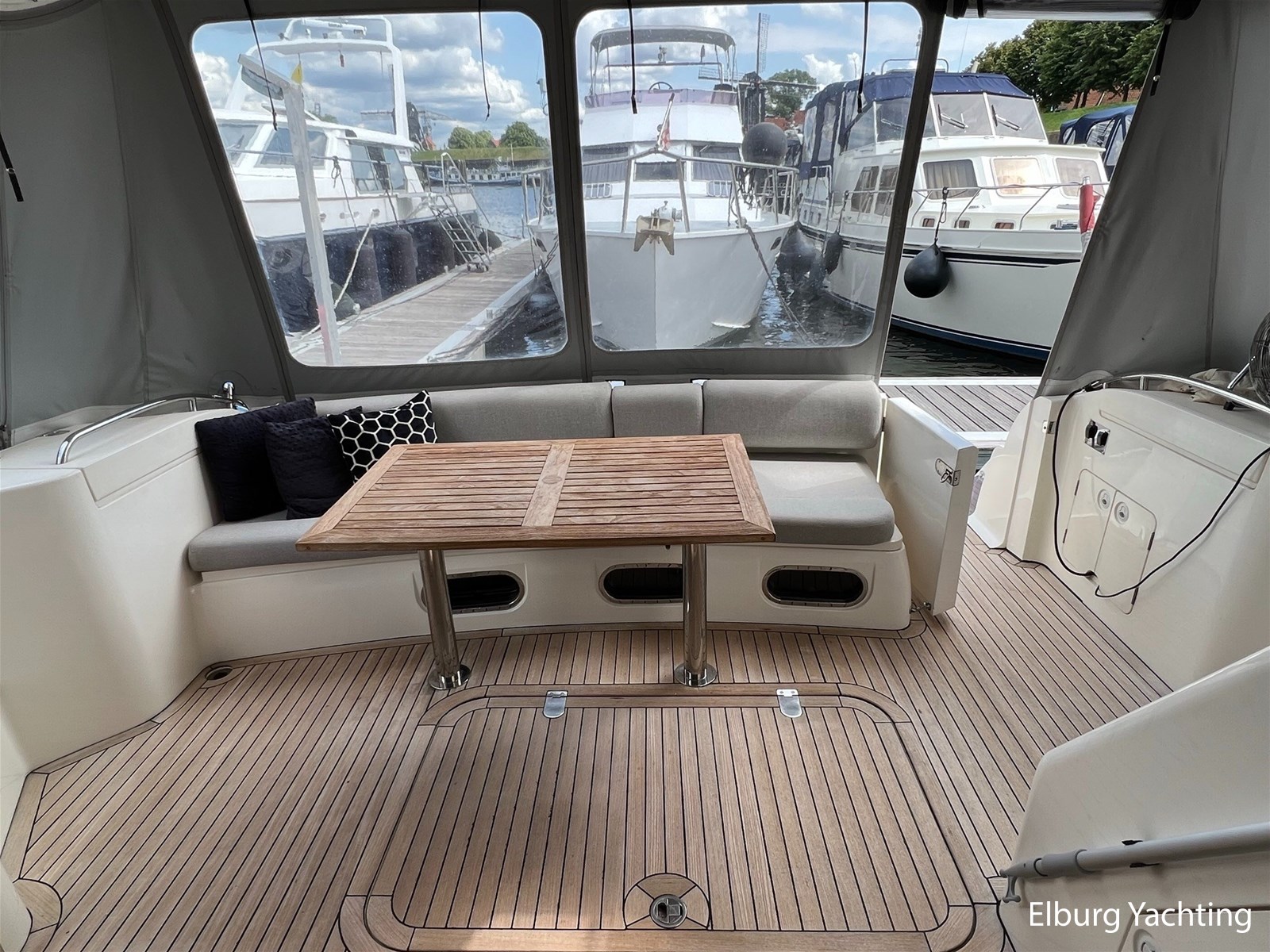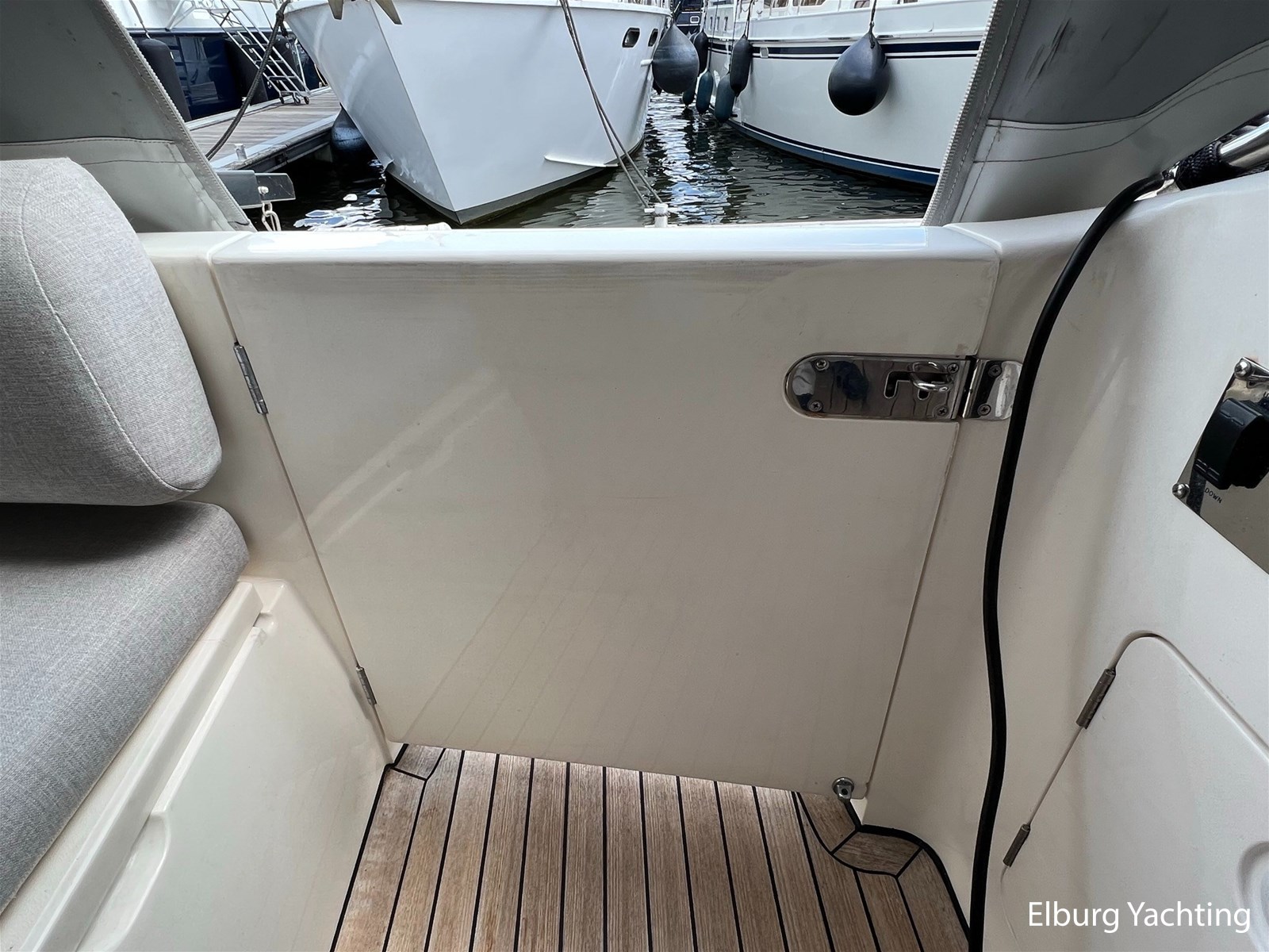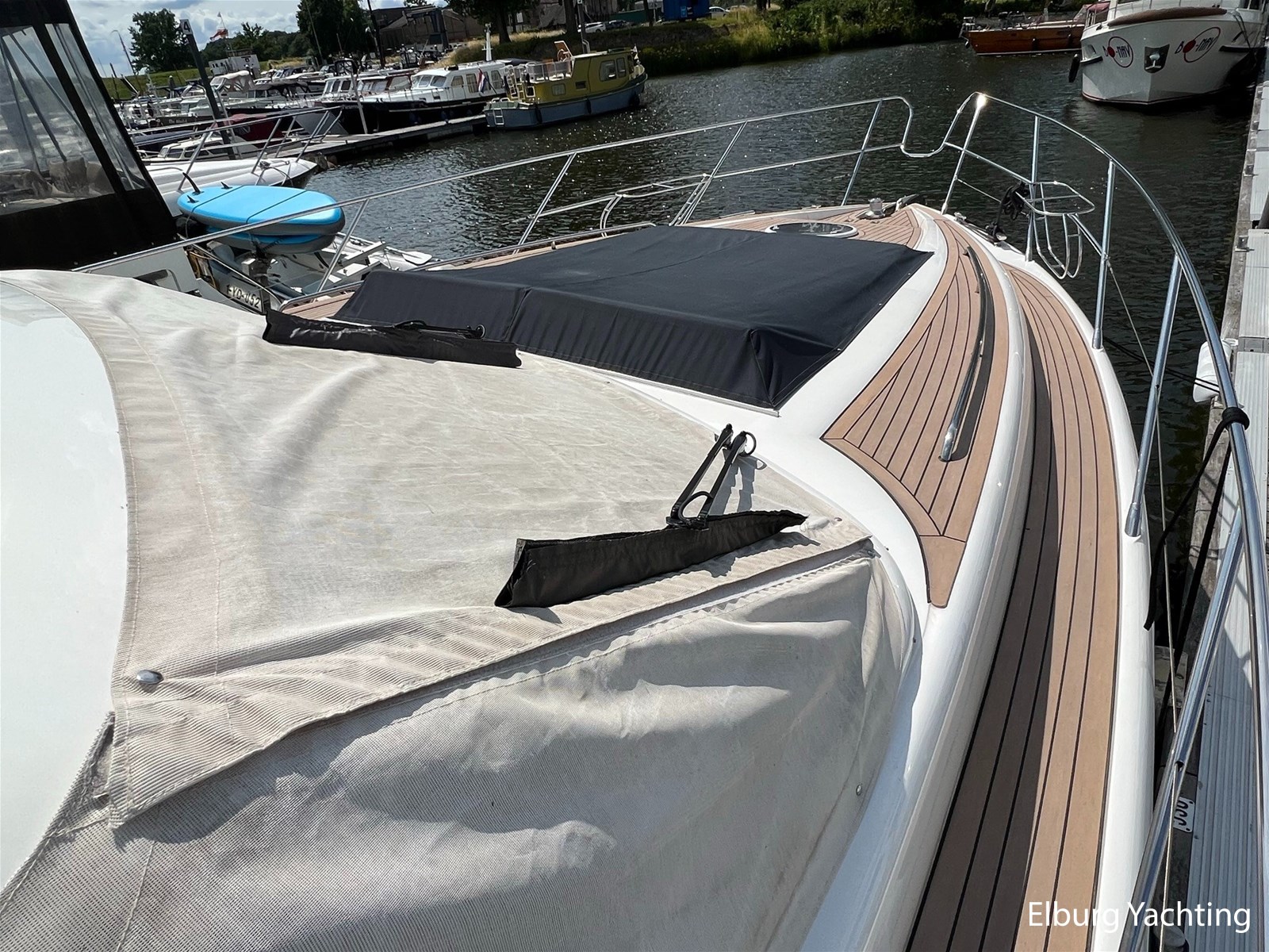 - Flexiteak op flybridge en gangboord (2022), teak hout in openkuip en zwemplateau