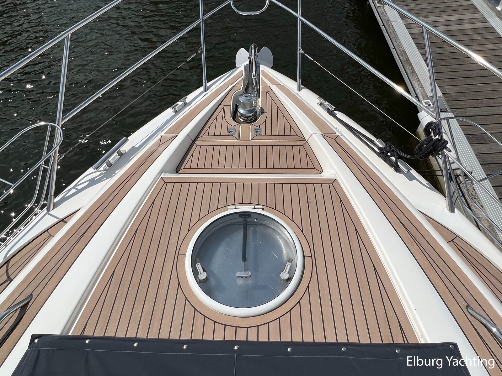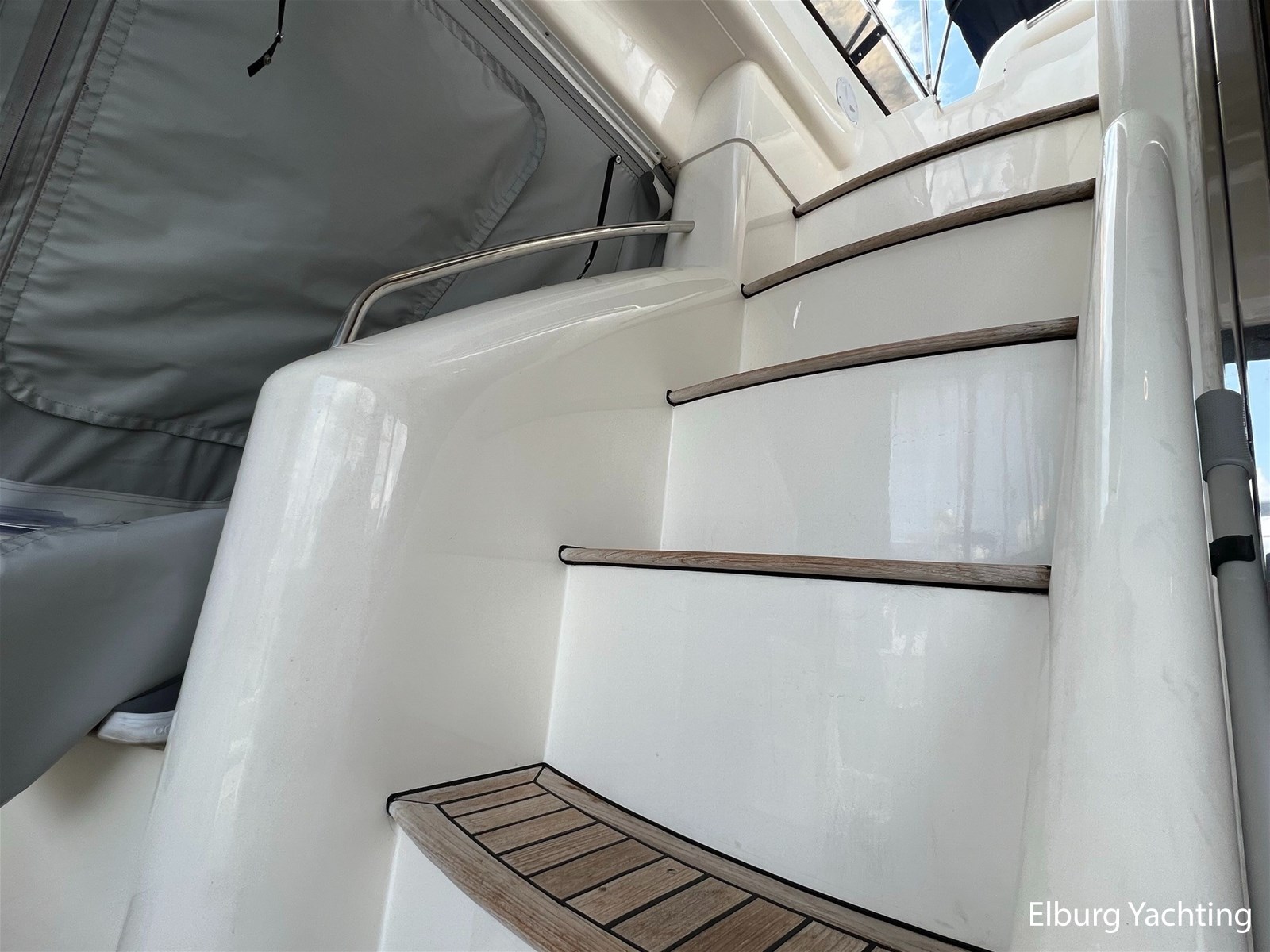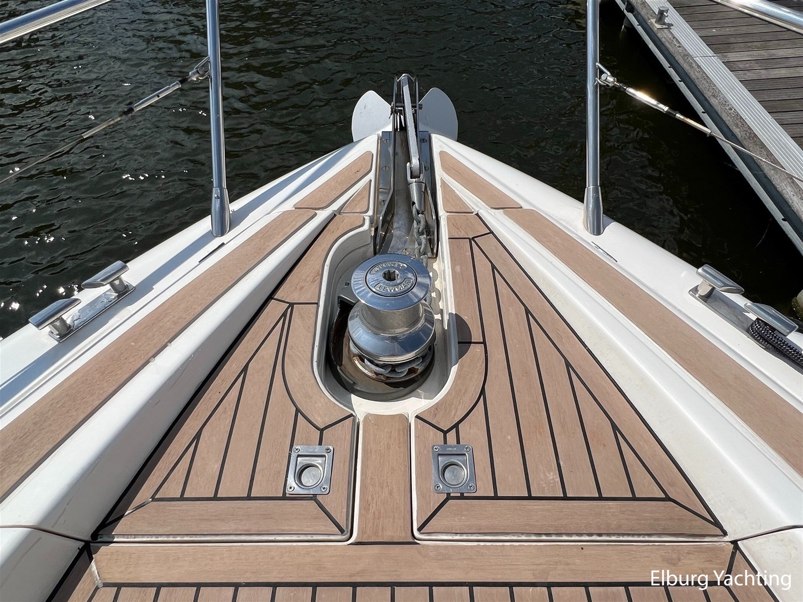 - Geïntegreerd met teak (dient vervangen te worden) + inklapbare r.v.s. zwemtrap